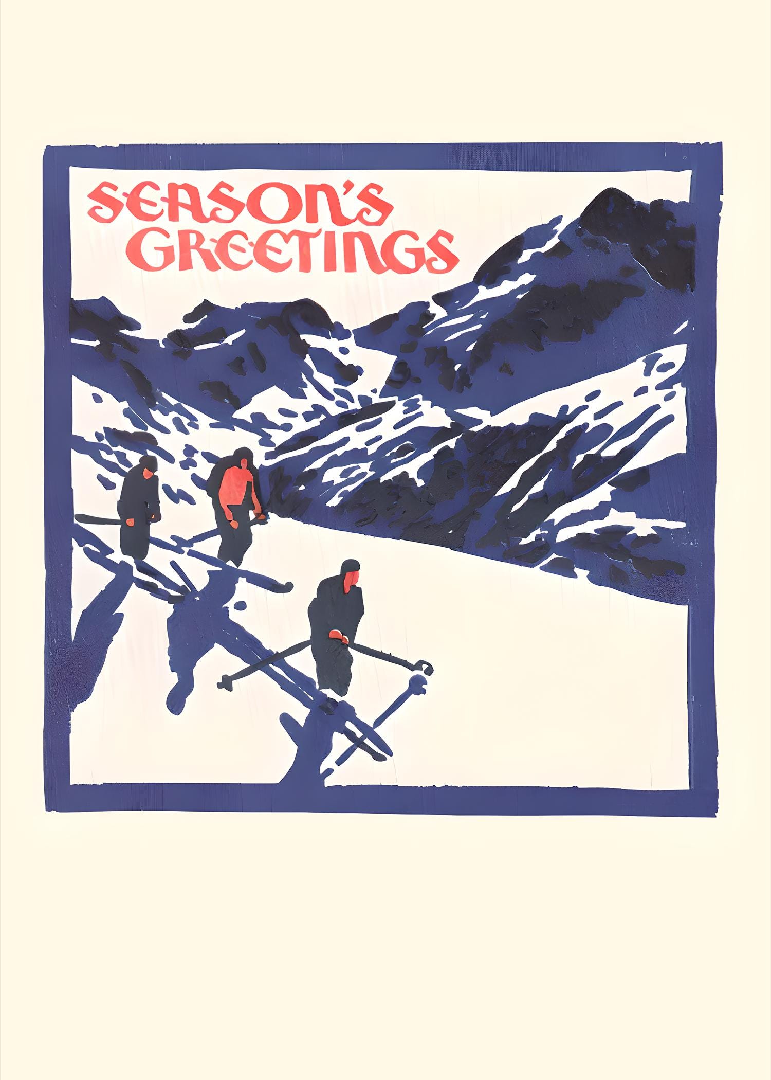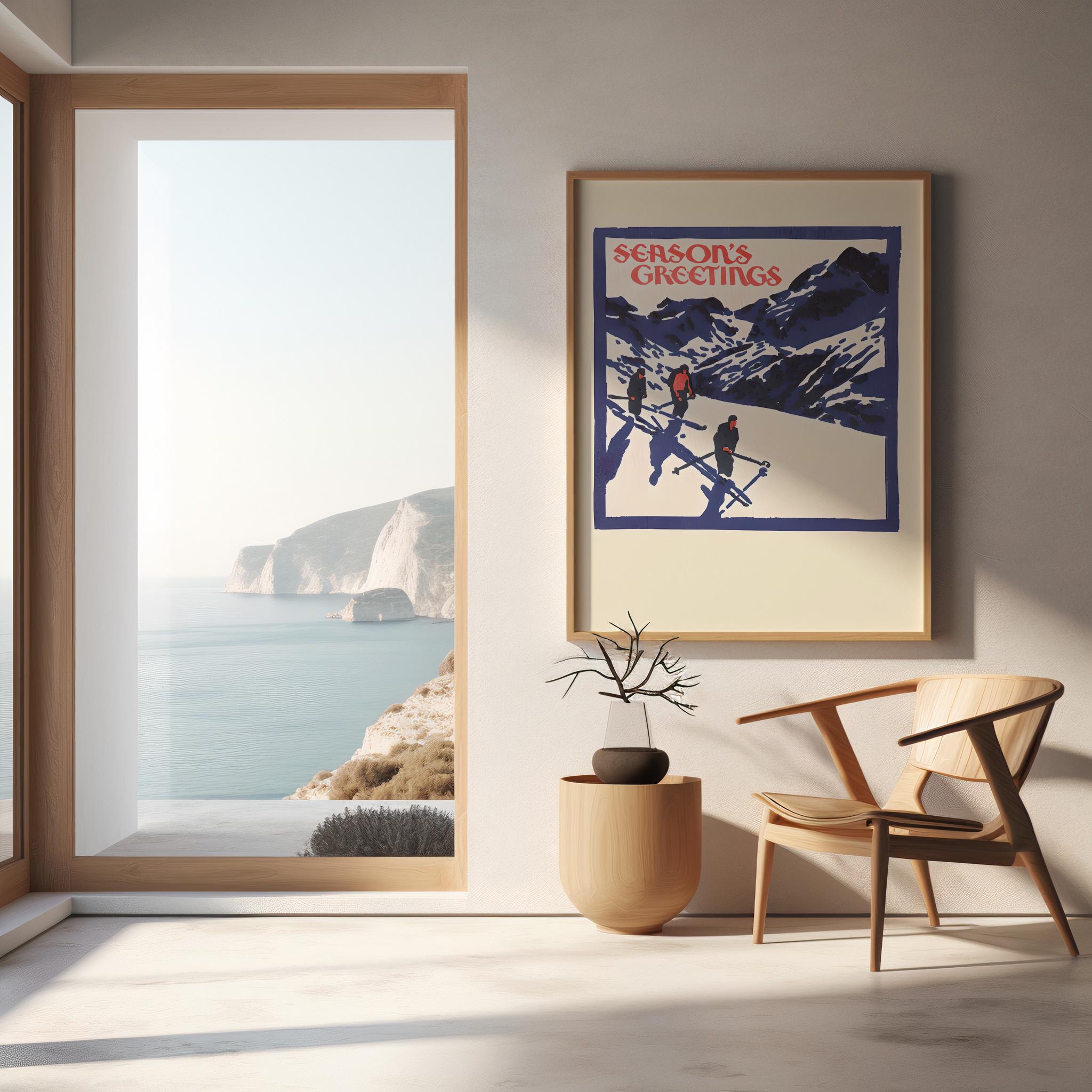 A bold vintage-inspired ski Christmas print featuring three skiers against deep blue alpine mountains, framed in a retro poster style with “Season’s Greetings” in classic red lettering. The nostalgic color palette and graphic illustration make this the perfect holiday statement piece for cabins, ski homes, chalets, and vintage Christmas lovers.