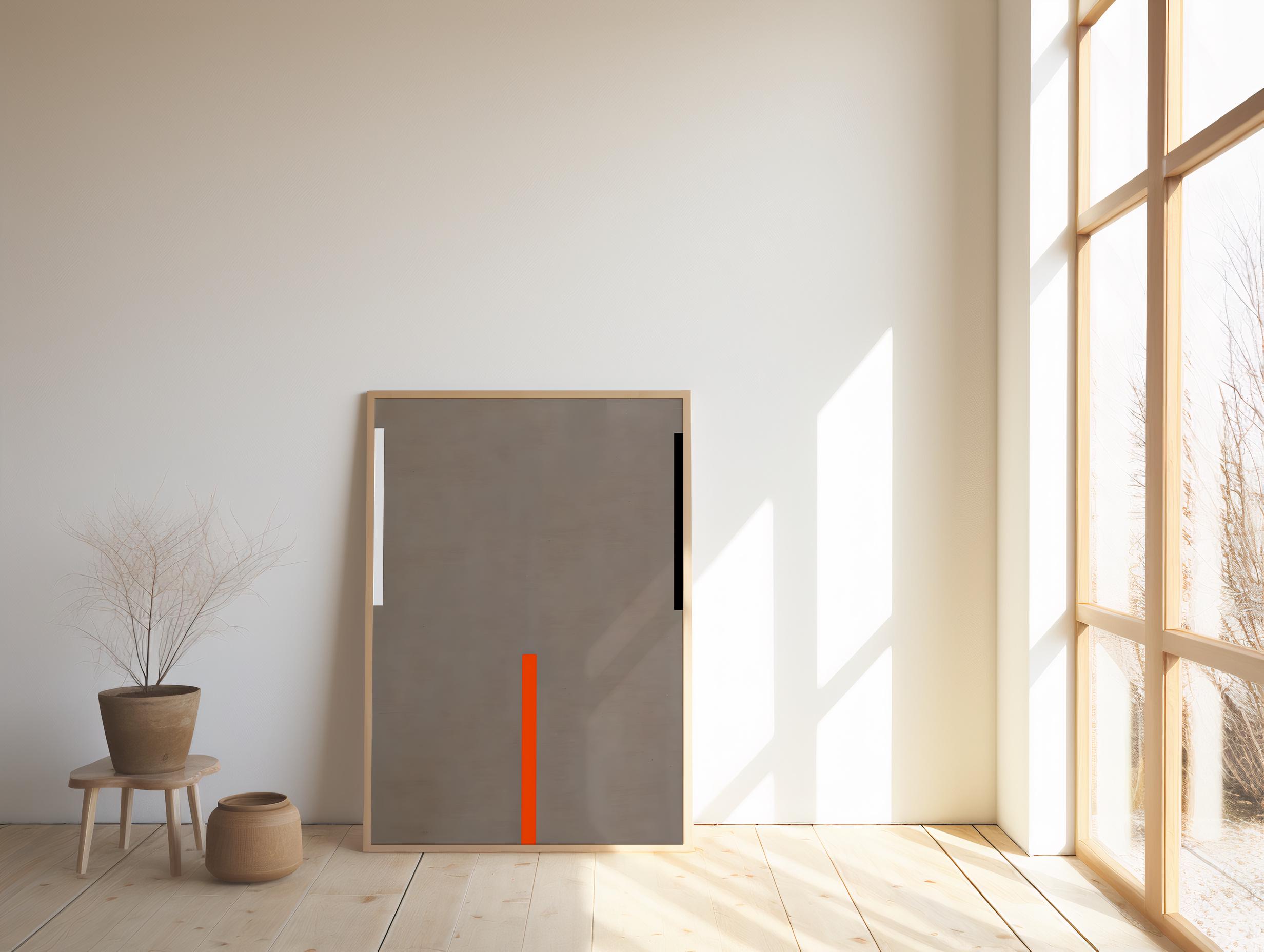 A clean minimalist abstract print featuring a neutral textured background with a single bold orange vertical line and contrasting black + white side accents. This modern, architectural-style composition adds sophistication and balance to contemporary, Japandi, and organic modern interiors. Perfect as a statement piece or part of a curated gallery wall.