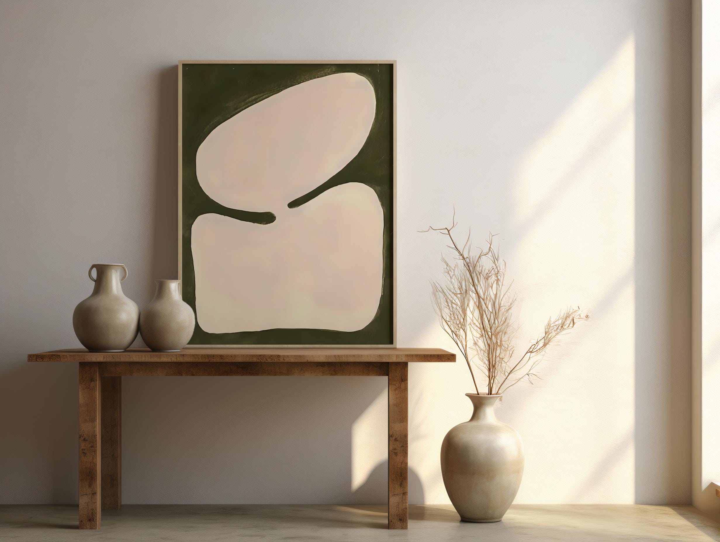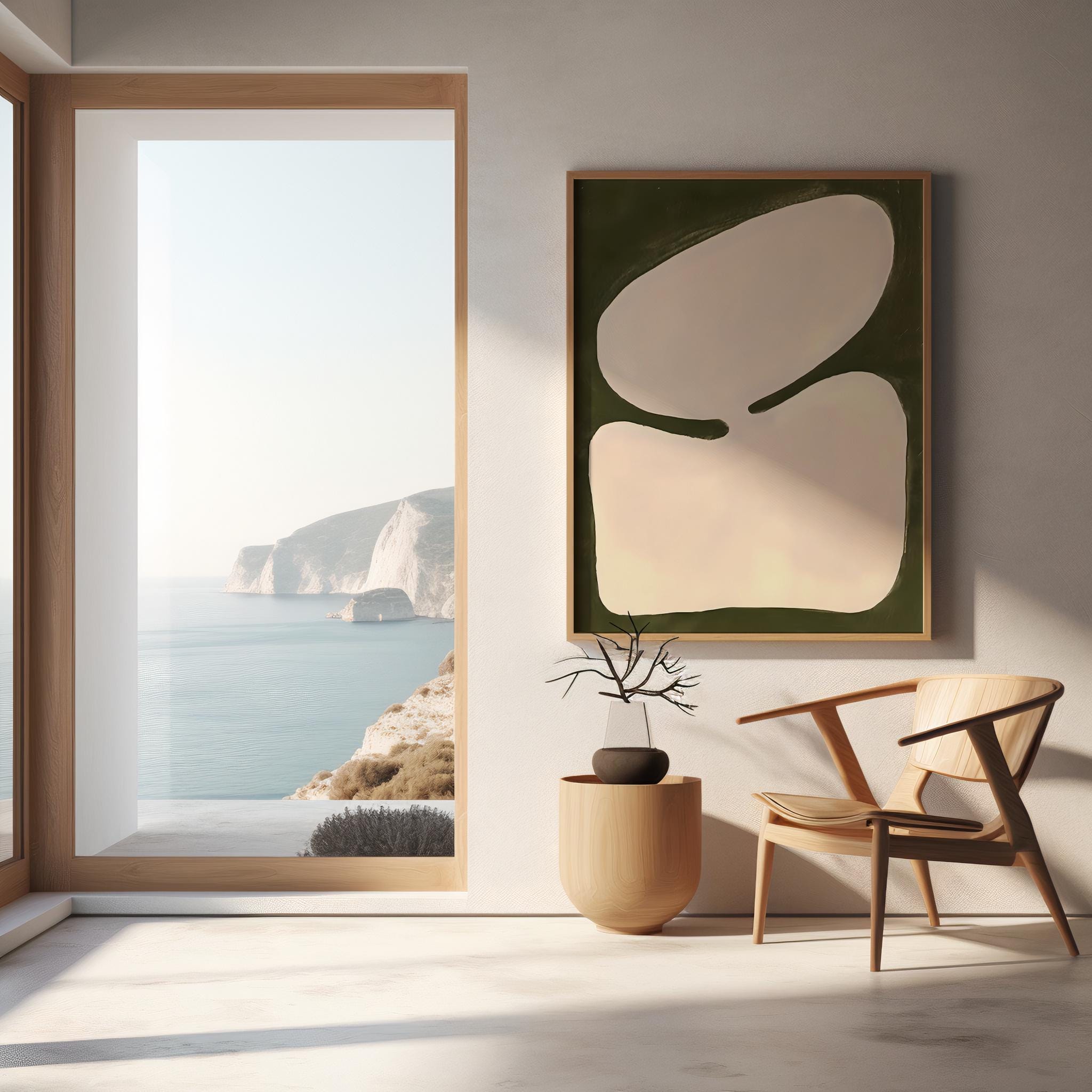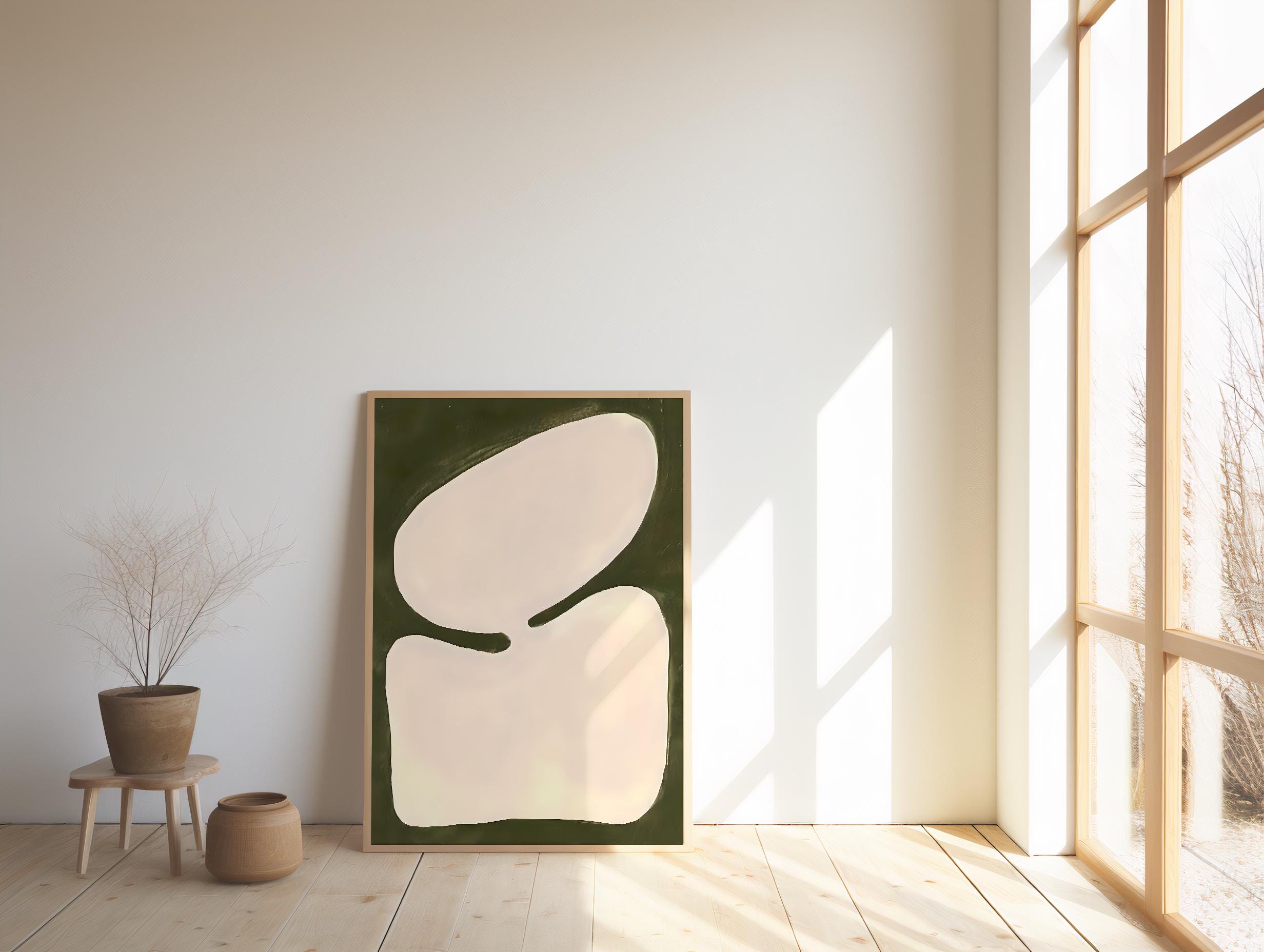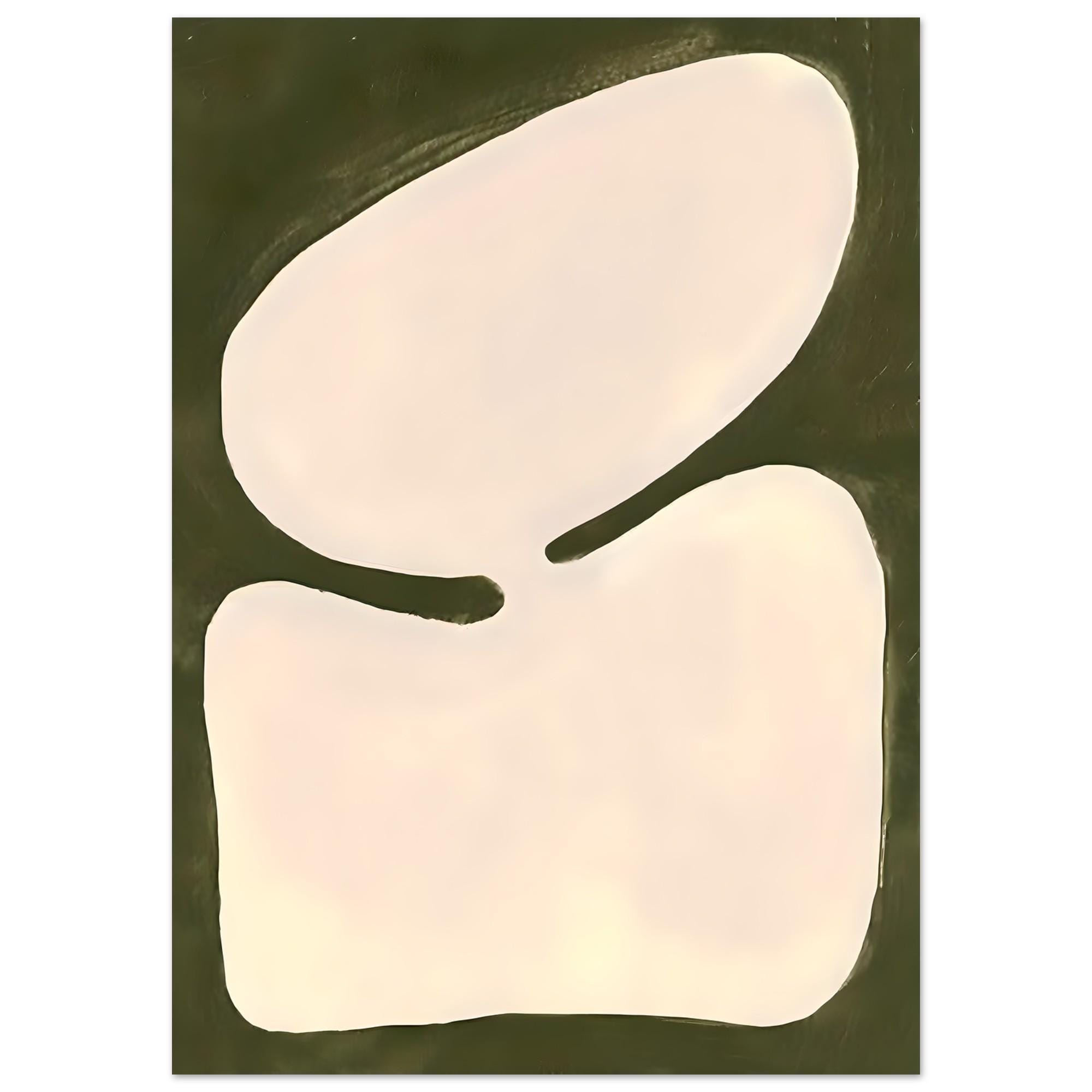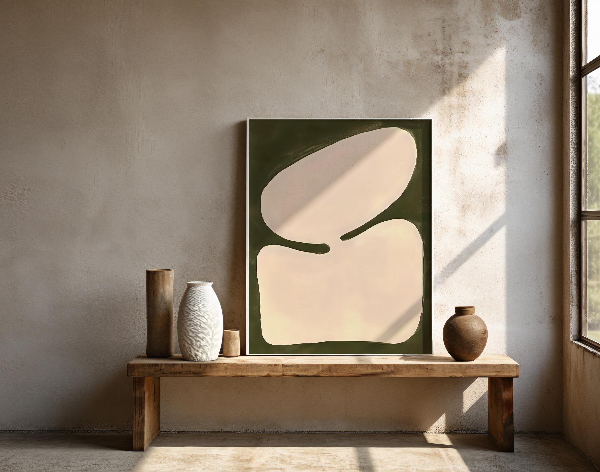 This minimalist abstract fine art poster features soft cream shapes outlined by deep earthy green, creating a clean organic composition that fits perfectly into Japandi, modern, and warm neutral interiors. The simplicity and balance of the forms make it ideal for living rooms, bedrooms, or curated gallery wall sets.
