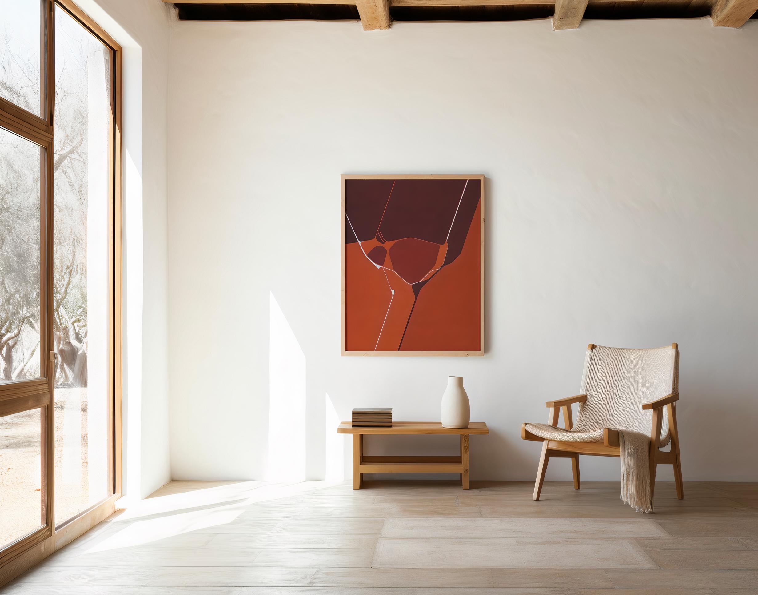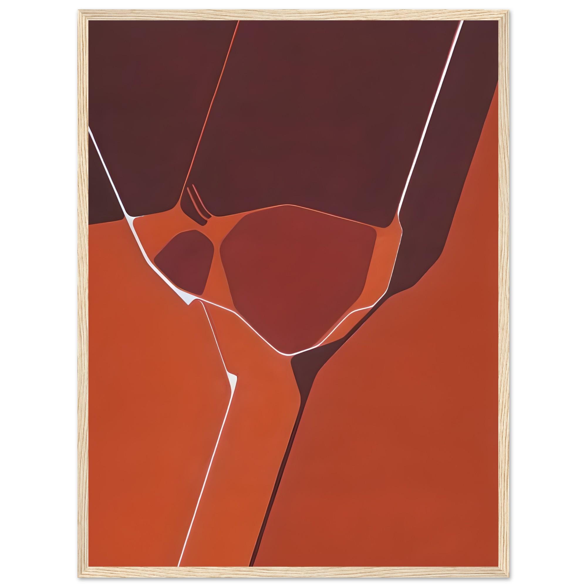 This bold framed poster showcases a modern geometric abstract design in deep red, rust, and terracotta tones, accented with crisp white linework for a striking contemporary look. The rich warm palette creates an eye-catching statement piece perfect for living rooms, offices, bedrooms, or gallery-style walls.