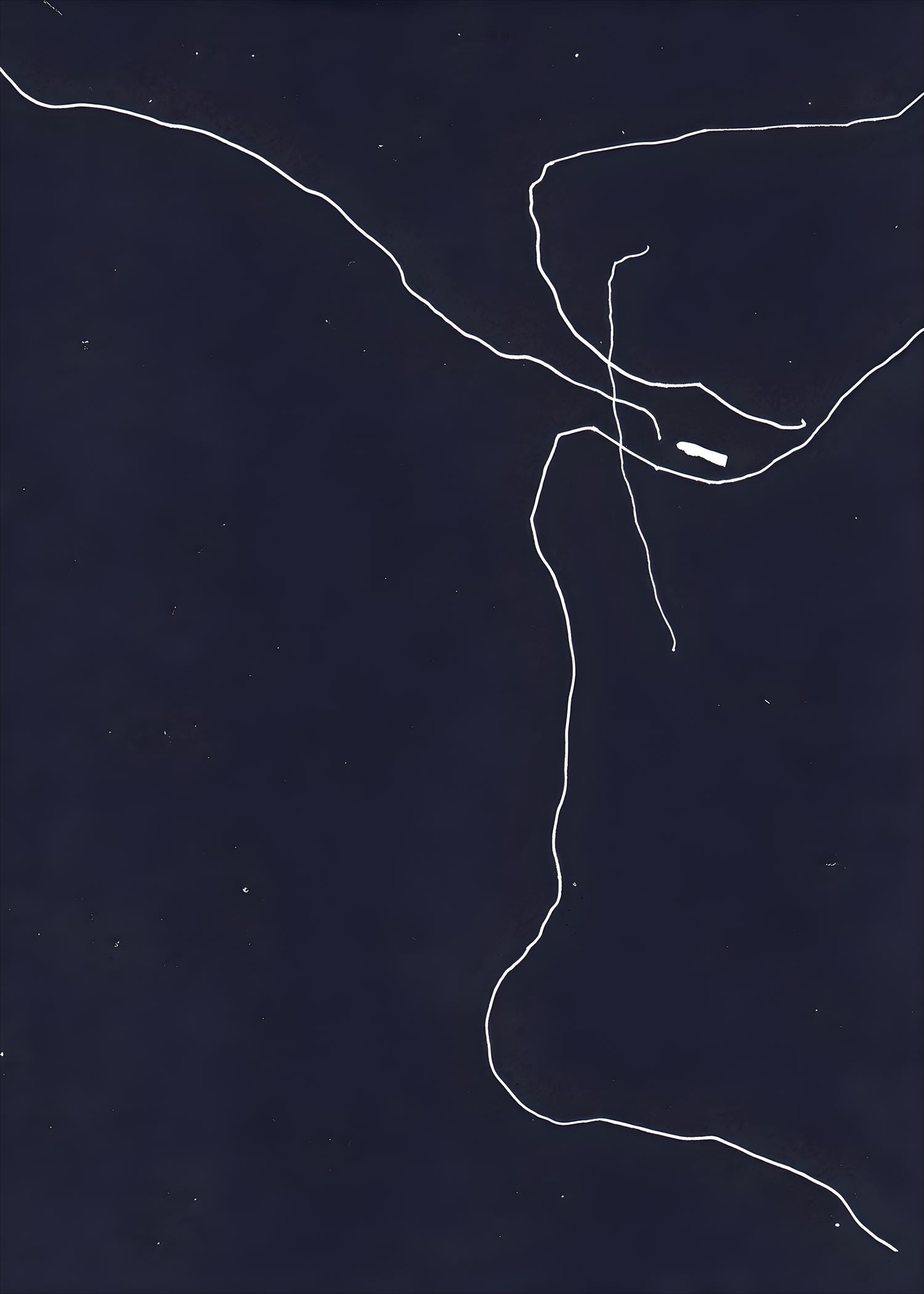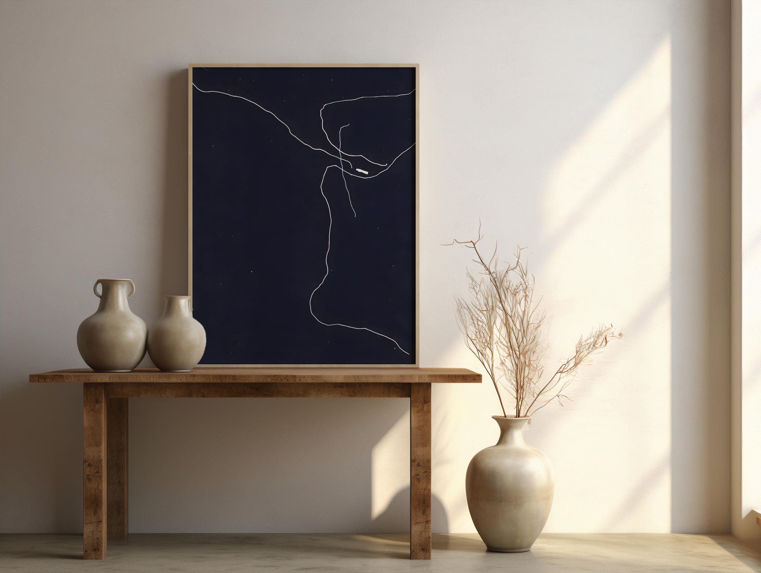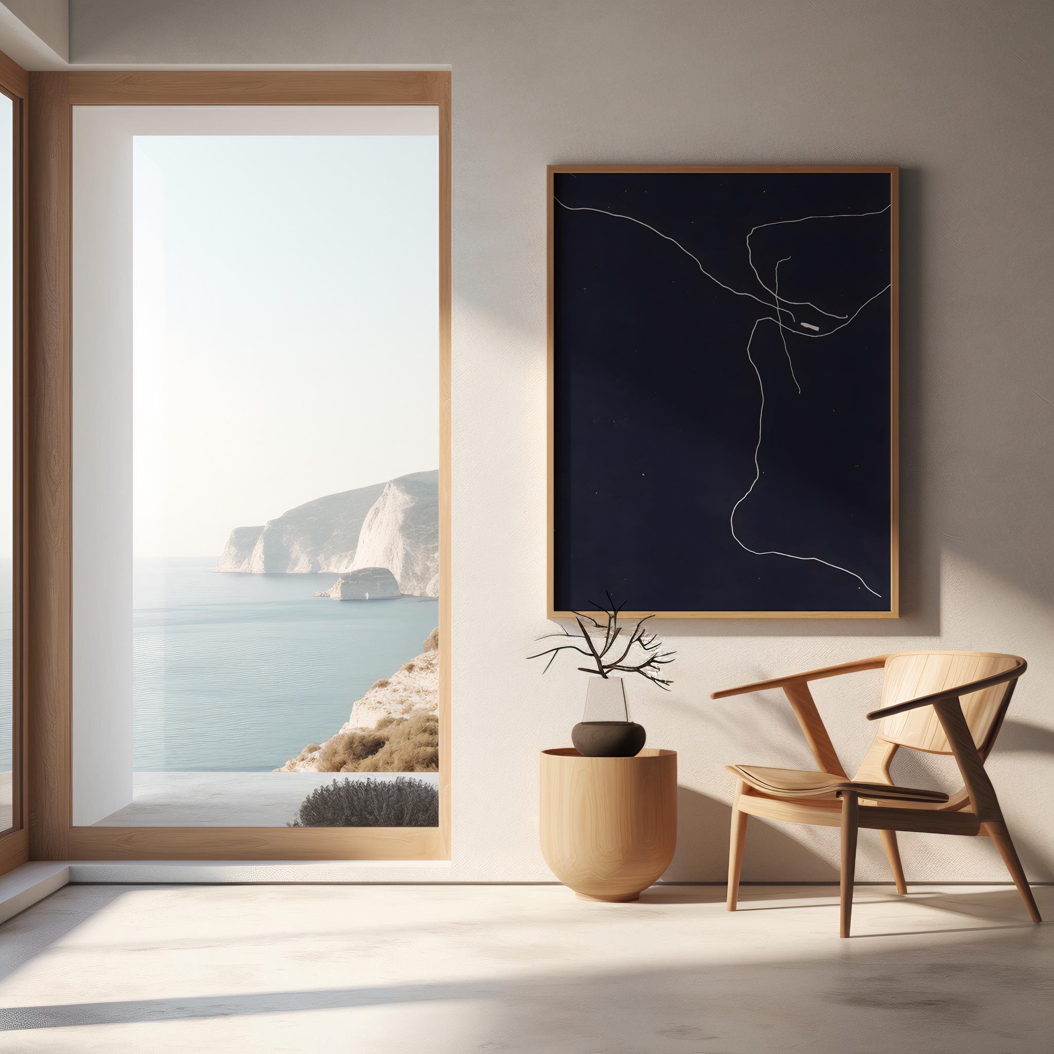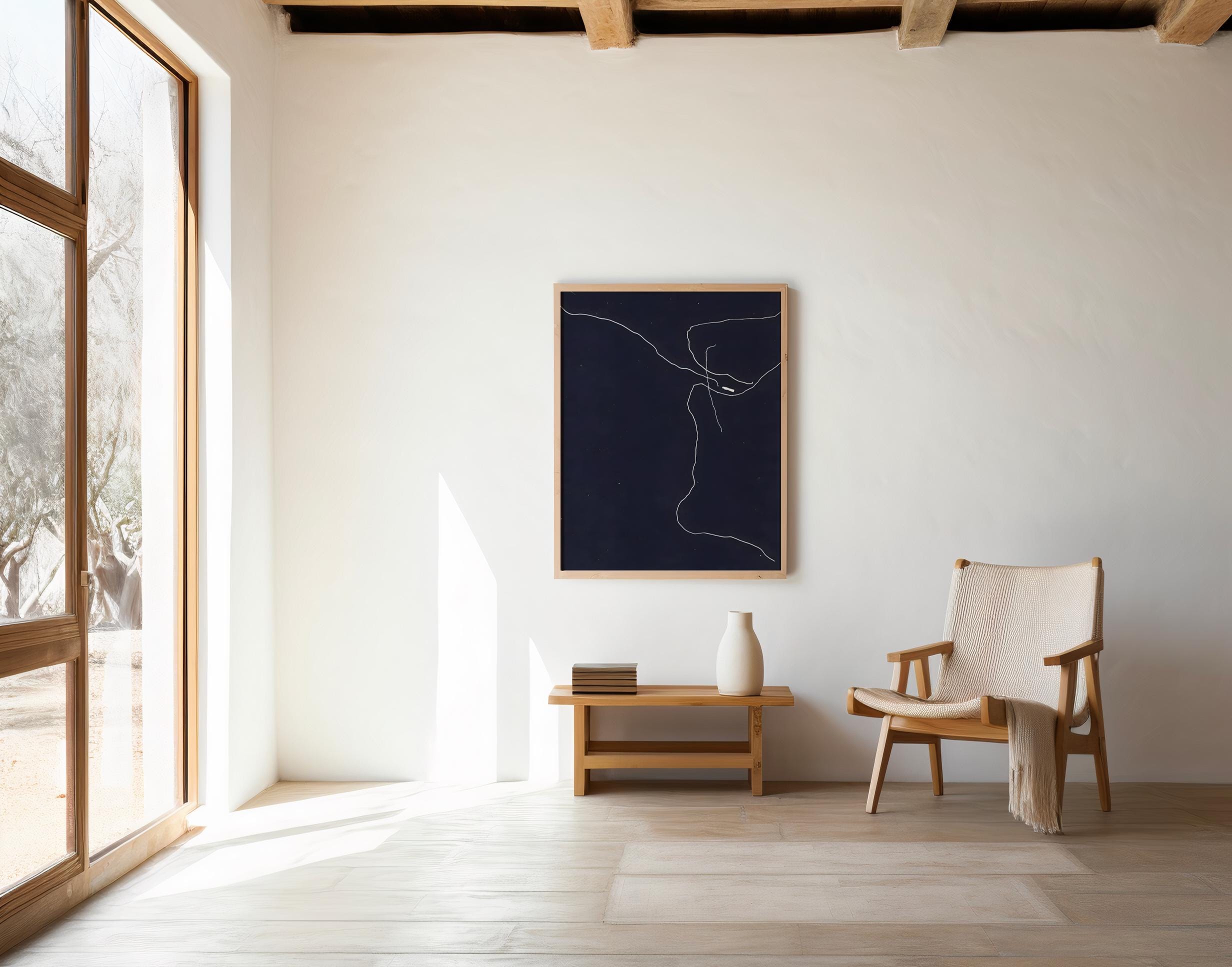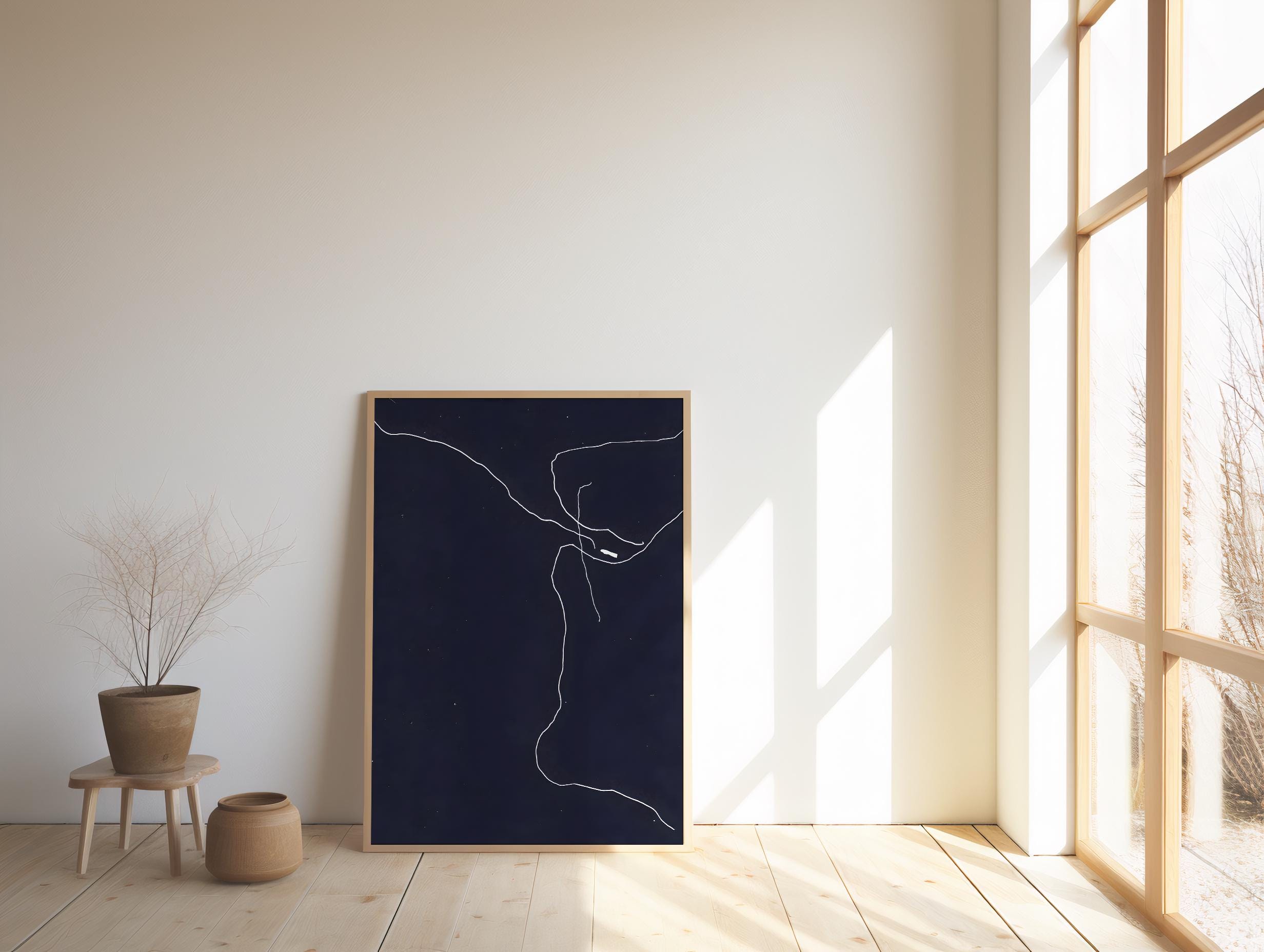 This minimalist digital artwork features a deep navy background with flowing white linework that creates a calm, modern, abstract composition. The simplicity and contrast make it perfect for contemporary interiors, bedrooms, offices, and gallery-wall pairings. Its clean, refined aesthetic adds depth without overwhelming the space.