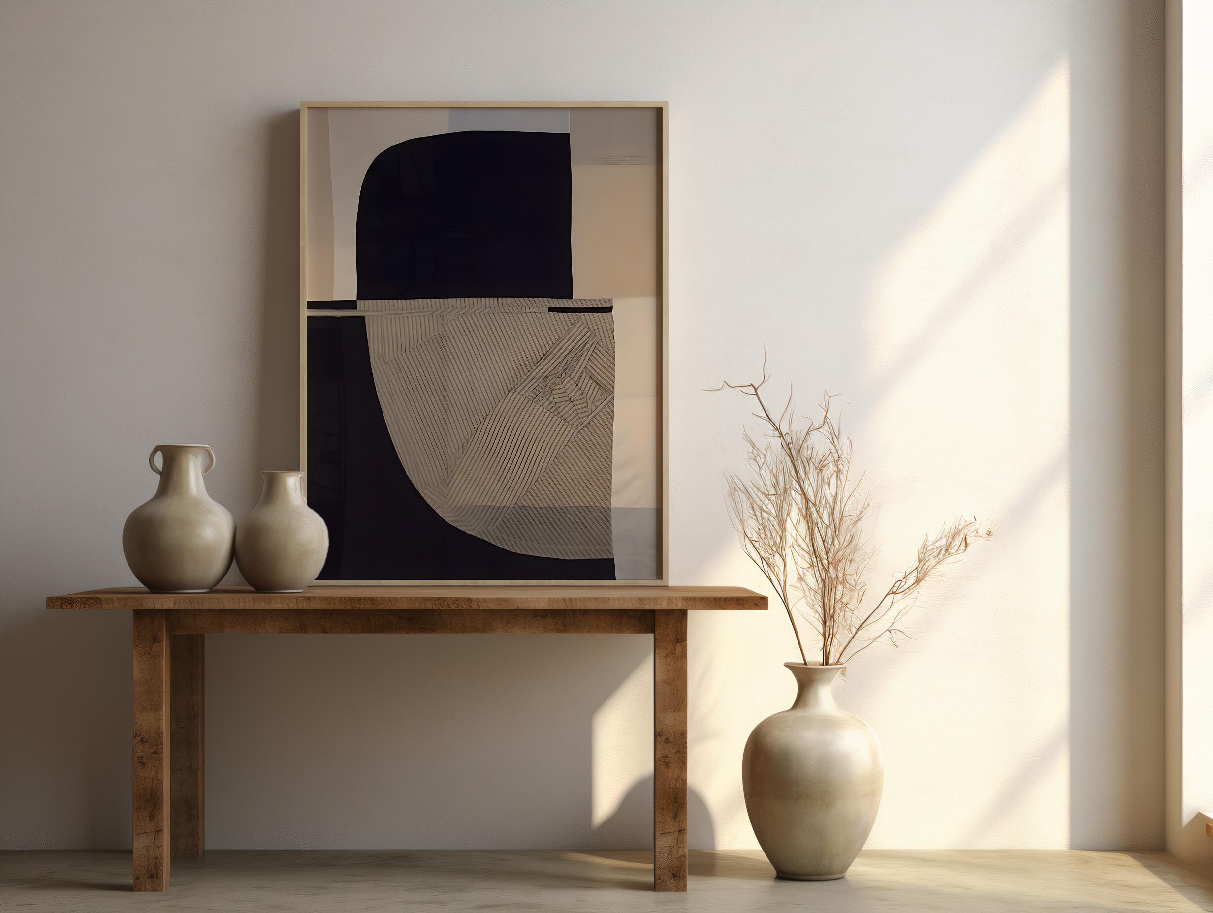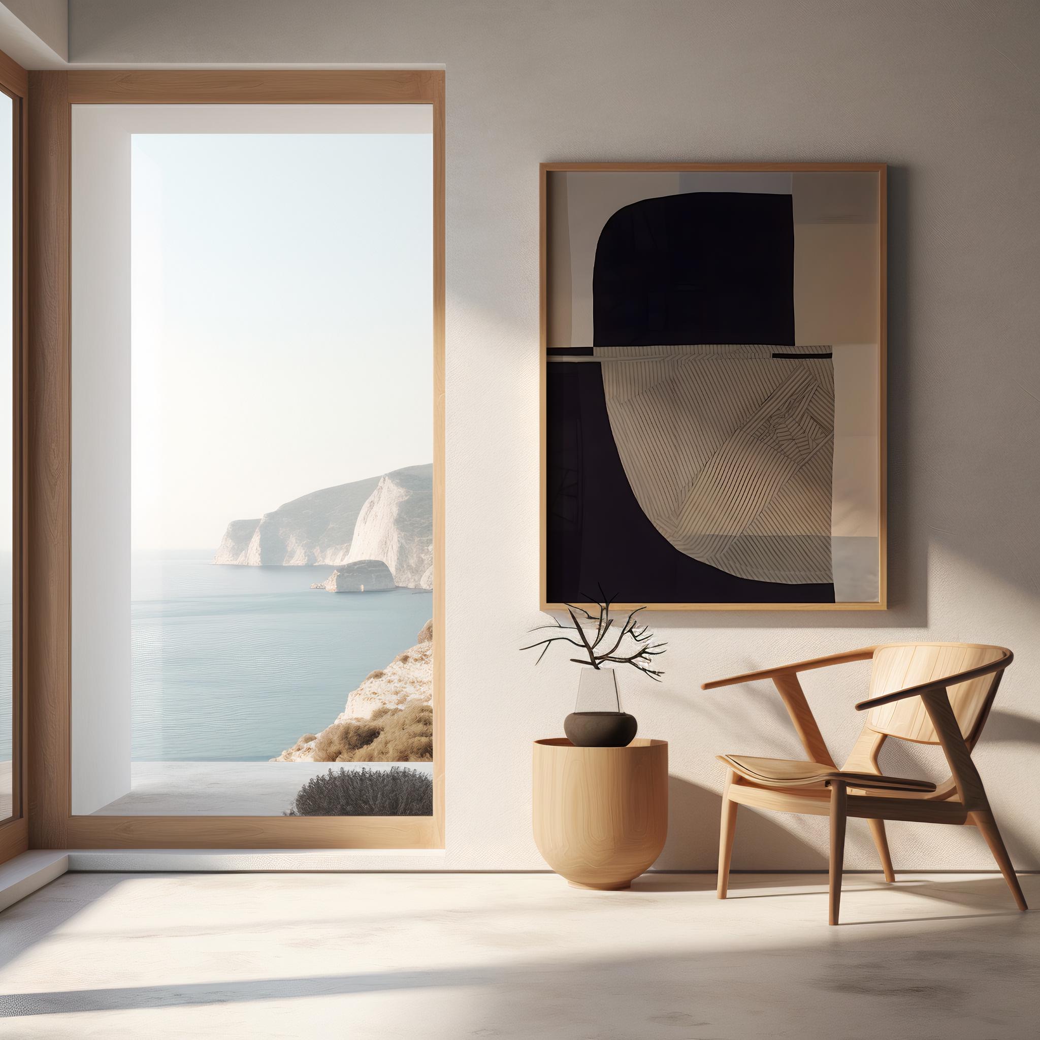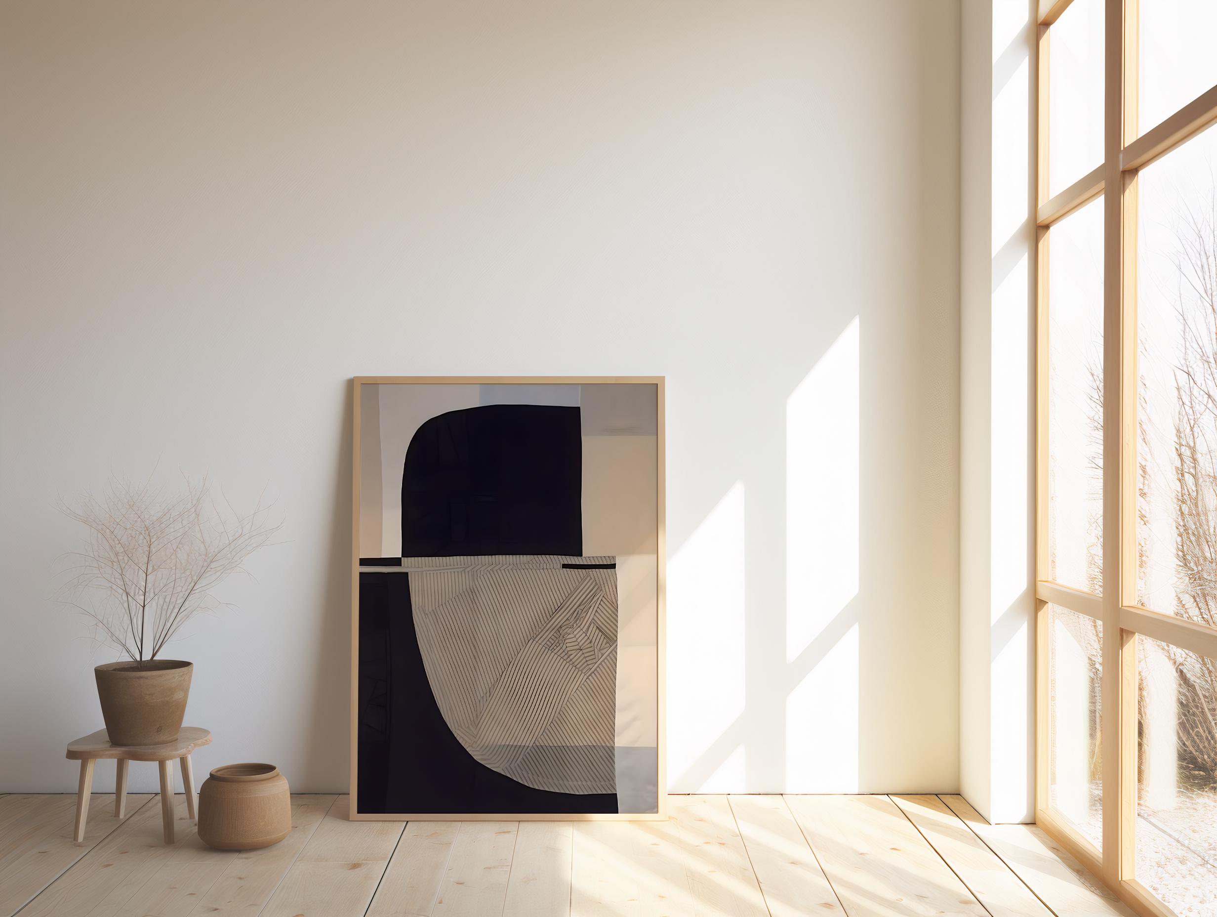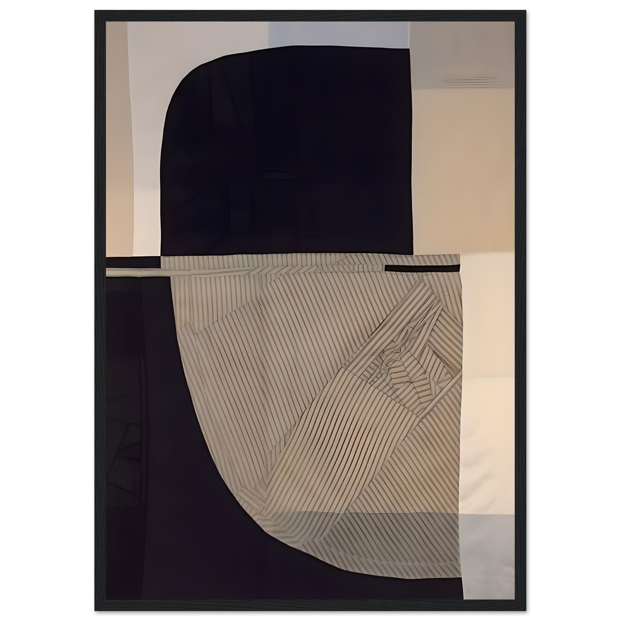 Elevate your space with this geometric navy and beige abstract framed poster. Clean lines, layered shapes, and a refined neutral palette create a sophisticated, architectural aesthetic. Printed on 200gsm museum-quality matte paper and framed in a sleek pine wood frame with shatterproof plexiglass, this piece arrives ready to hang and instantly enhances any modern interior.