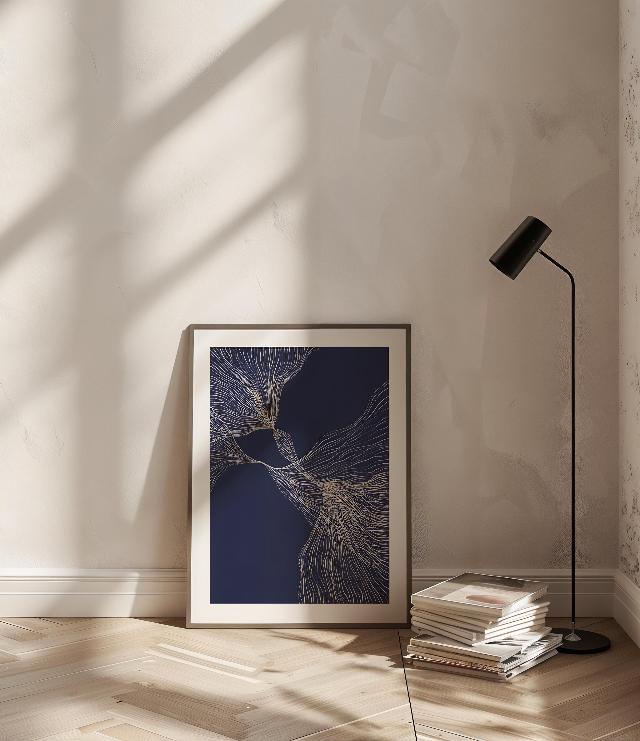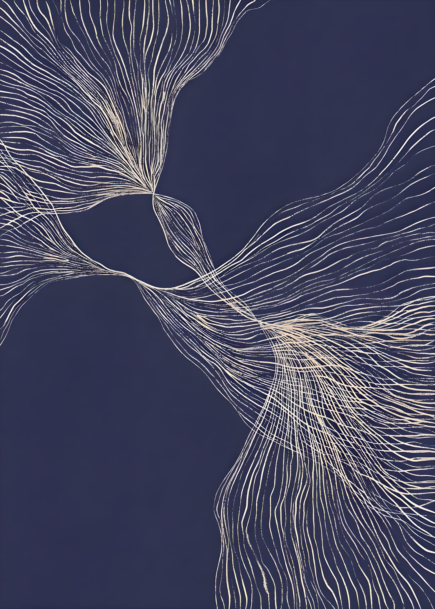 This navy abstract line-flow artwork brings modern movement and elegance into any space. The fluid, hand-drawn lines create a striking contrast against the deep navy background, making this a bold yet calming statement piece for contemporary, minimalist, and organic modern interiors.