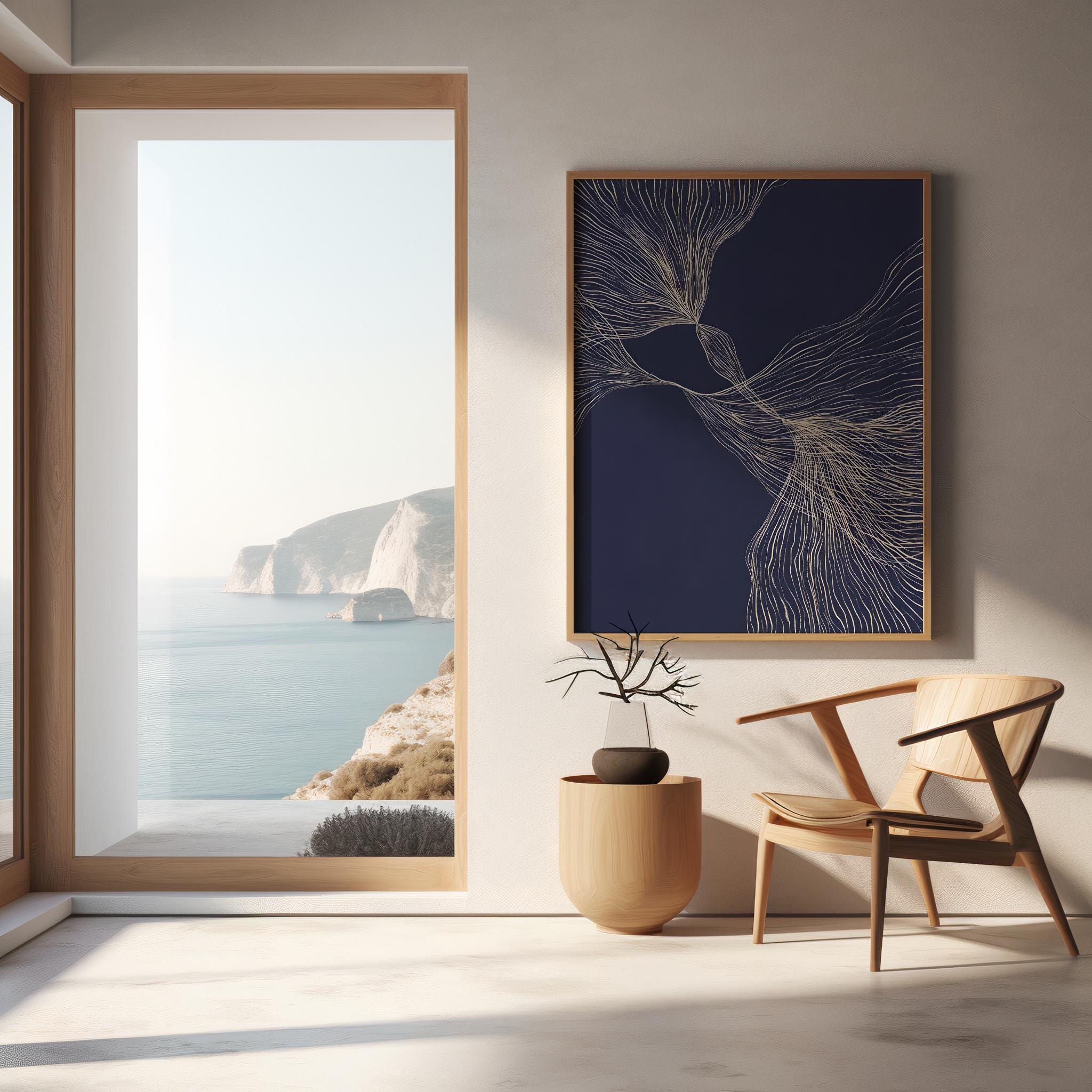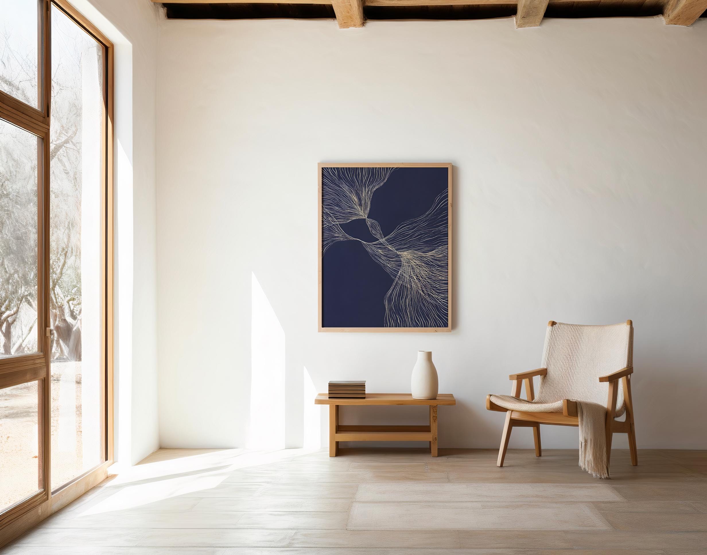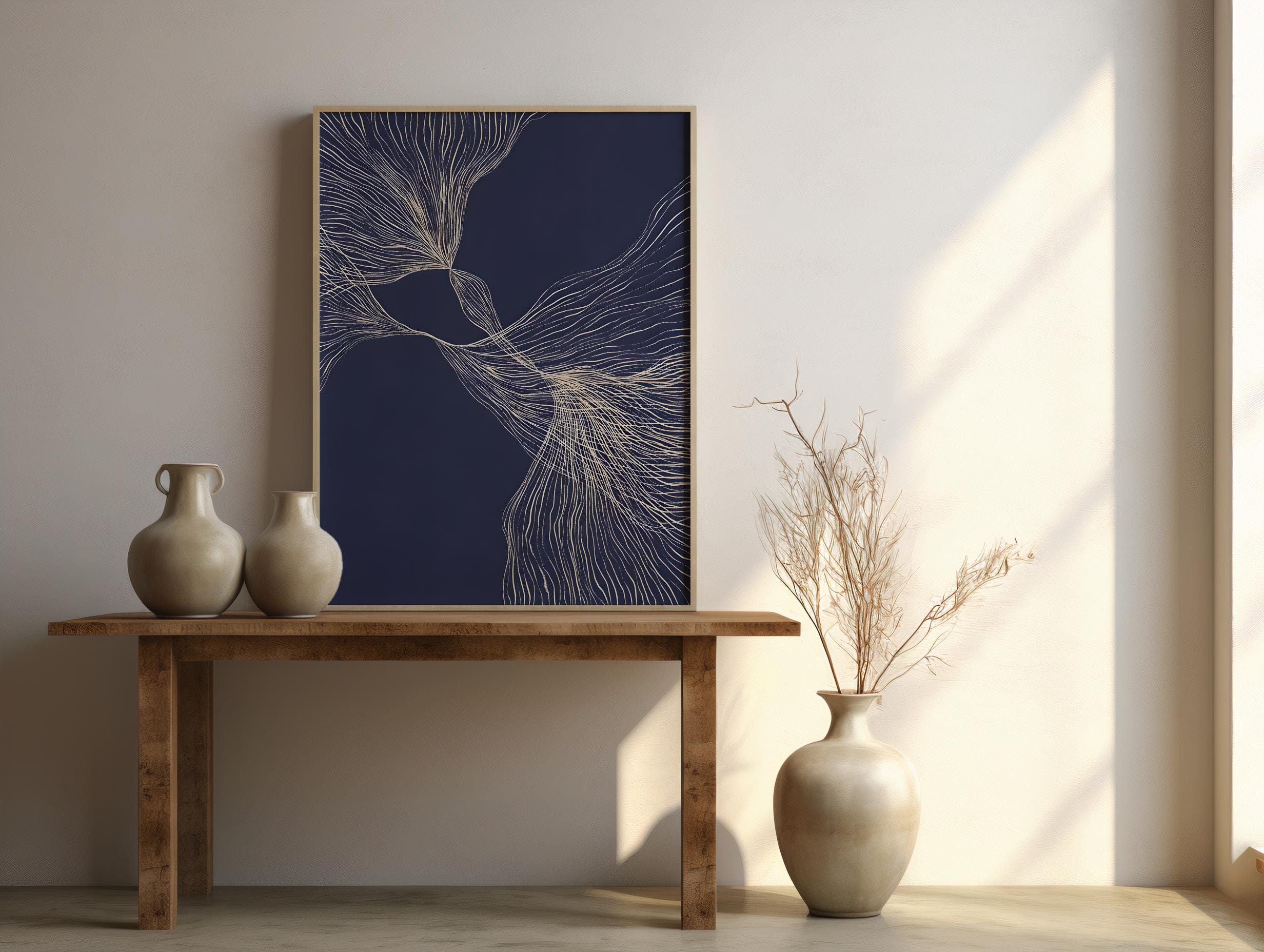Elevate your space with this modern navy abstract line-flow artwork, featuring soft organic movement across a deep, rich background. The elegant contrast of flowing neutral lines and bold color creates a striking contemporary statement piece.