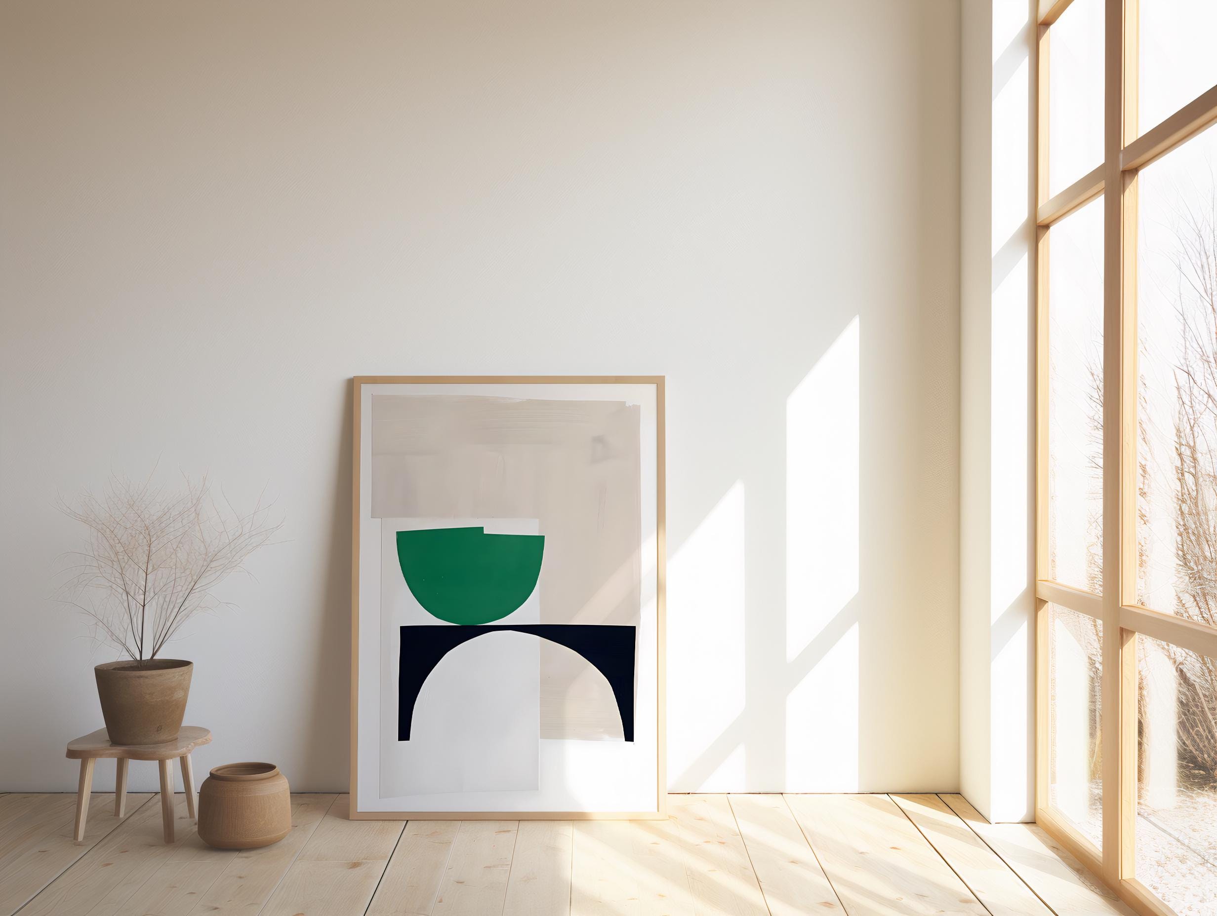 Abstract Geometric Wall Art | Green Neutral Modern Shapes | Framed Poster