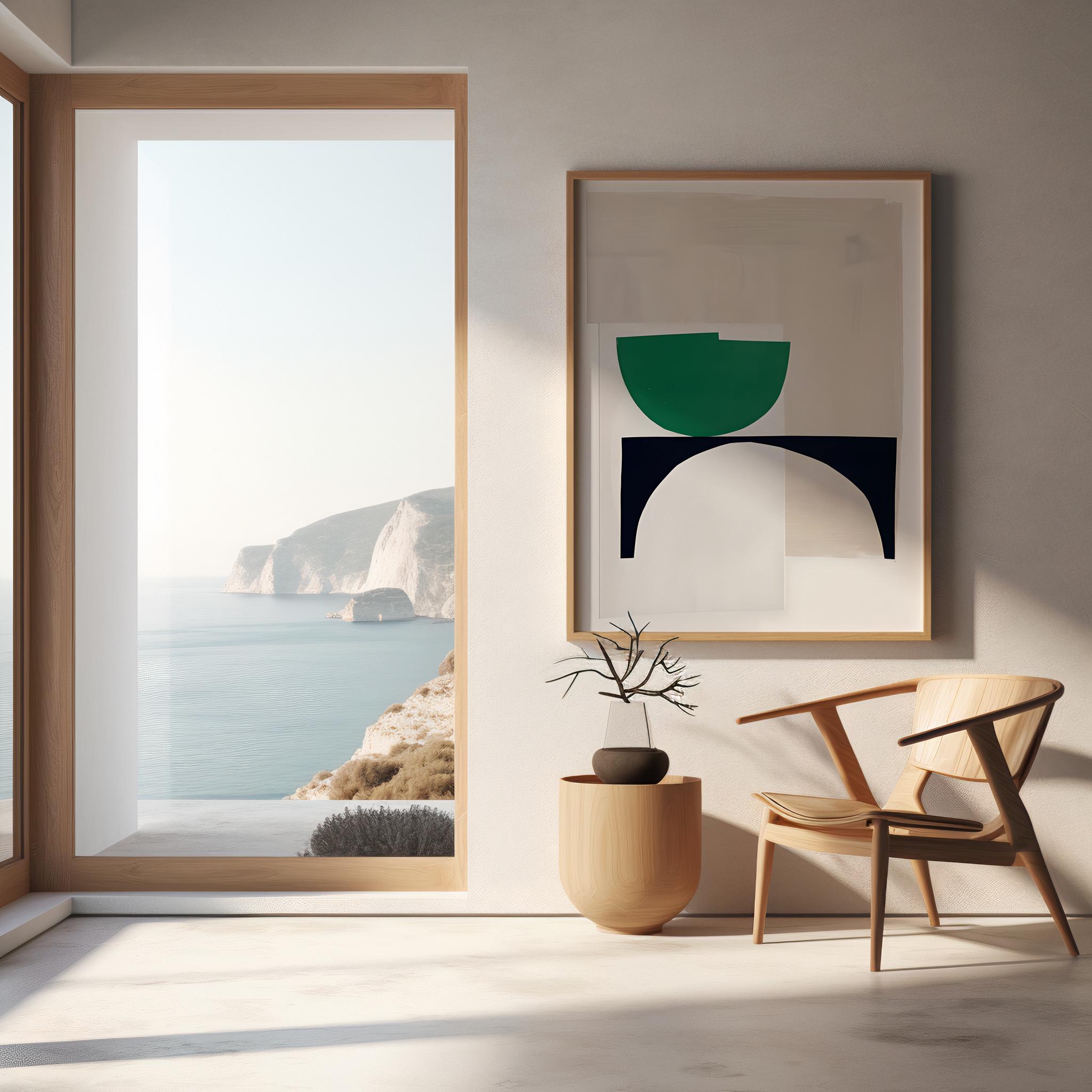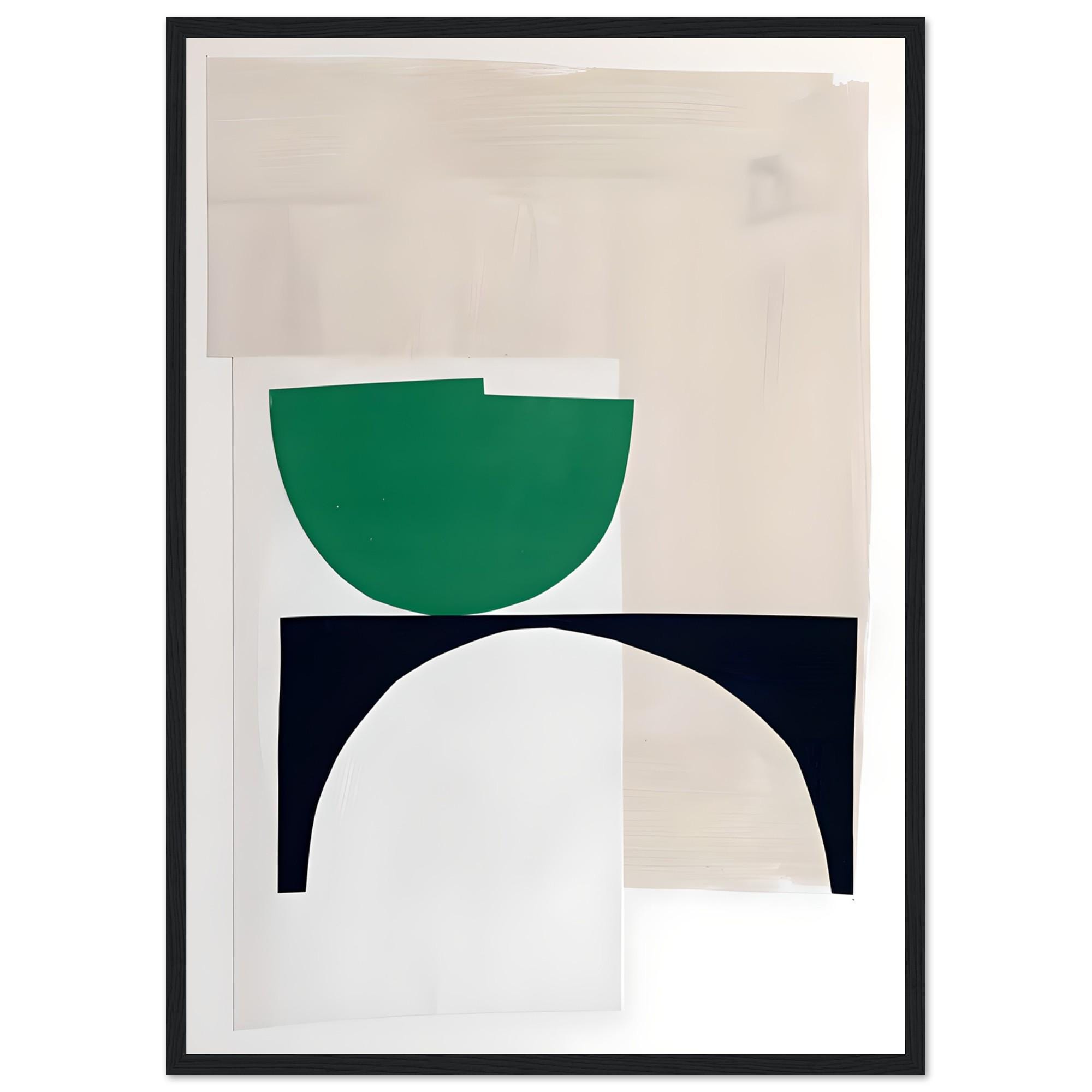 This abstract geometric framed poster features layered arches and sculptural curves in deep green, soft beige, and neutral tones. The composition feels architectural yet organic—clean, modern, and calming—making it a refined statement piece for contemporary, minimalist, and organic modern interiors.