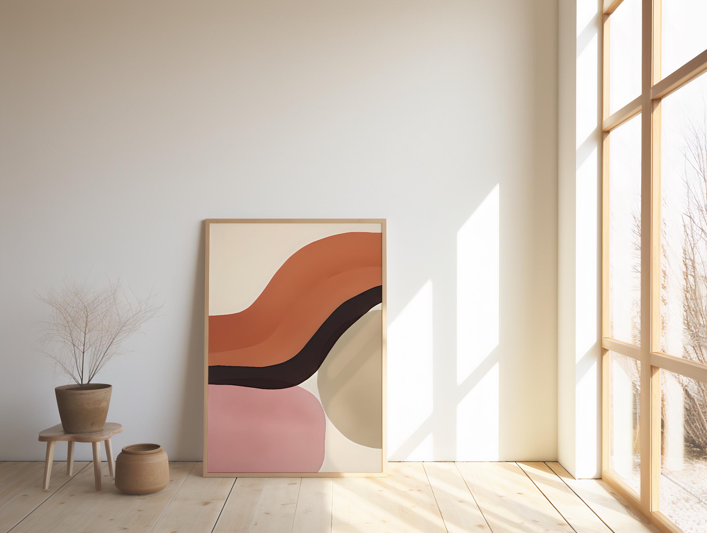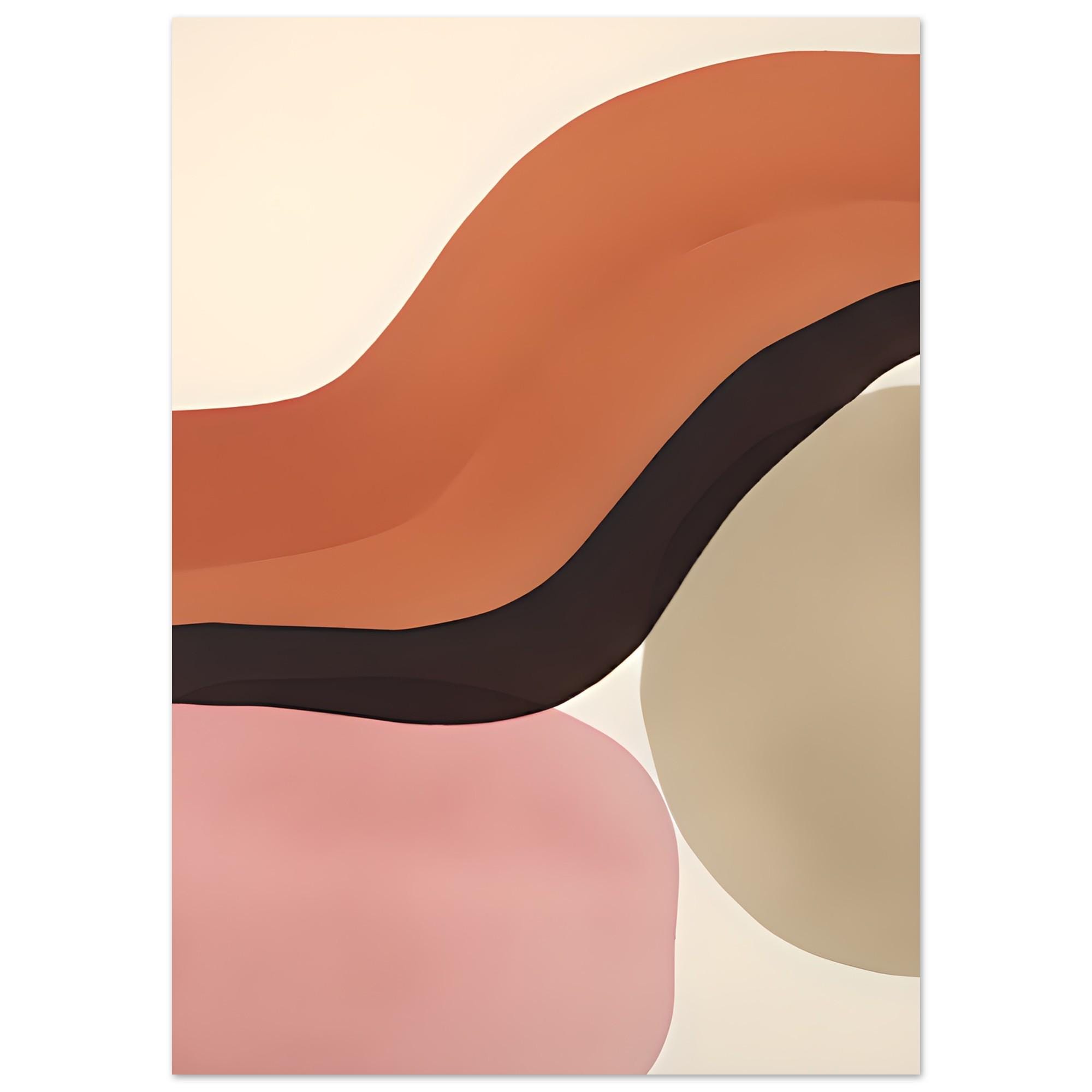 This abstract fine art poster features flowing organic forms layered in warm terracotta, soft blush, deep brown, and sandy neutral tones. The smooth curves and balanced color transitions create a grounded yet airy composition that feels modern, calming, and refined.