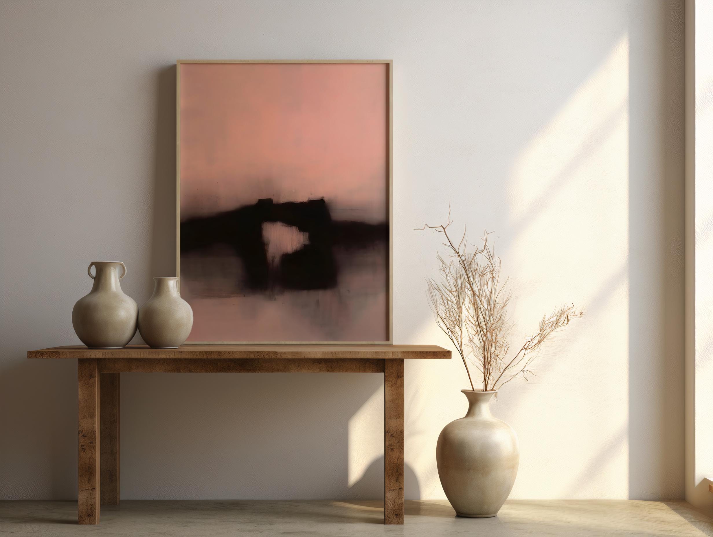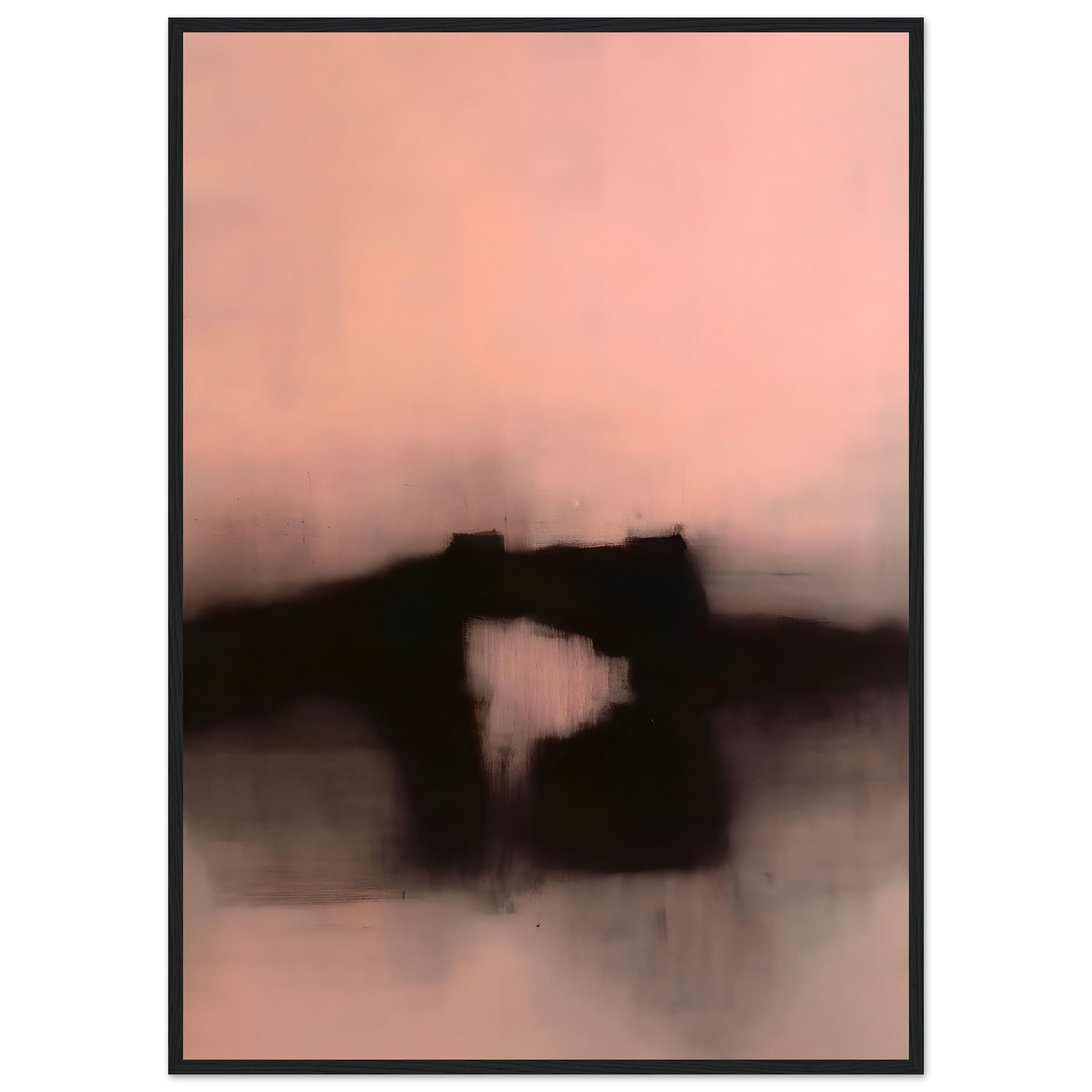 This abstract framed poster features soft layers of blush, warm beige, and deep charcoal tones, creating a calm, atmospheric composition with a minimalist landscape feel. The blurred forms and painterly texture give the piece a moody yet refined presence—subtle, modern, and emotionally grounding.