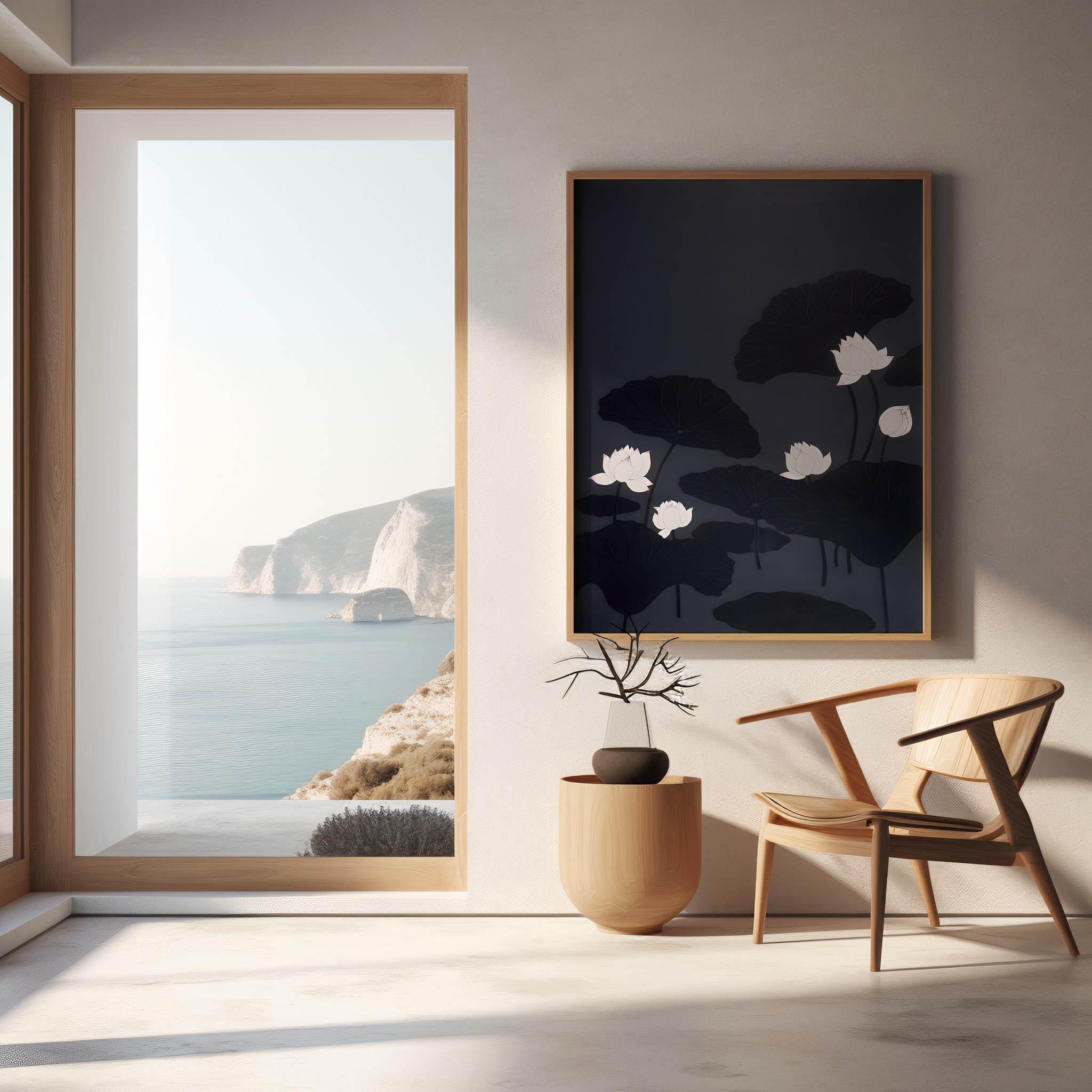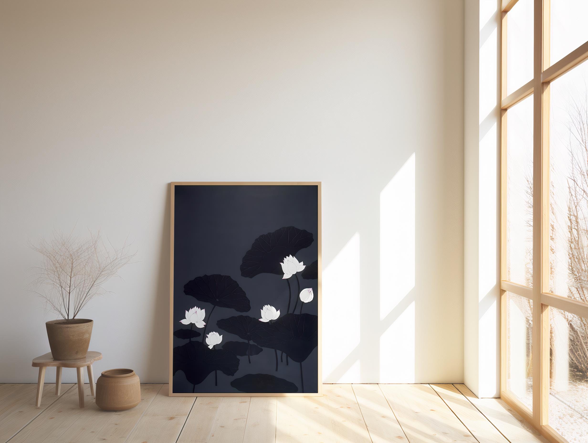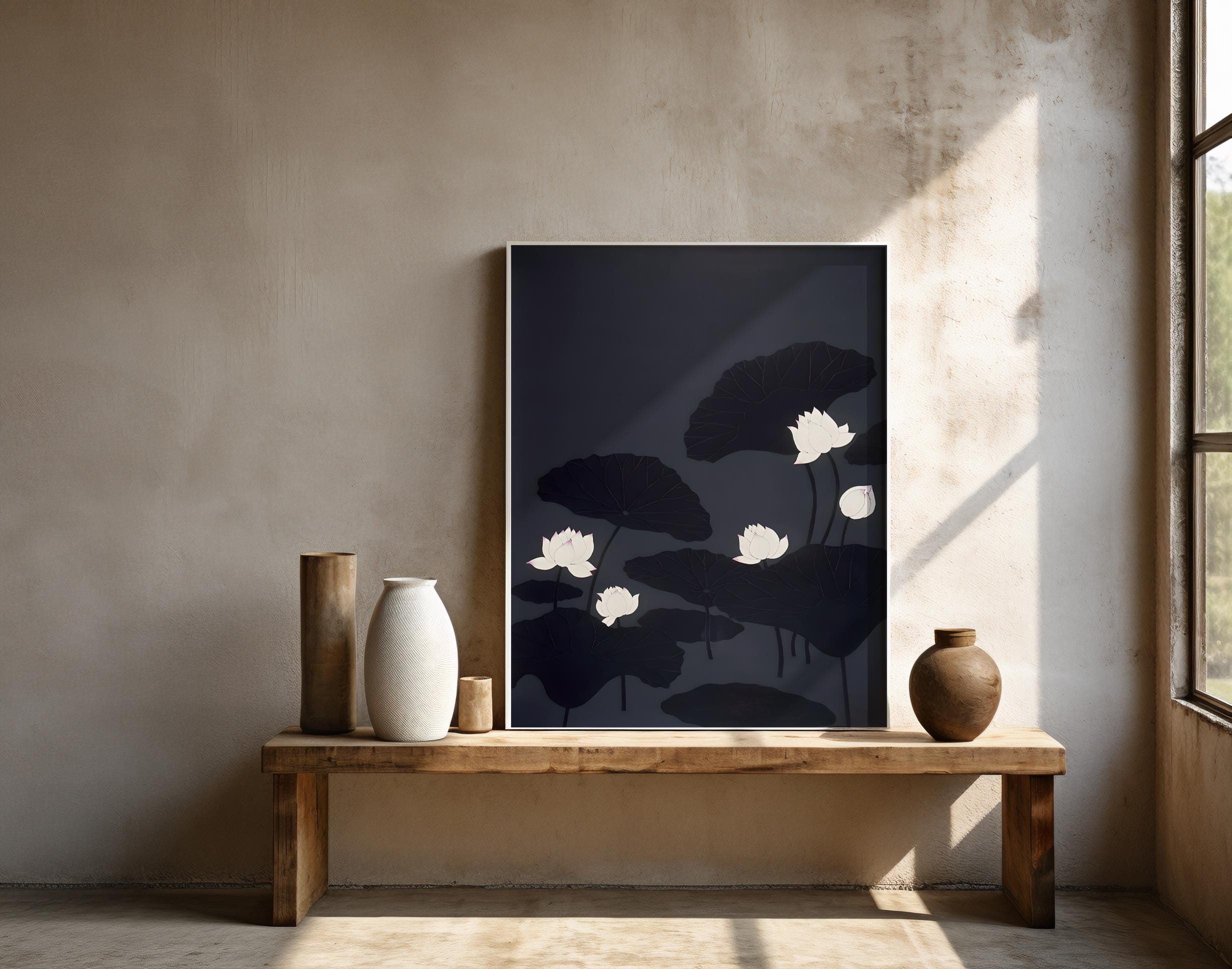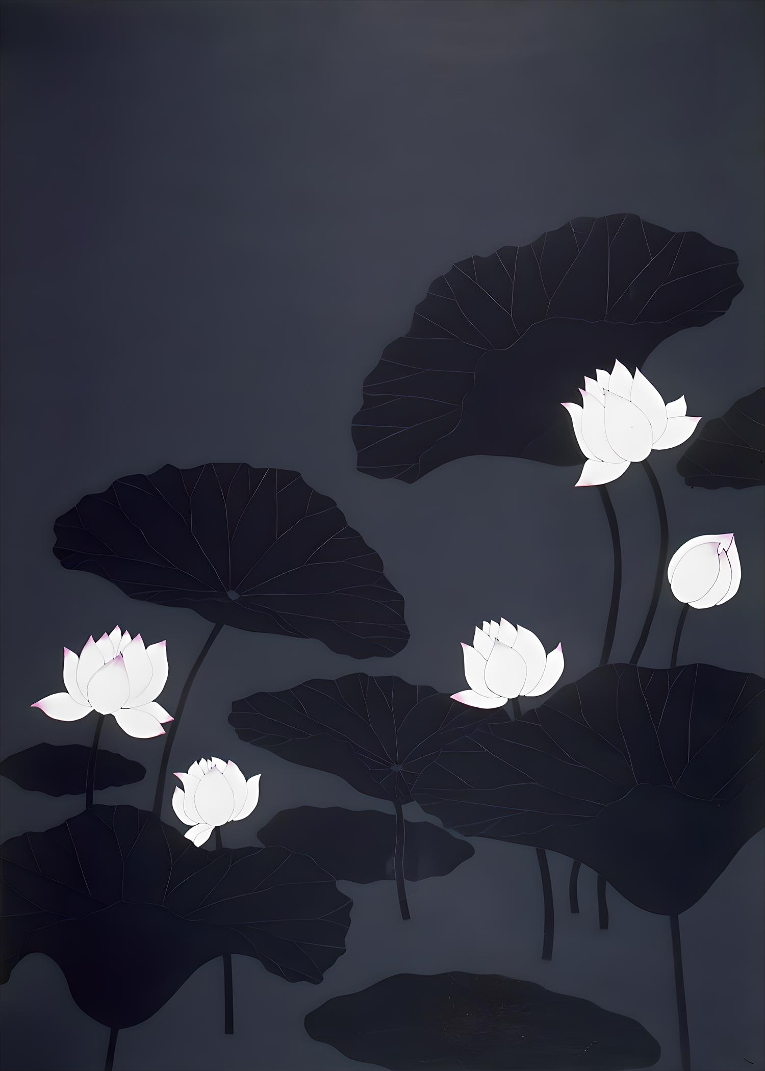 A moody botanical composition inspired by Japanese ink painting. Soft white lotus blooms float against deep charcoal leaves, creating a calm, atmospheric piece with strong contrast and elegant balance.