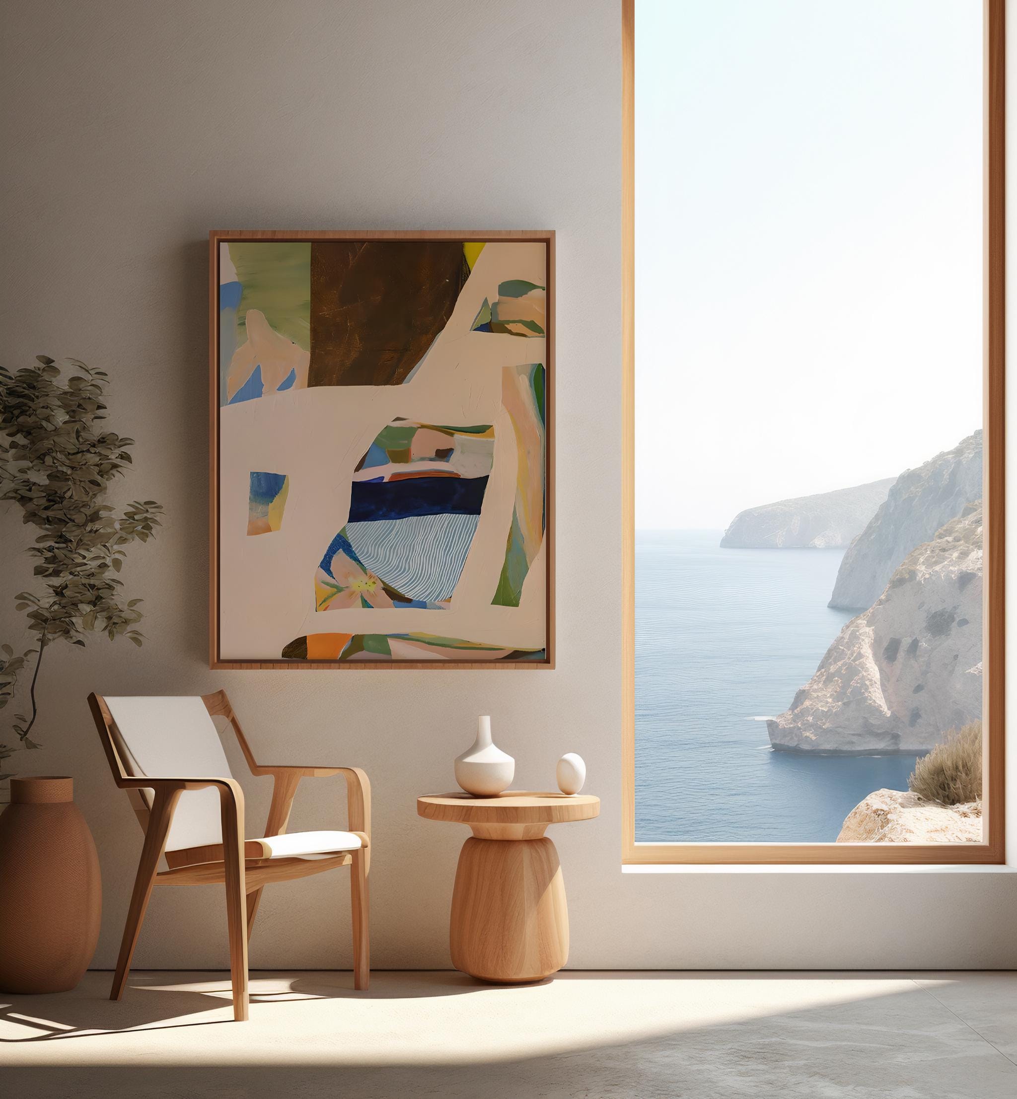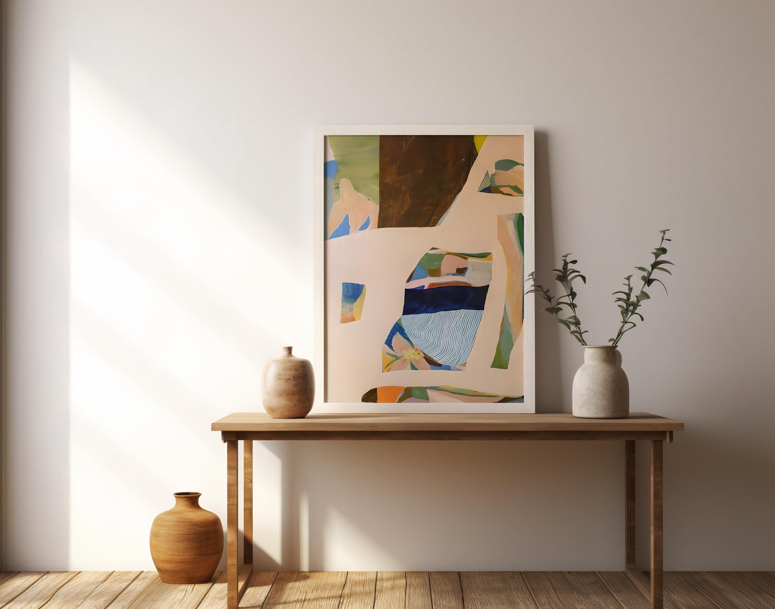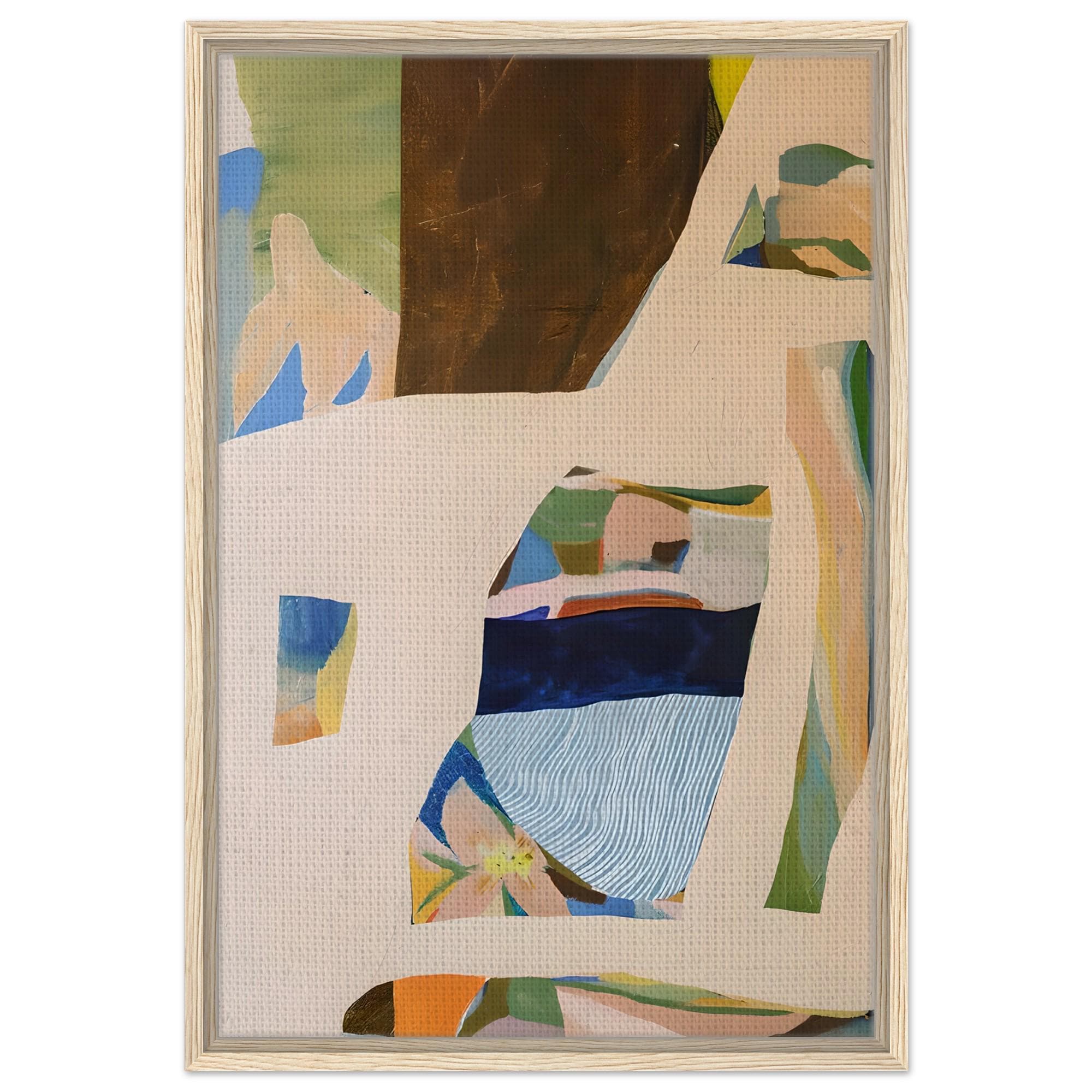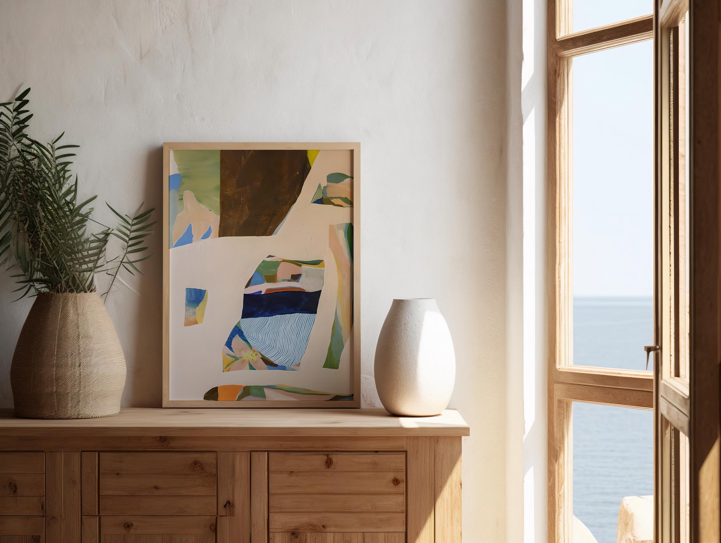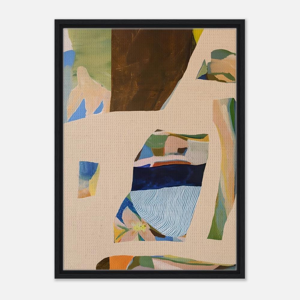 A modern abstract composition featuring layered organic forms and soft, earthy tones. This framed canvas artwork blends warm neutrals, muted greens, and subtle blues to create a calm, balanced piece that feels elevated yet approachable.