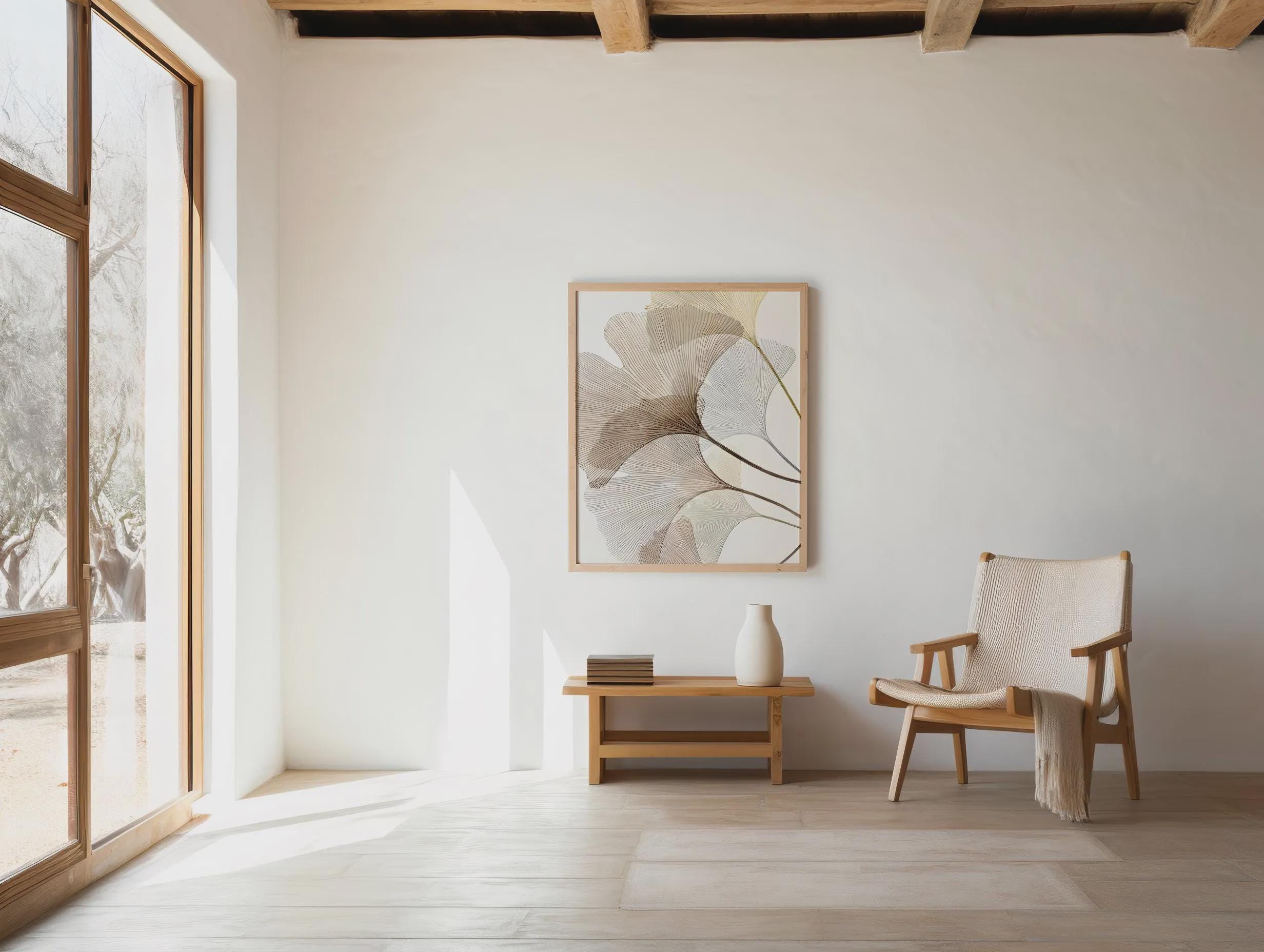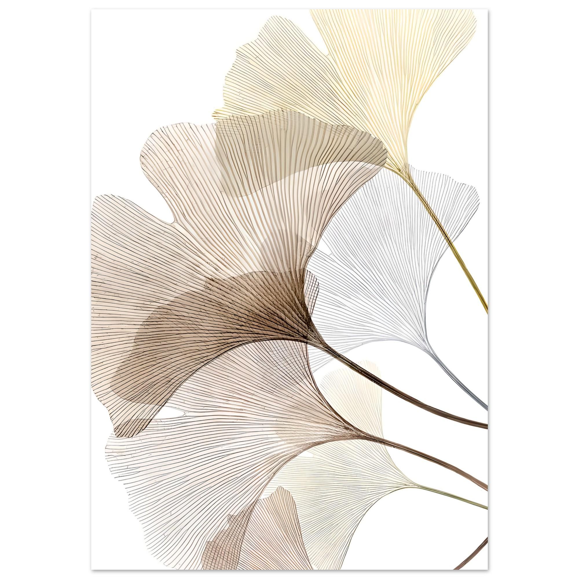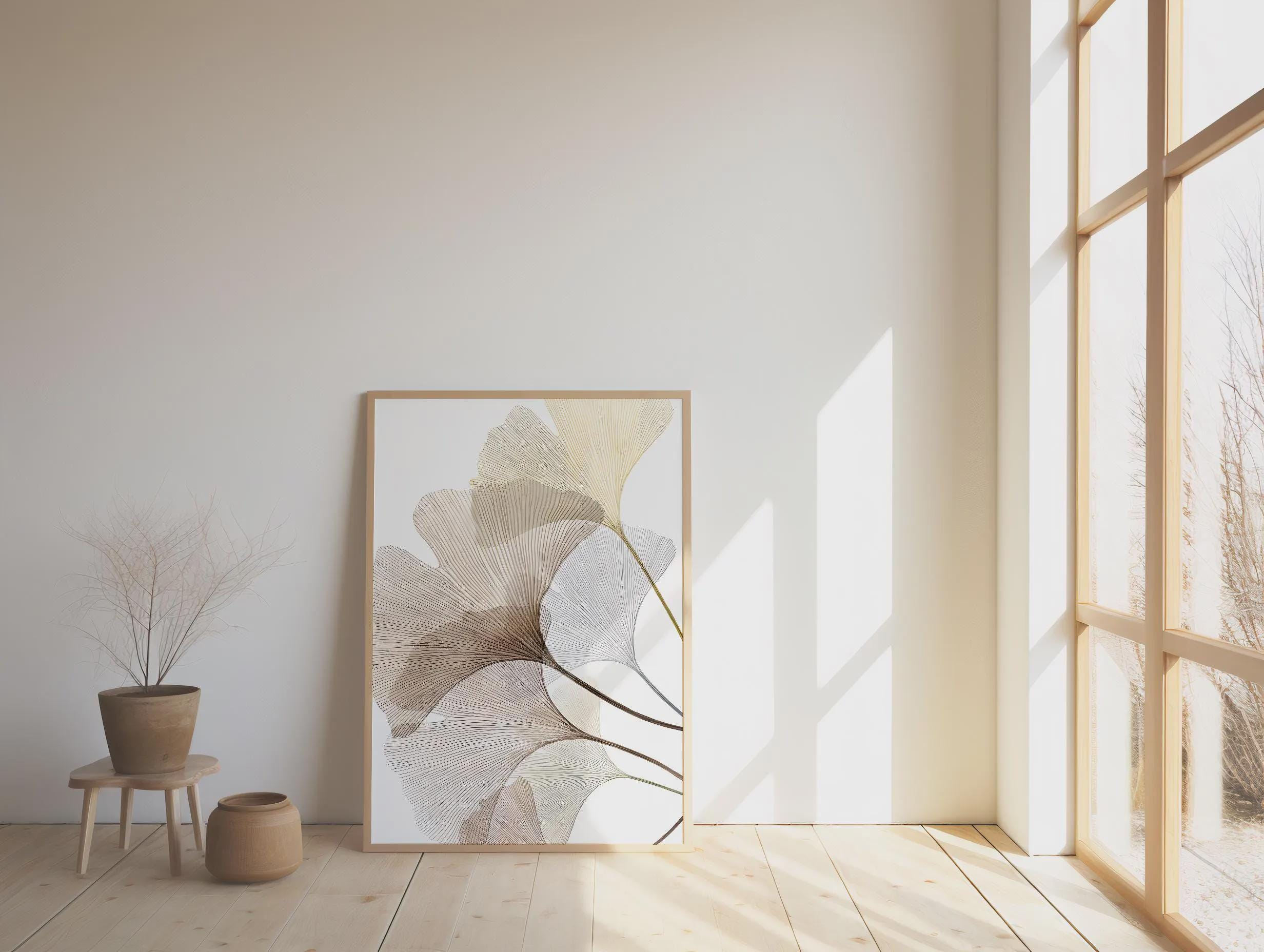 A refined minimalist fine art poster featuring delicate ginkgo leaves rendered in soft neutral tones. Flowing linework and airy composition create a calm, elevated statement that blends seamlessly into modern, organic, and Japandi-inspired interiors. Designed to feel light yet sophisticated, this piece adds movement without overwhelming a space.