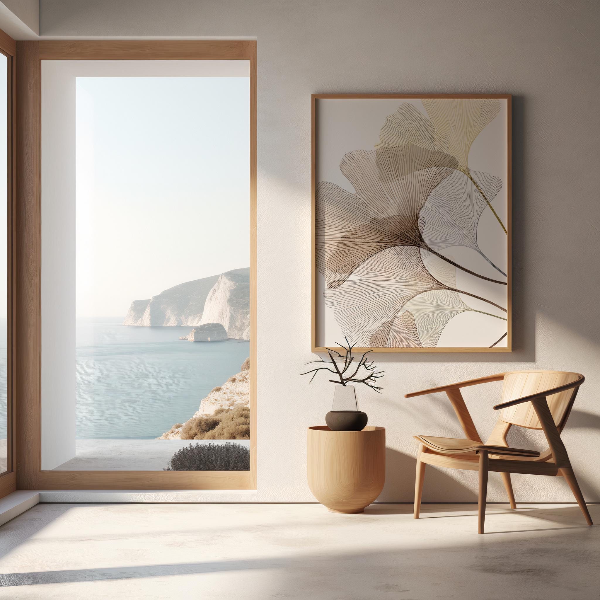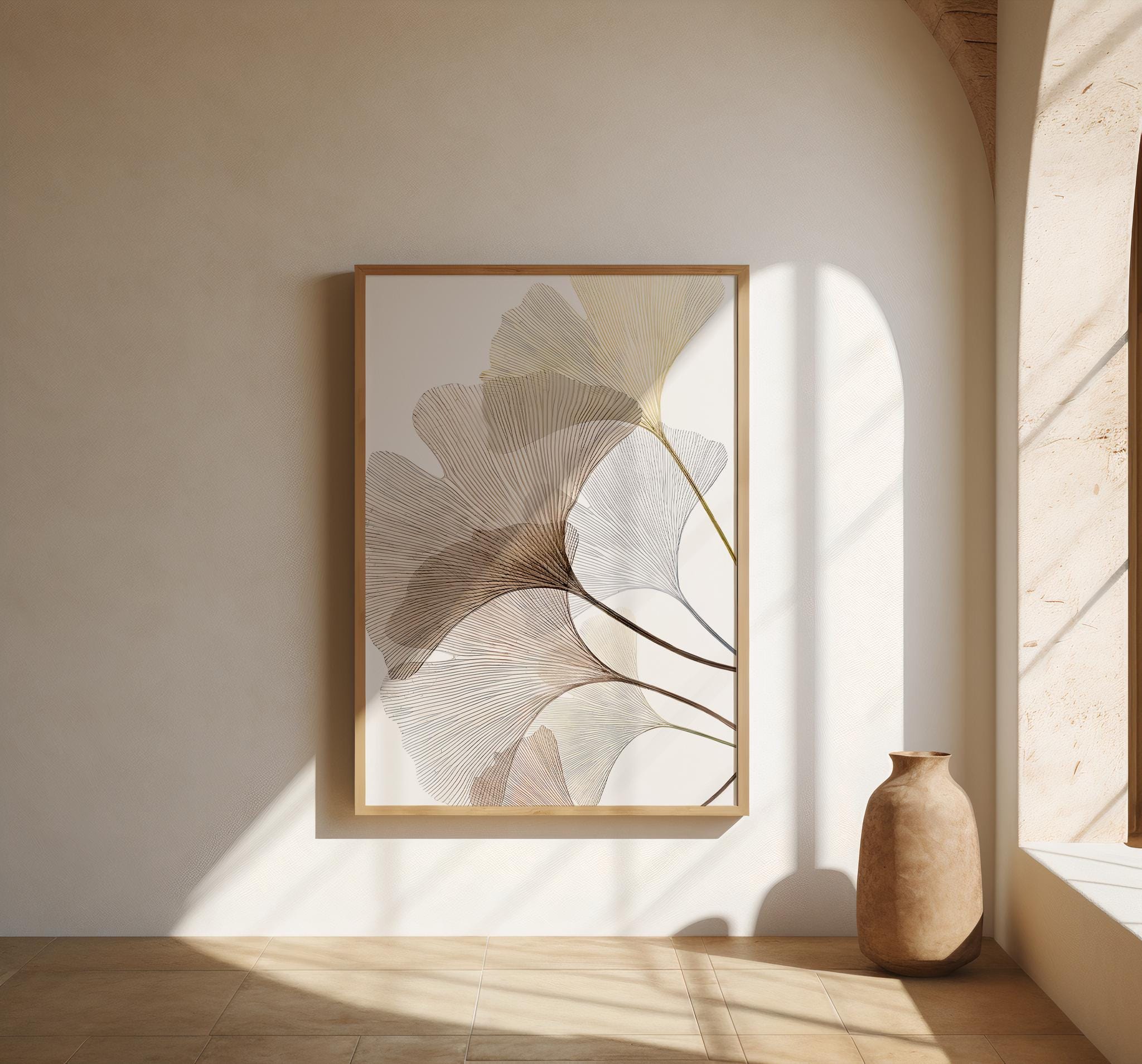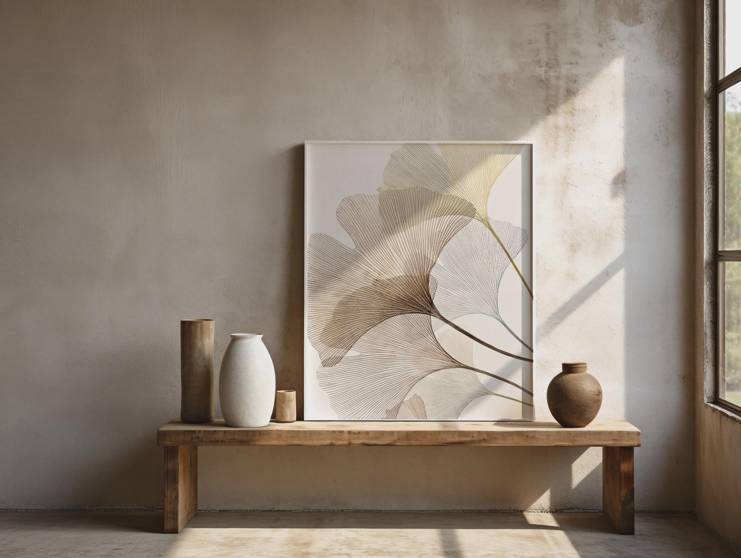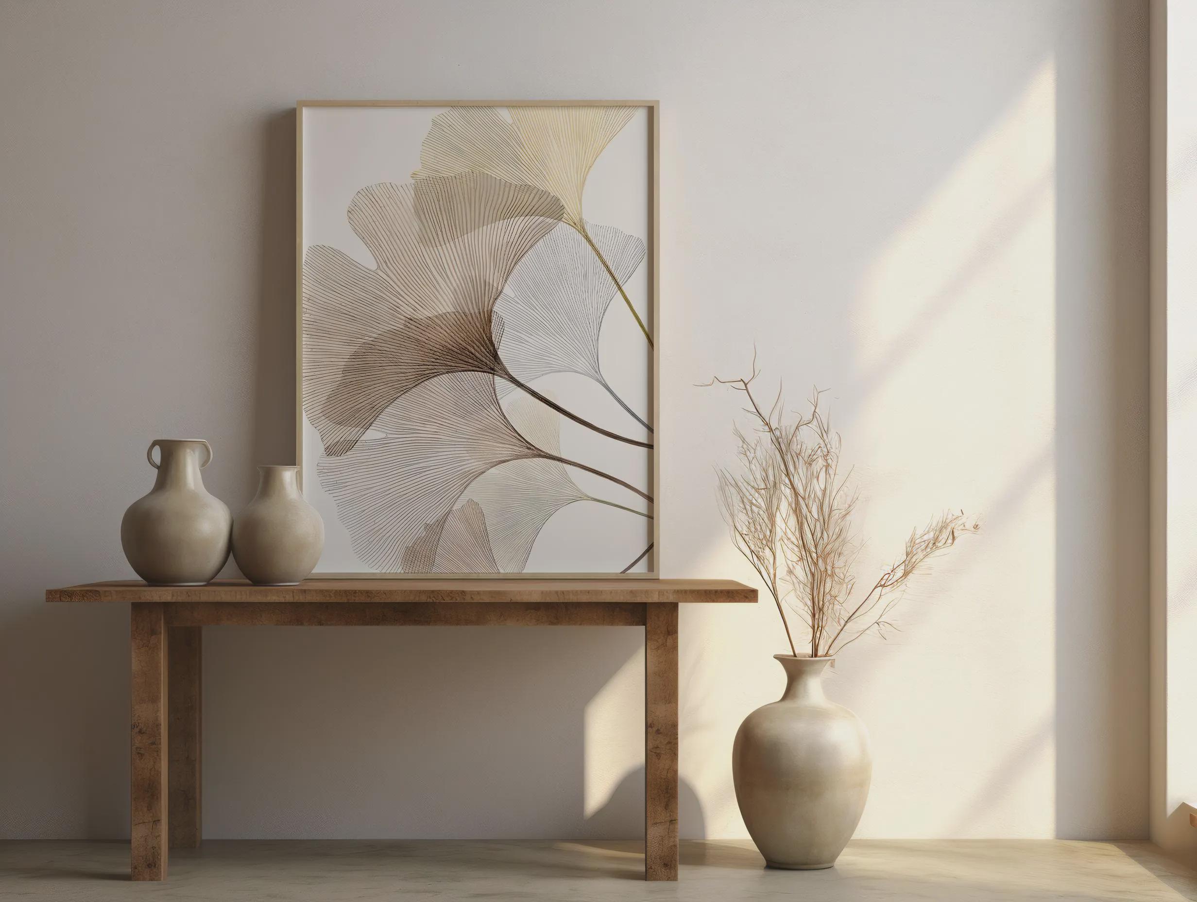 A refined minimalist fine art poster featuring delicate ginkgo leaves rendered in soft neutral tones. Flowing linework and airy composition create a calm, elevated statement that blends seamlessly into modern, organic, and Japandi-inspired interiors. Designed to feel light yet sophisticated, this piece adds movement without overwhelming a space.