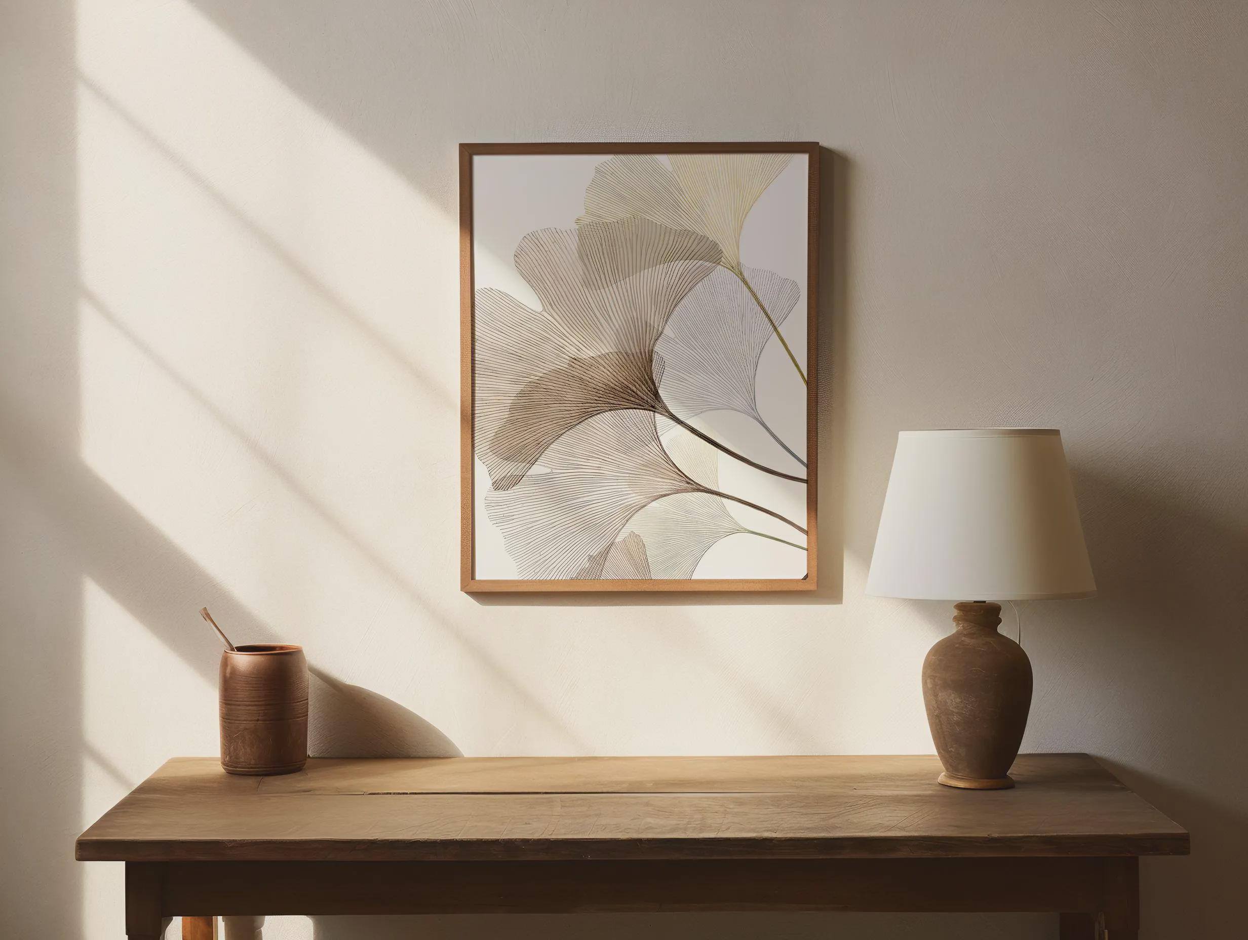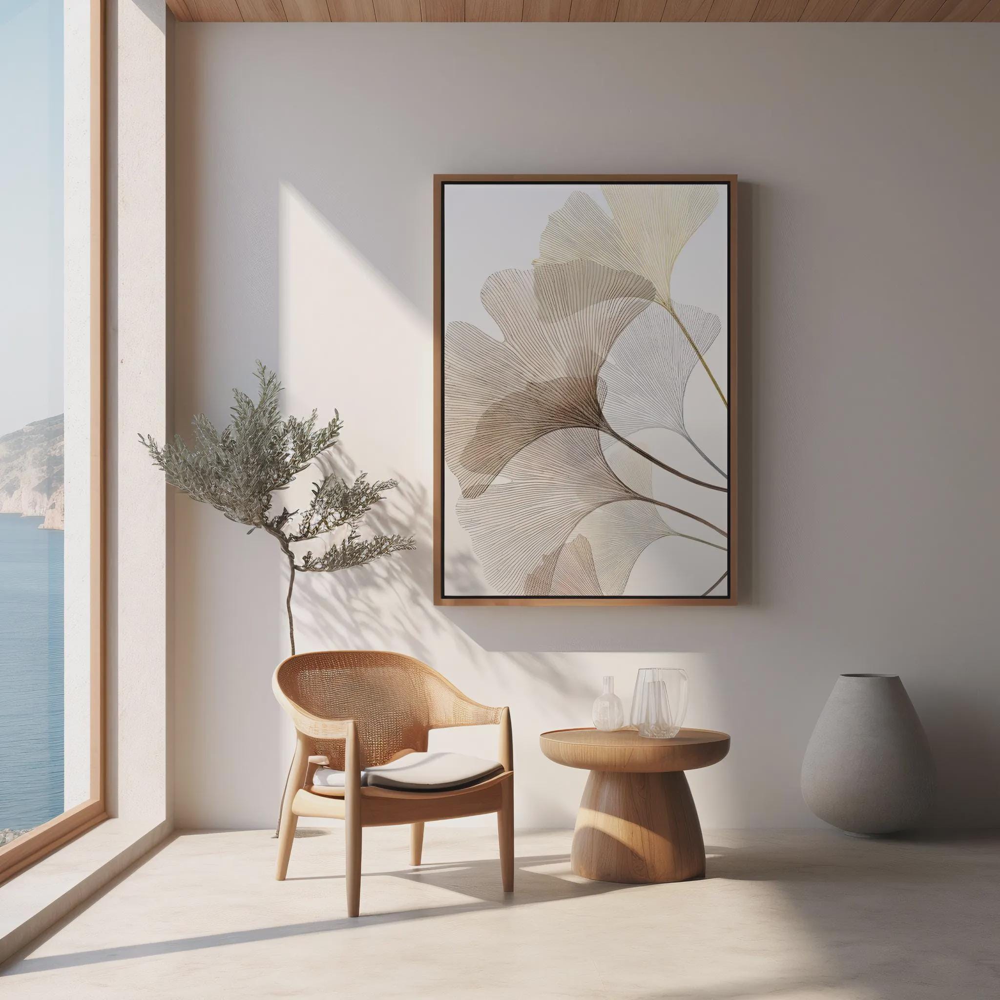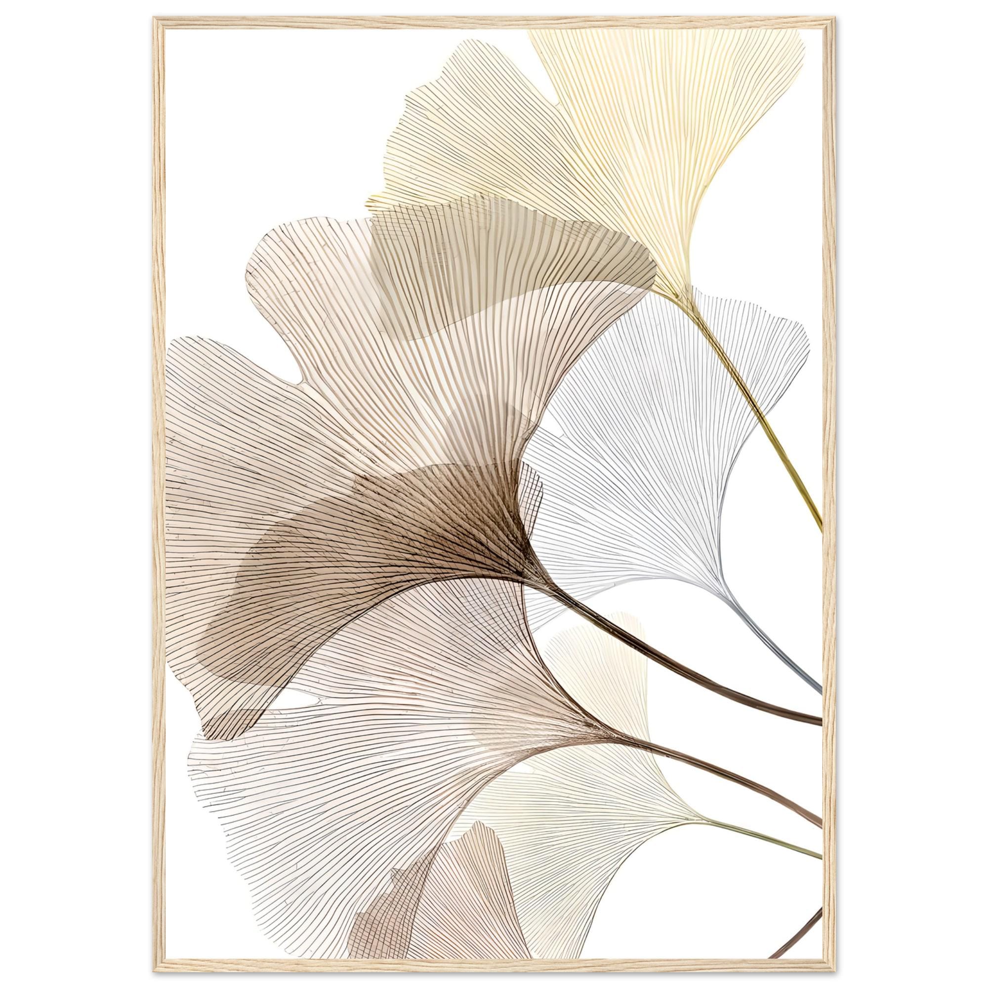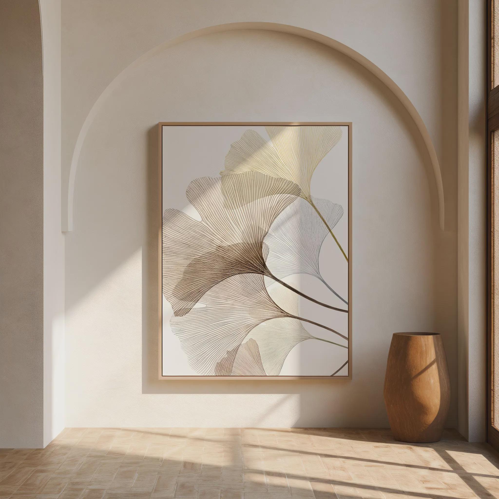 A refined framed poster featuring delicate ginkgo leaves illustrated with flowing linework in soft neutral tones. The airy, organic composition adds movement and calm while maintaining a clean, elevated aesthetic—ideal for modern, Japandi, and organic interiors. Professionally framed and ready to hang for an effortless, polished look.