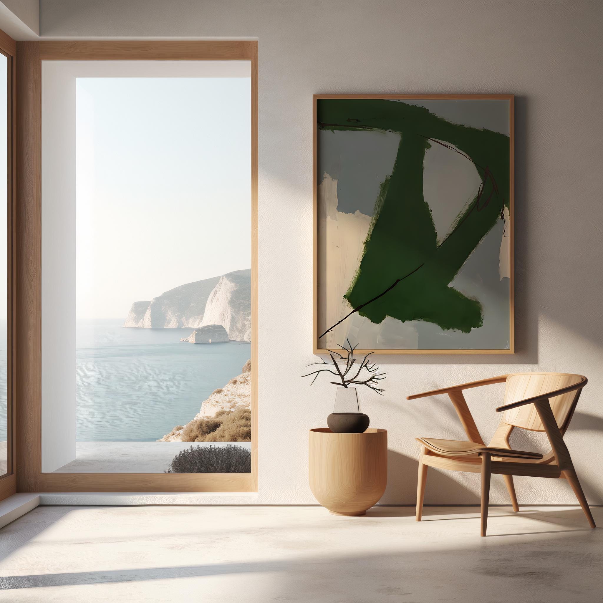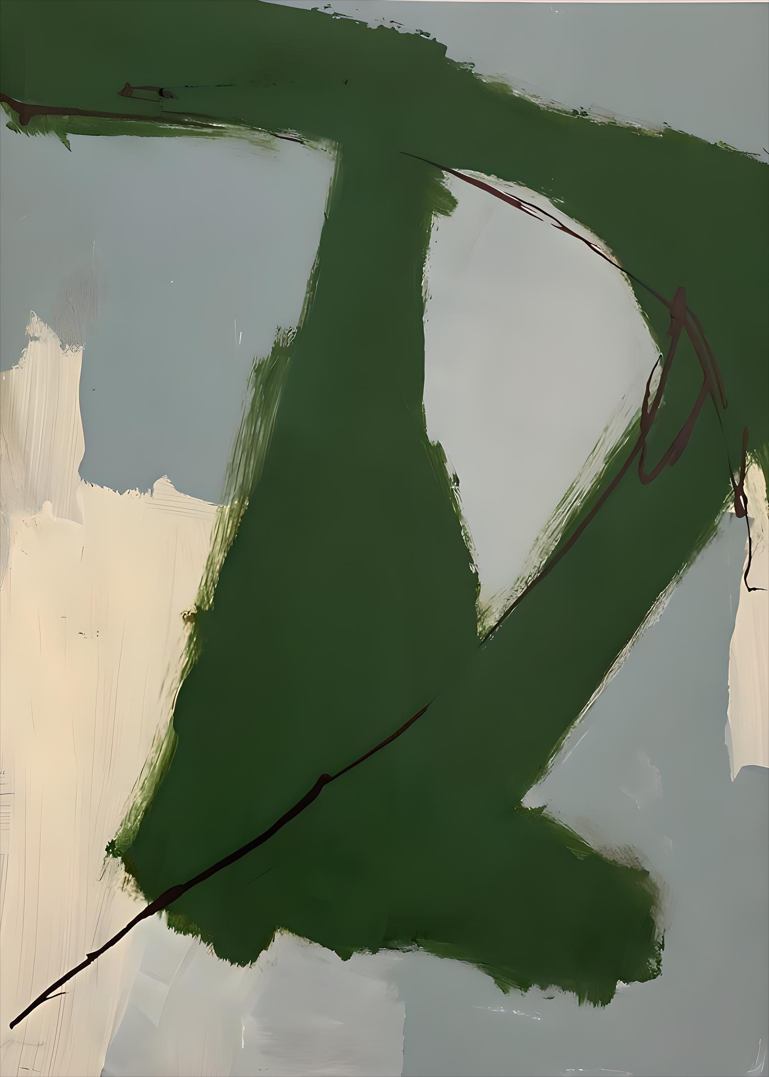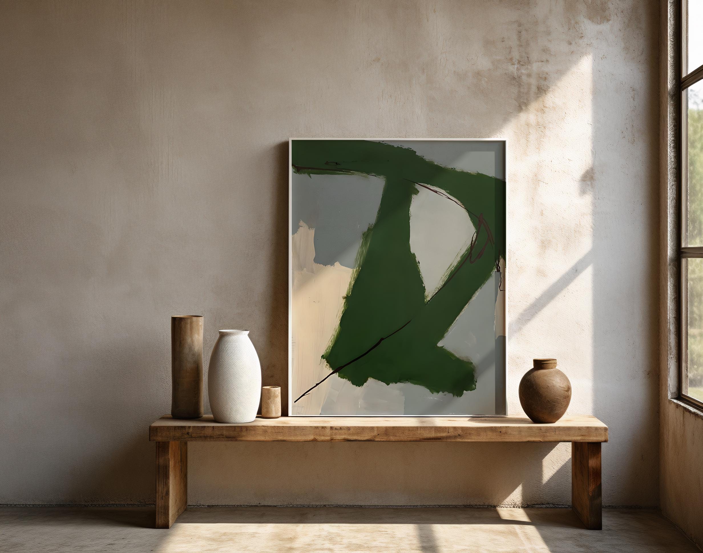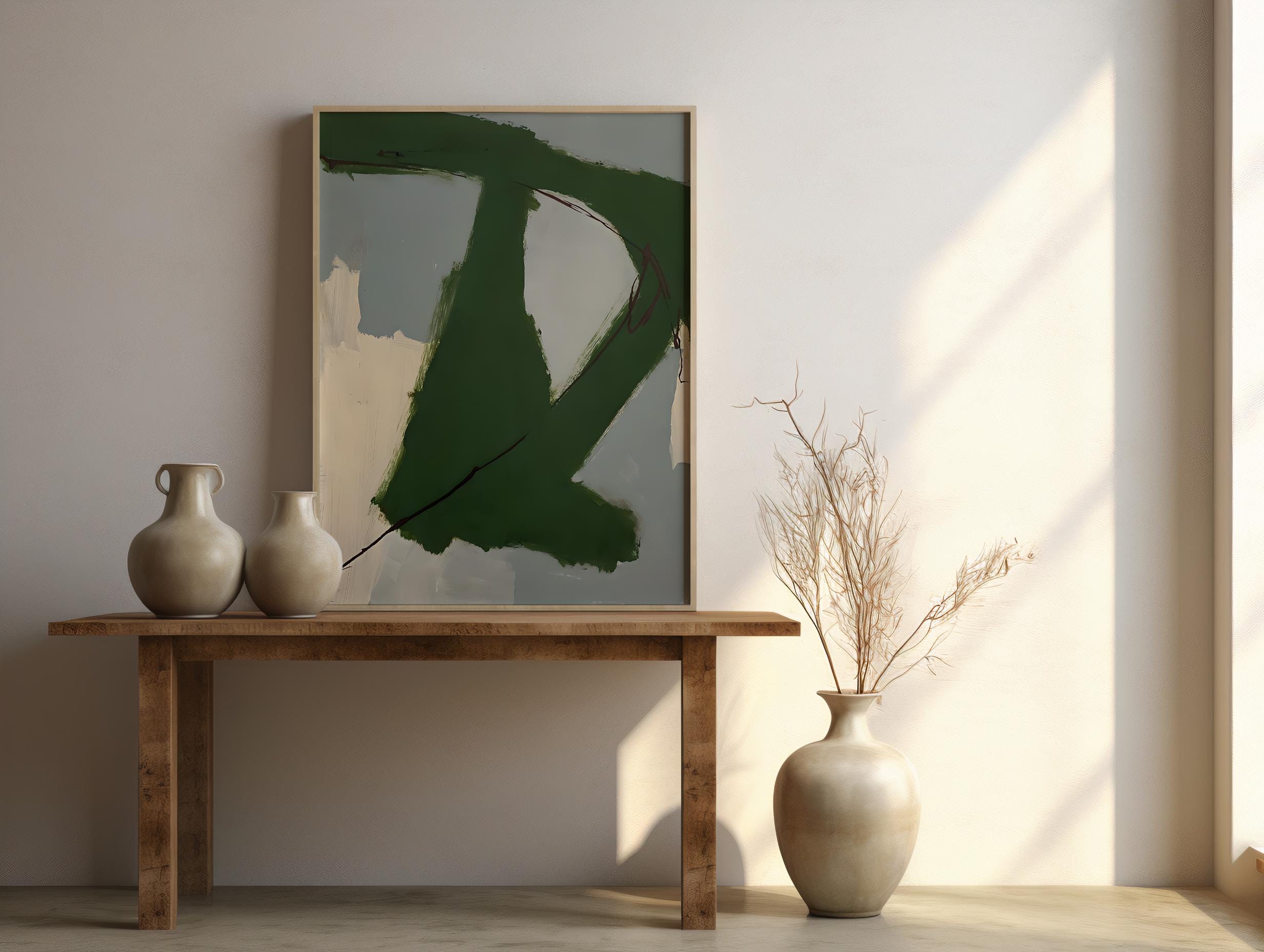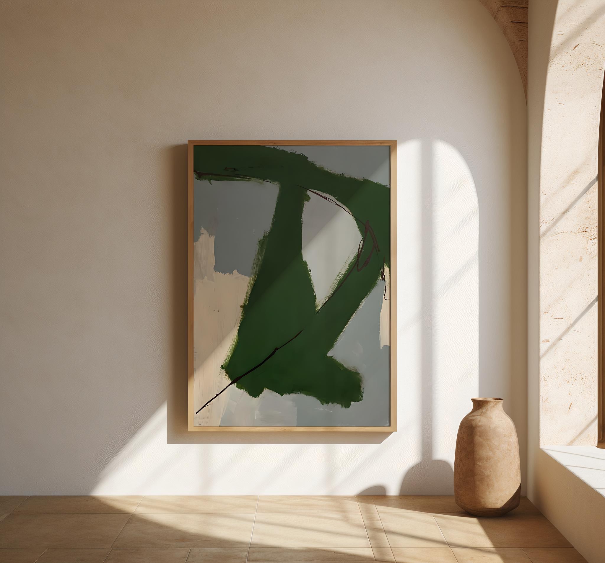 A bold abstract digital artwork featuring expressive green brushstrokes layered over soft neutral tones. The organic movement and painterly texture create a modern, grounded feel that works beautifully in contemporary, minimalist, and organic interiors. Designed to add depth and character while remaining calm and versatile.