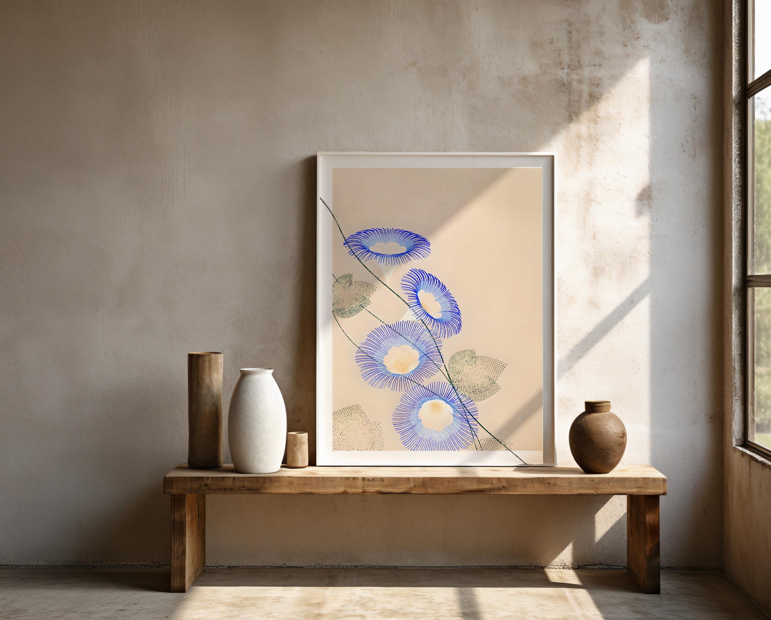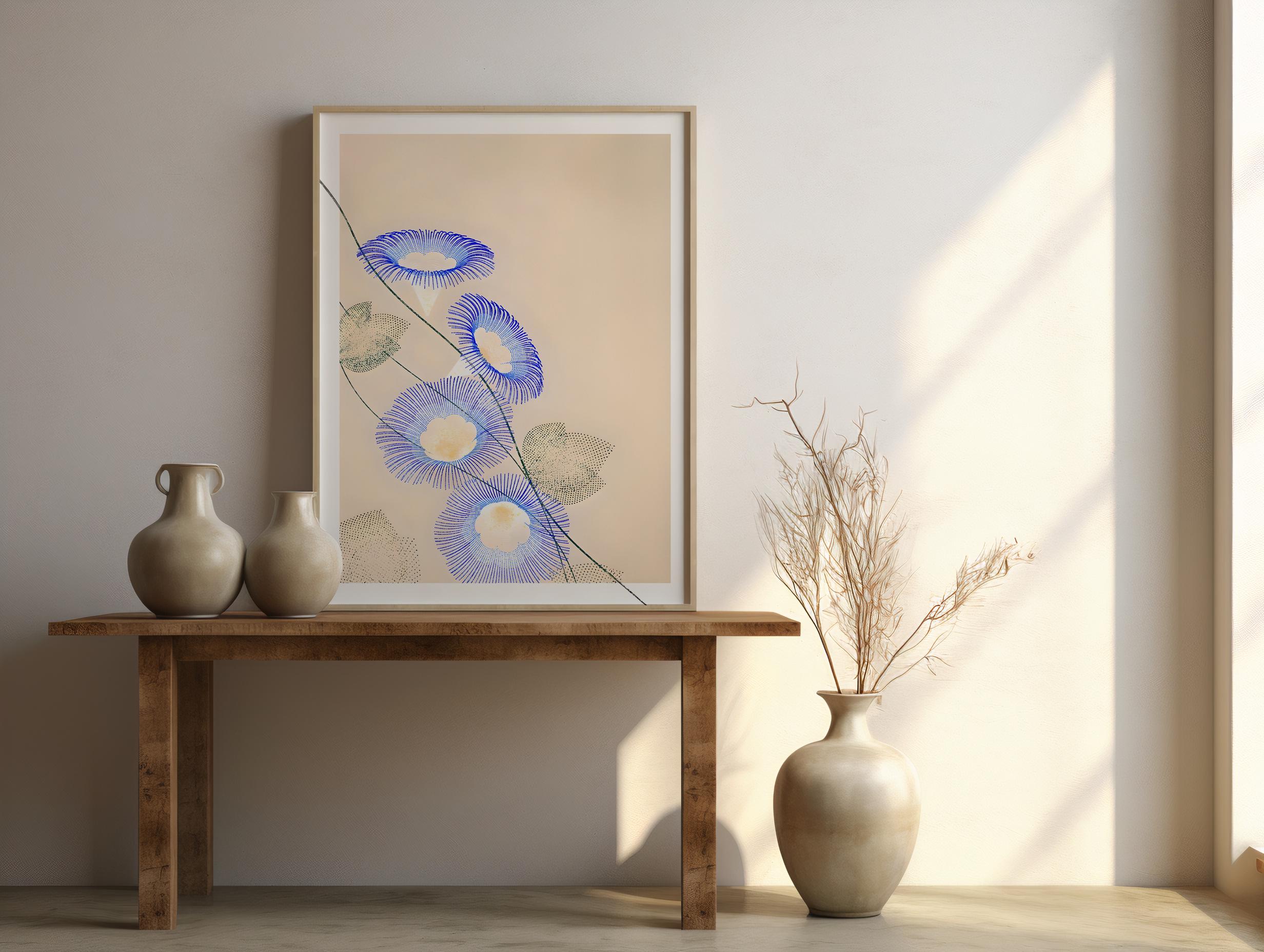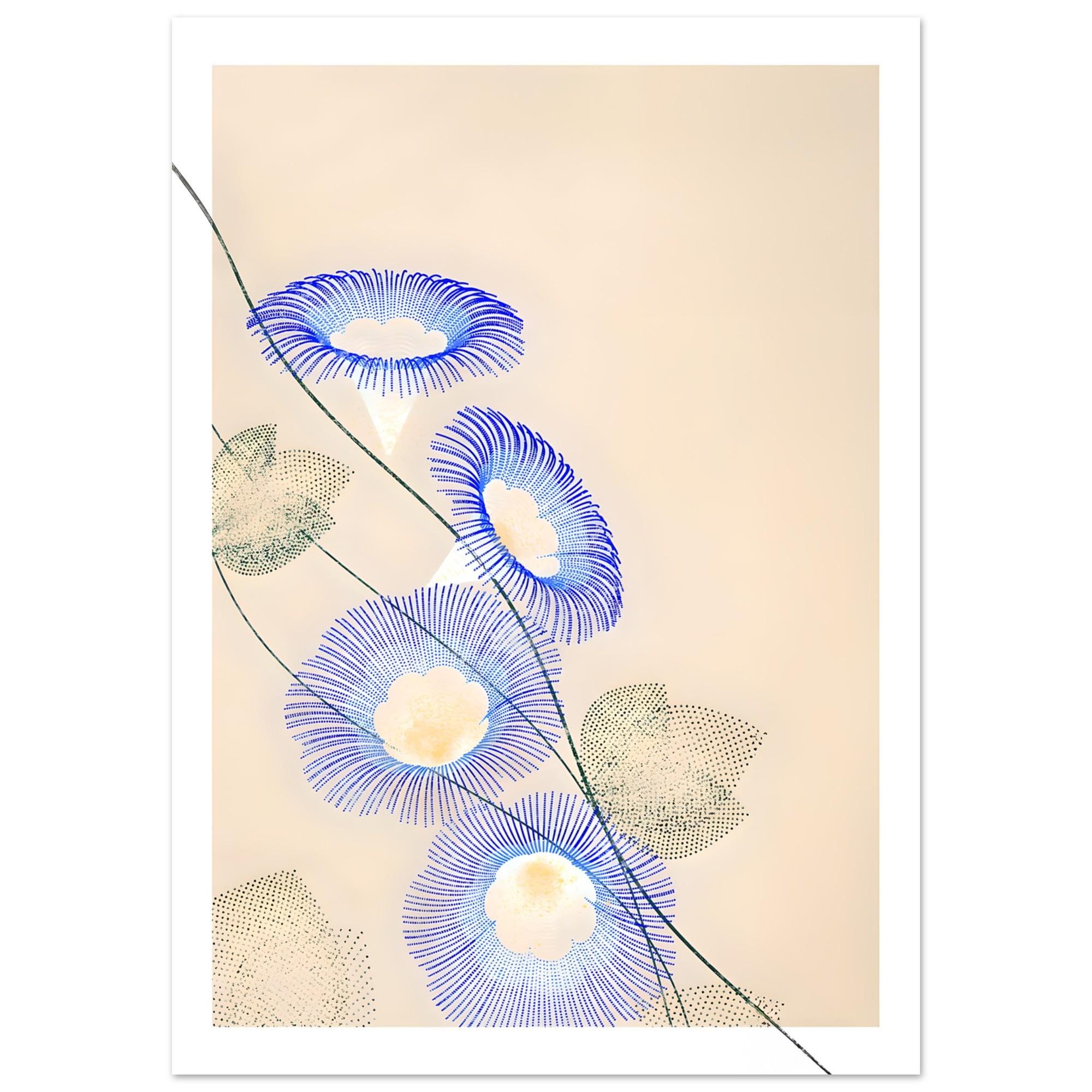A modern fine art poster featuring abstract blue floral forms layered over a soft neutral background. Delicate dotted textures and flowing lines create movement and balance, resulting in a piece that feels expressive yet refined. Designed to bring a subtle statement to contemporary, minimalist, and artistic interiors.