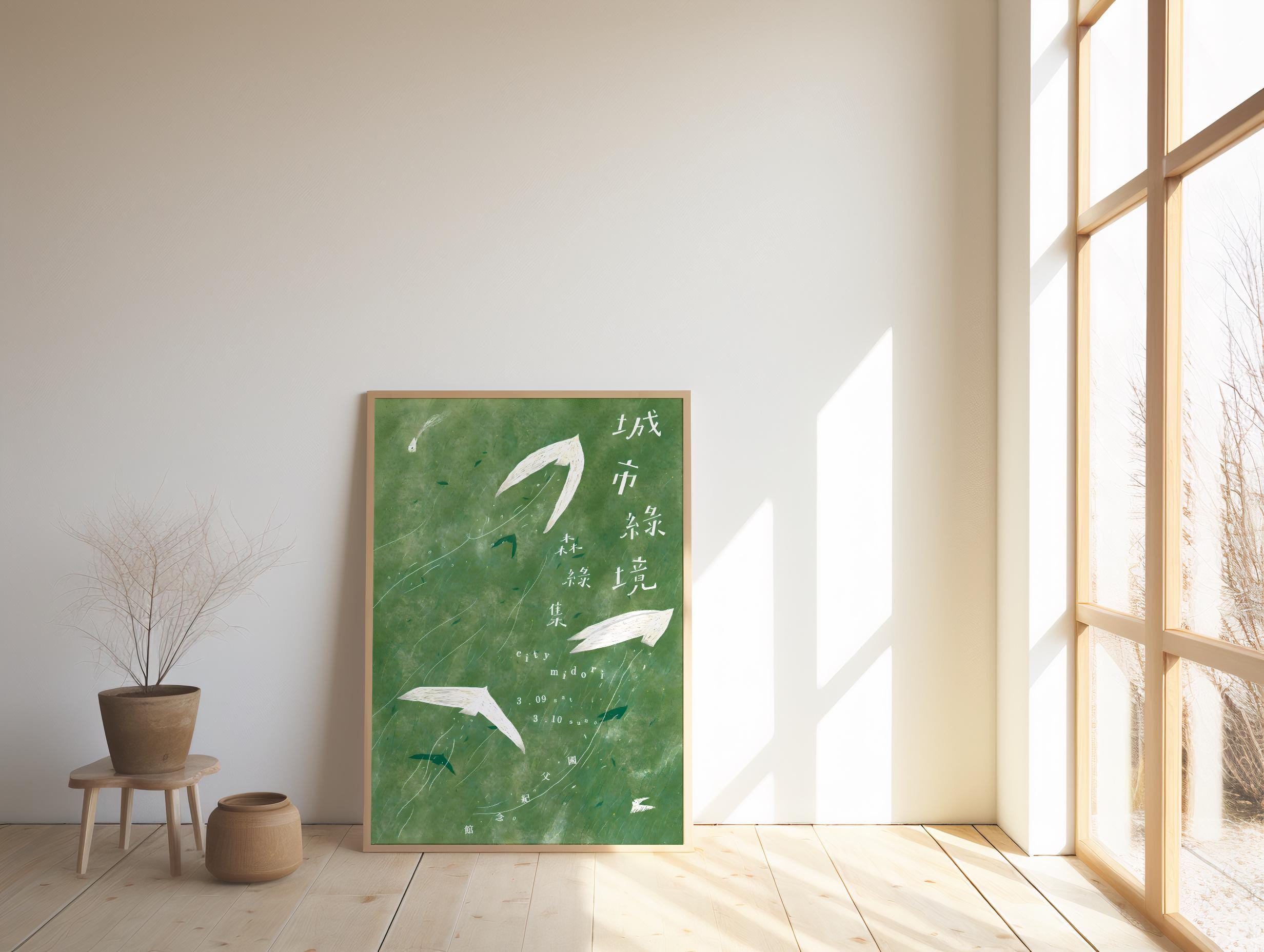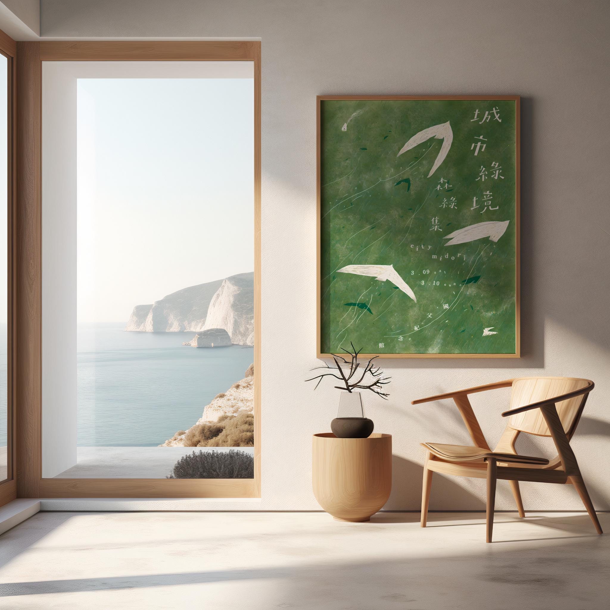 A serene fine art poster inspired by East Asian graphic design, featuring hand-drawn white arrow forms drifting across a textured green background. Soft motion lines and organic marks create a sense of flow, balance, and quiet direction. The composition feels contemplative yet modern—perfect for calm, design-forward interiors.