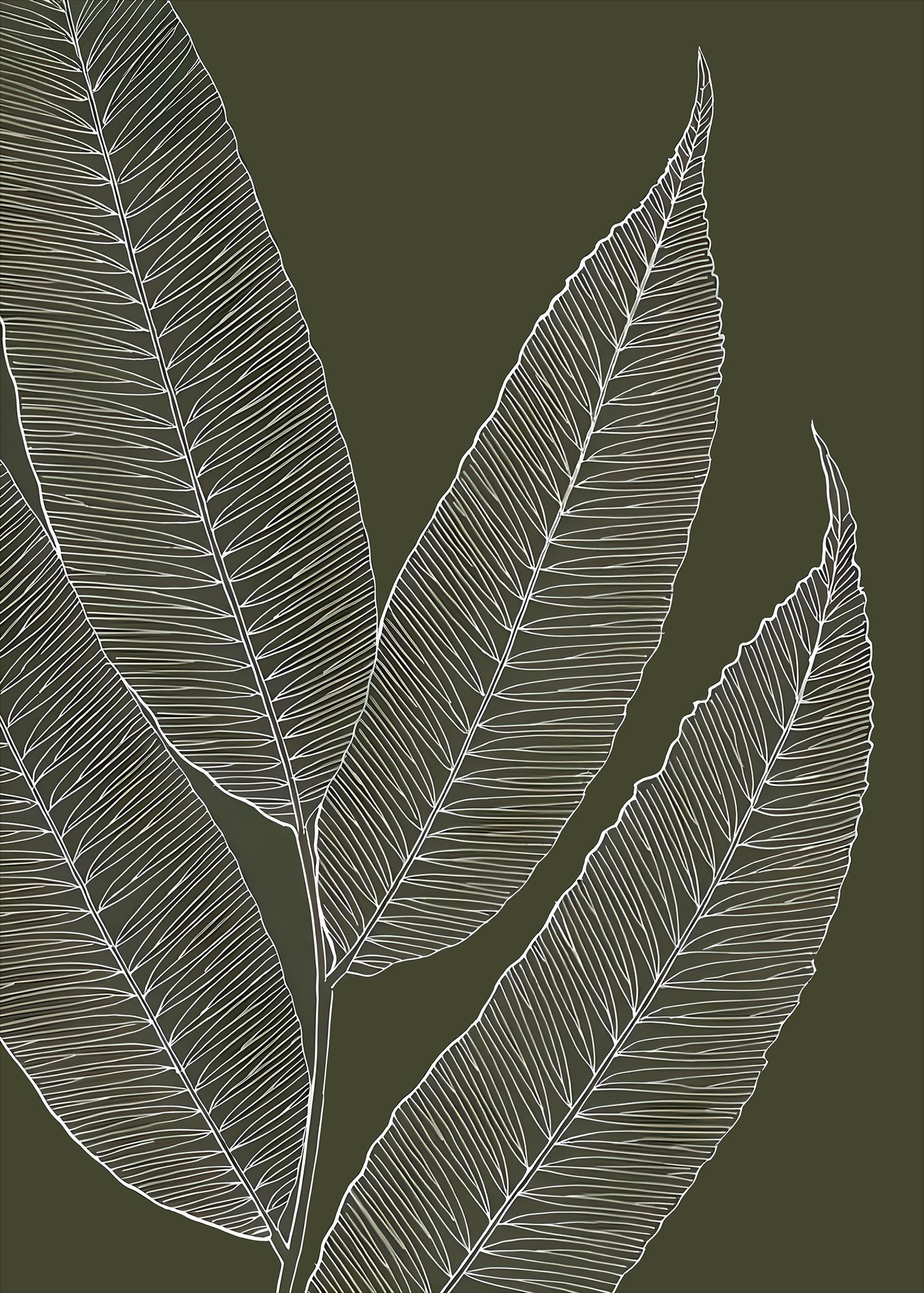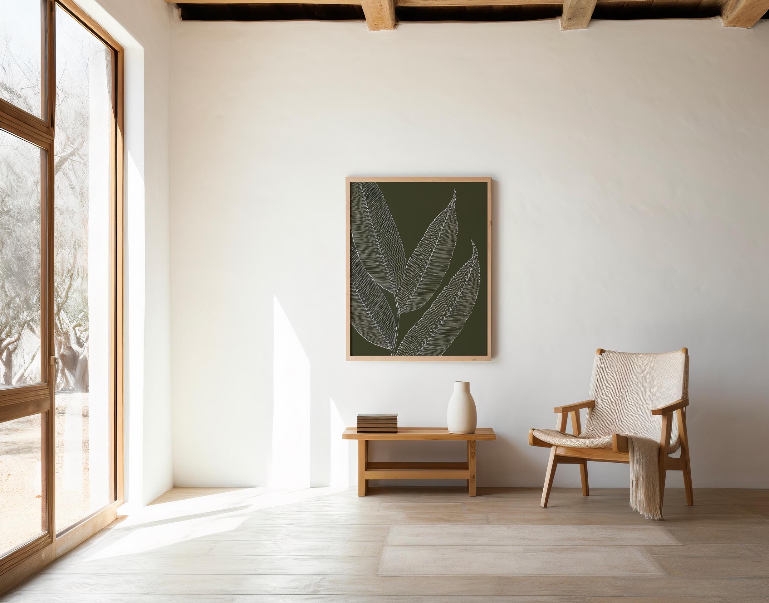 A minimalist botanical digital artwork featuring delicate white leaf line art set against a deep olive green background. Clean lines and subtle texture create a calm, organic composition that feels timeless and modern. Designed to complement minimalist, organic modern, and Japandi-style interiors with an understated, nature-inspired presence.