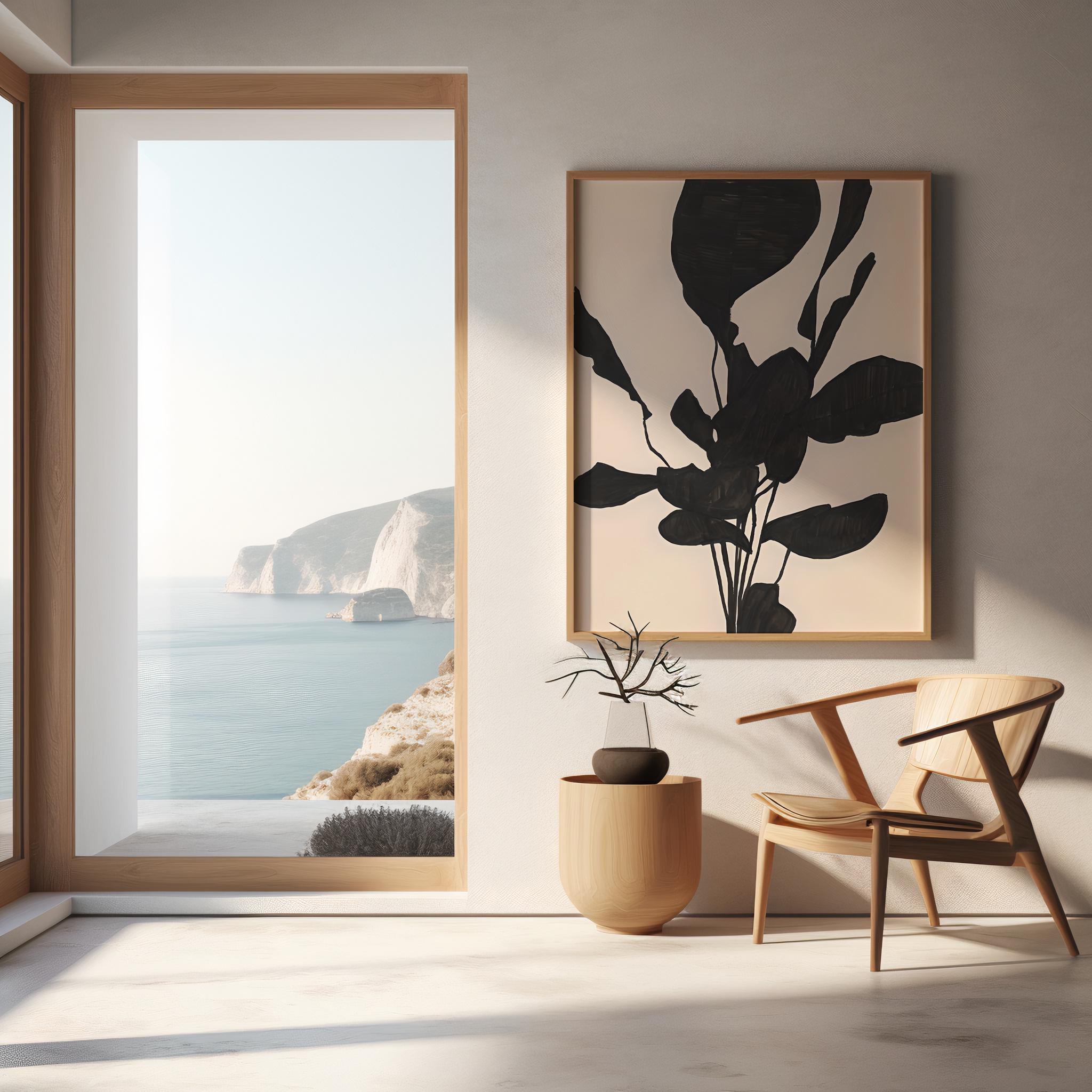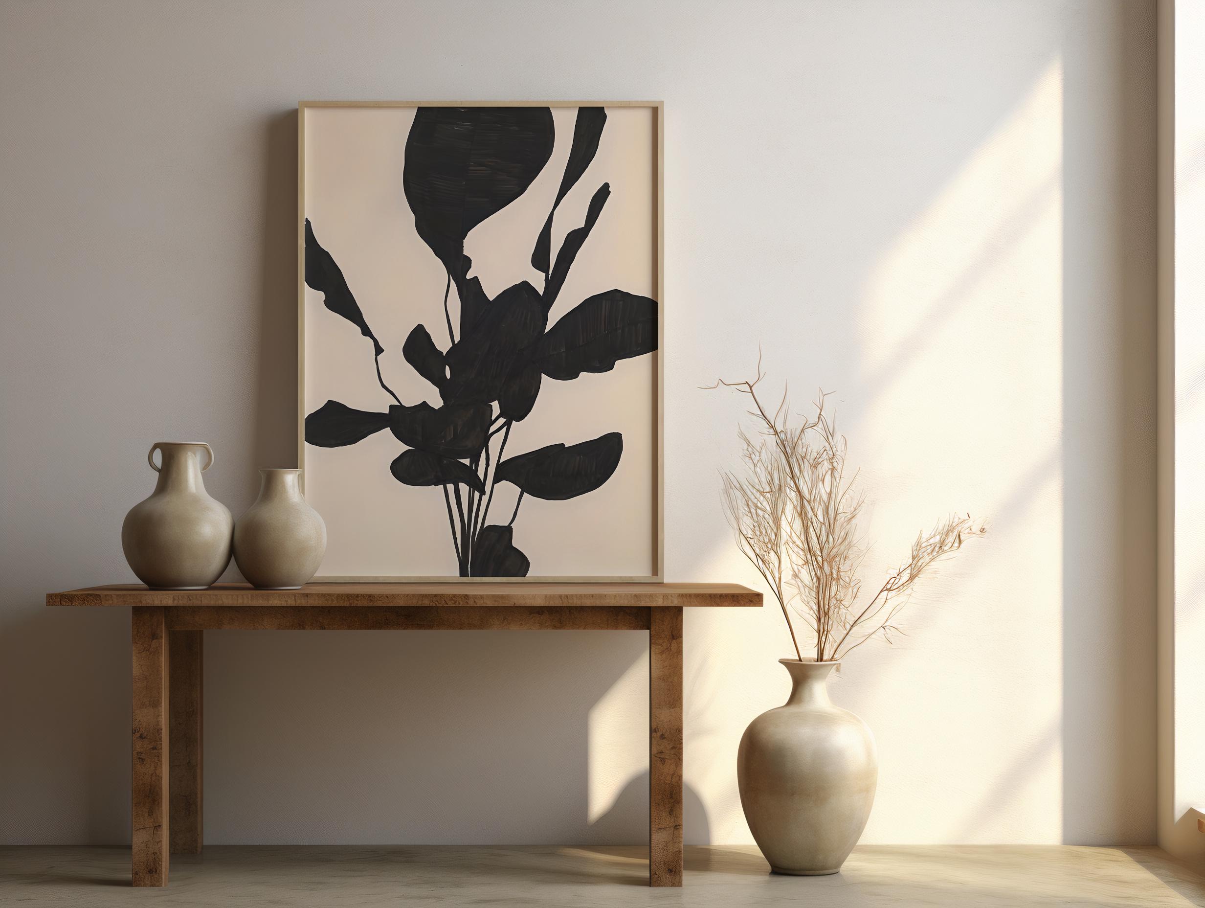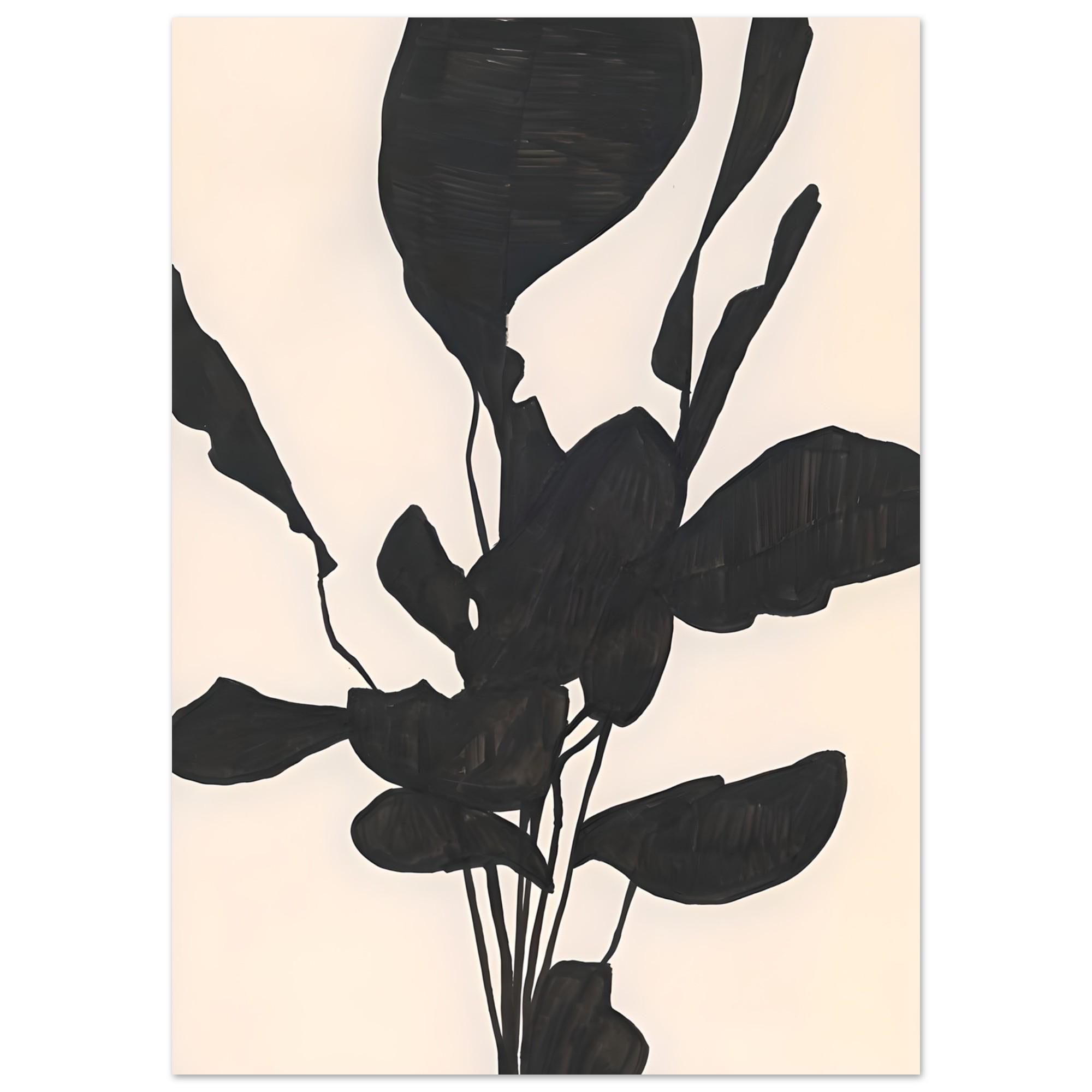 This minimalist botanical artwork features bold black leaf silhouettes against a soft neutral background, creating a refined, organic statement. The strong contrast and fluid shapes bring depth and movement while maintaining a calm, modern aesthetic.