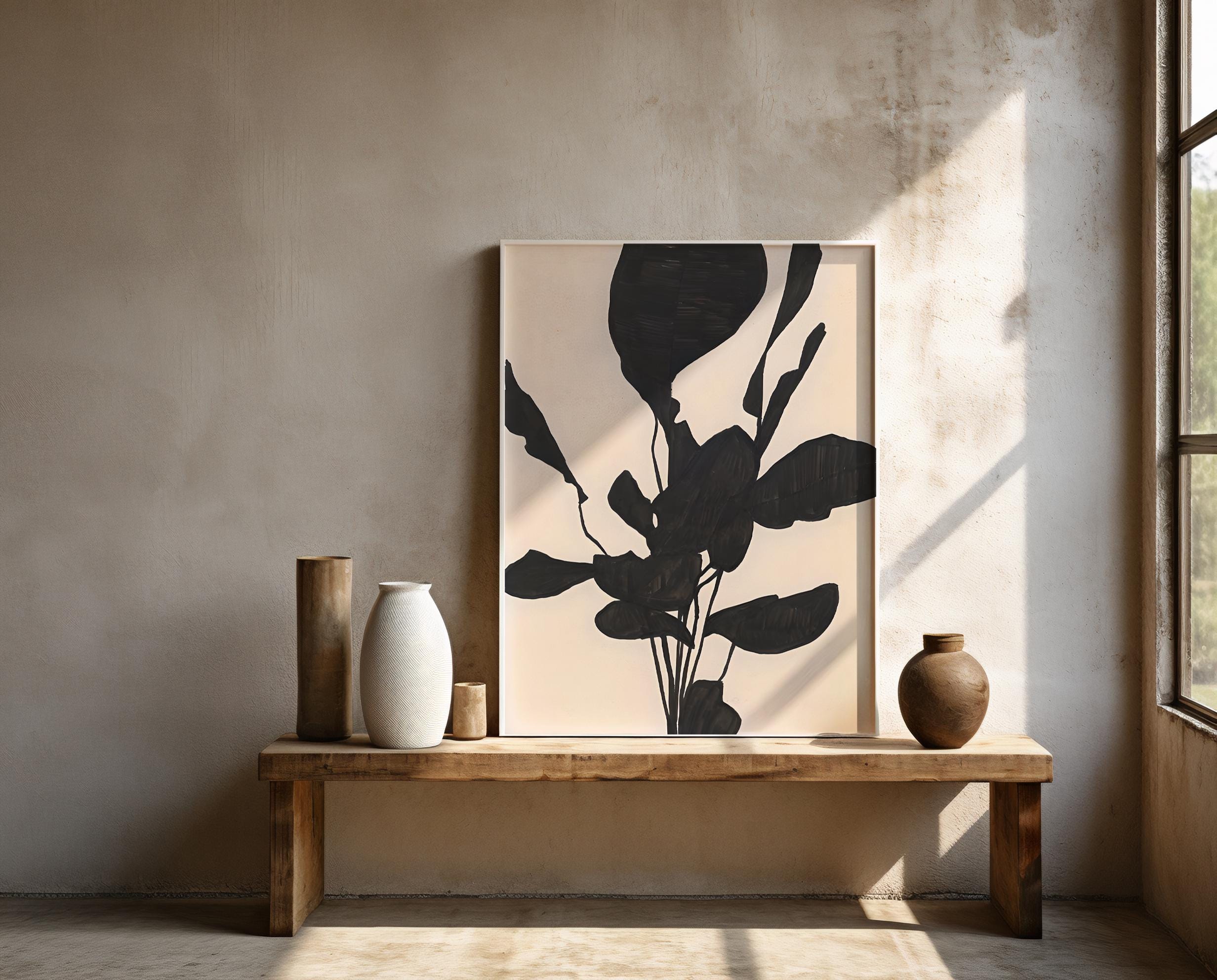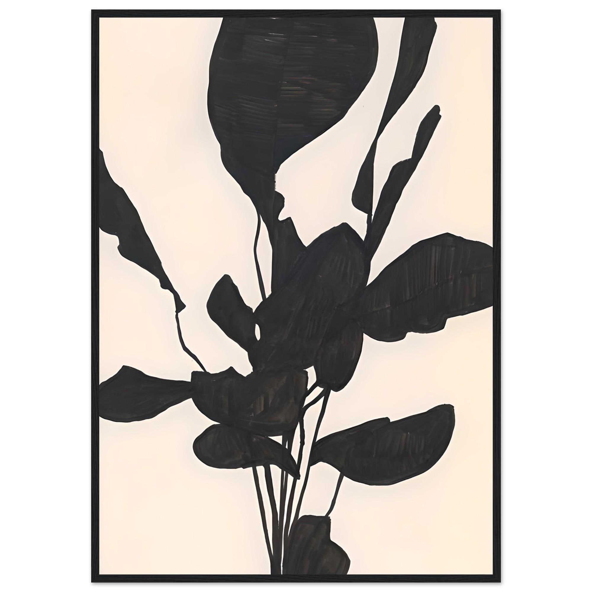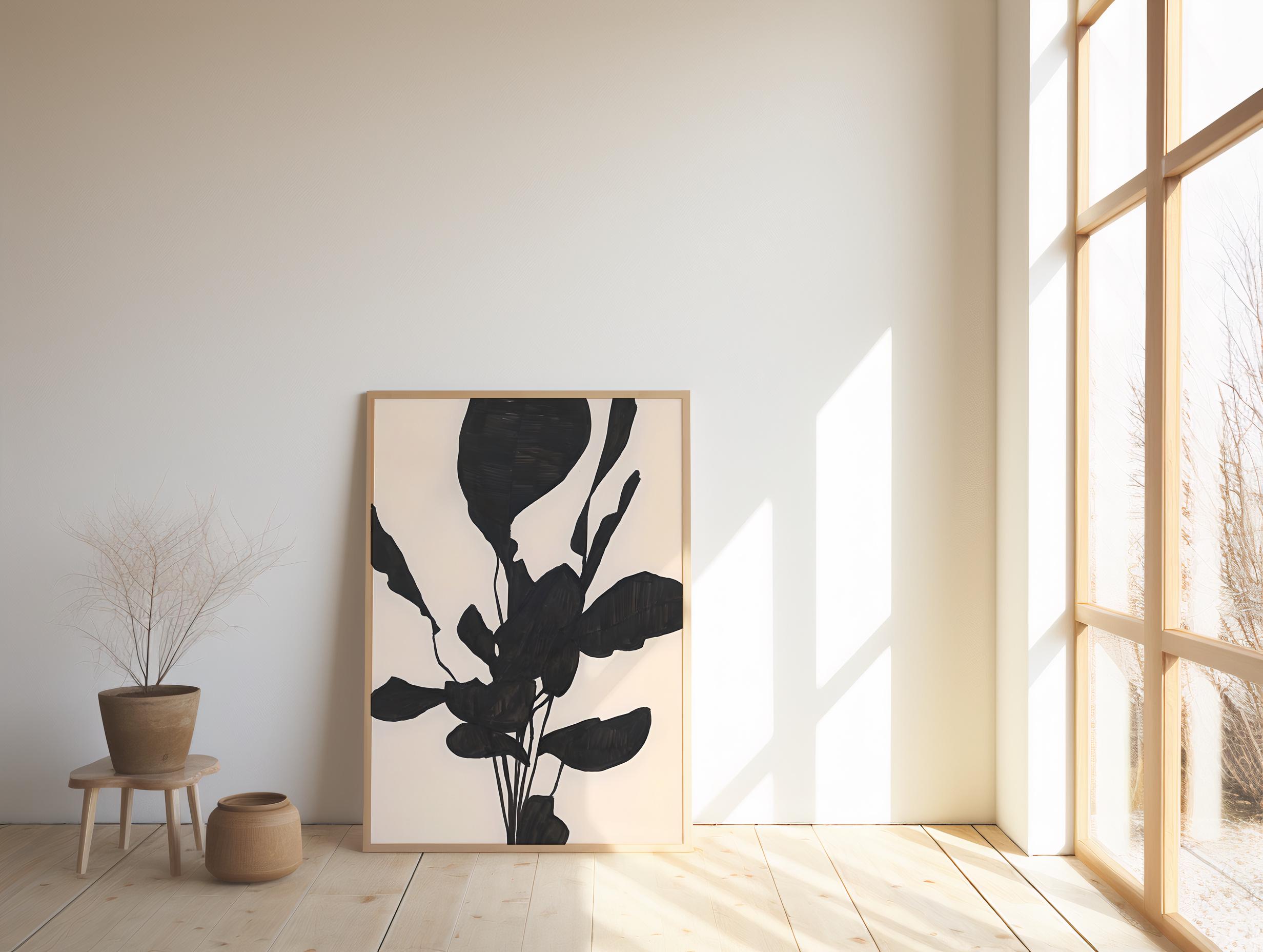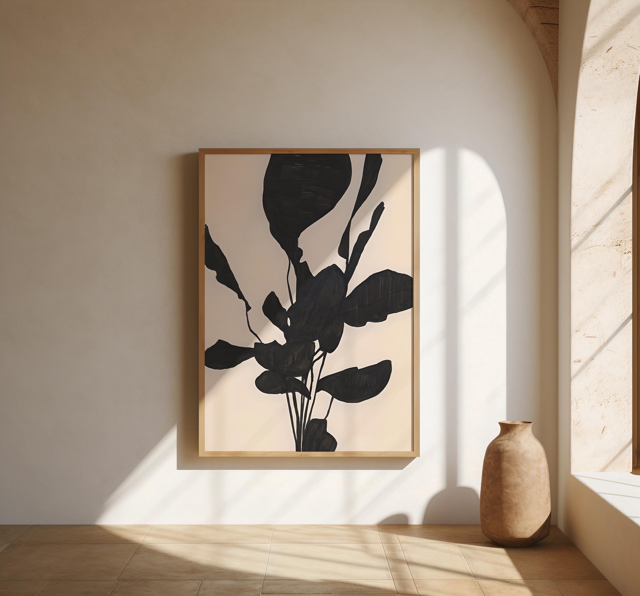 This framed botanical artwork features bold black leaf silhouettes set against a soft neutral background, creating a striking yet calm visual statement. The organic shapes and high contrast bring depth and elegance while maintaining a minimalist, modern feel.