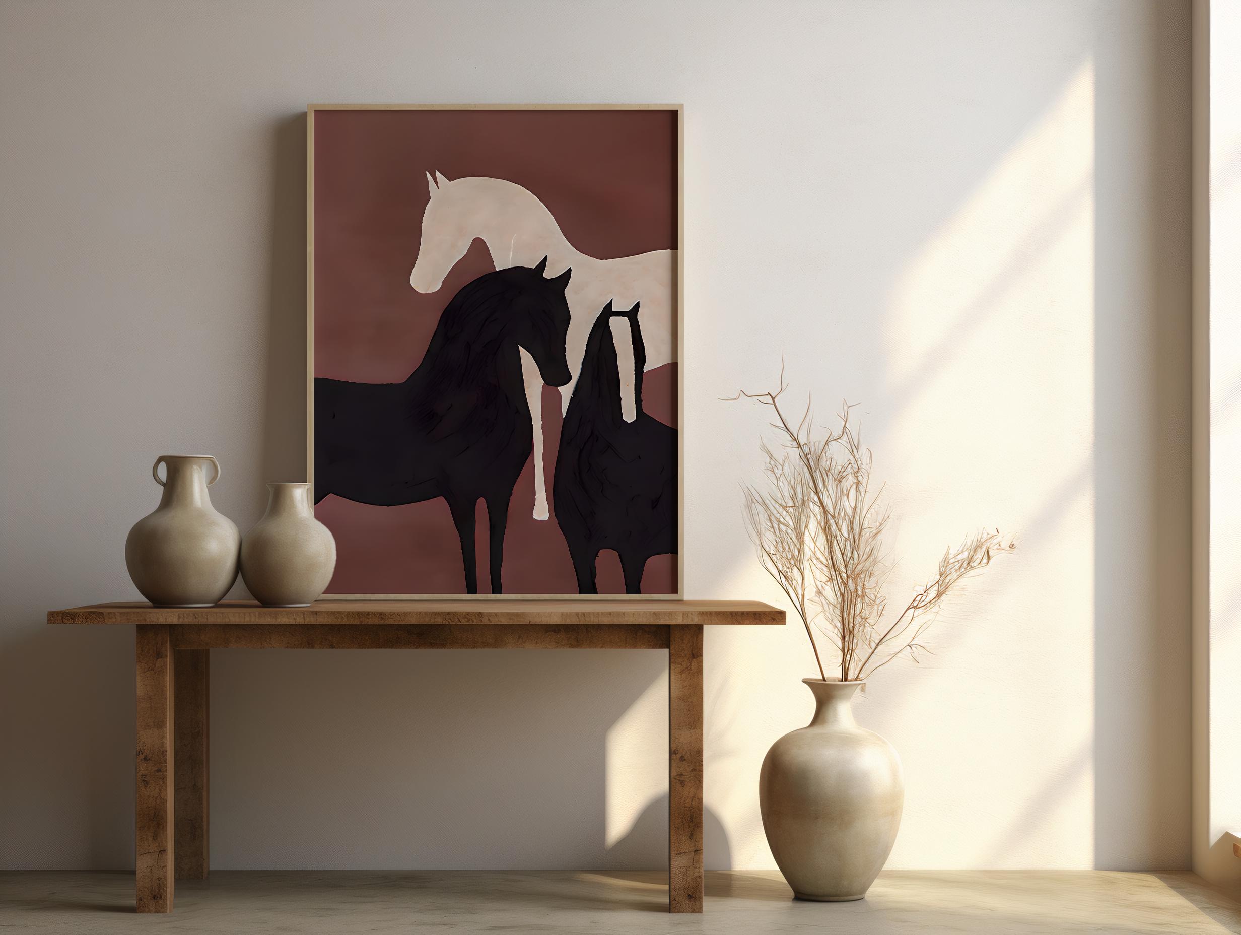 A refined minimalist equine artwork featuring layered horse silhouettes in soft neutrals and deep contrasting tones. Sculptural, calm, and contemporary—designed to anchor a space without overpowering it.