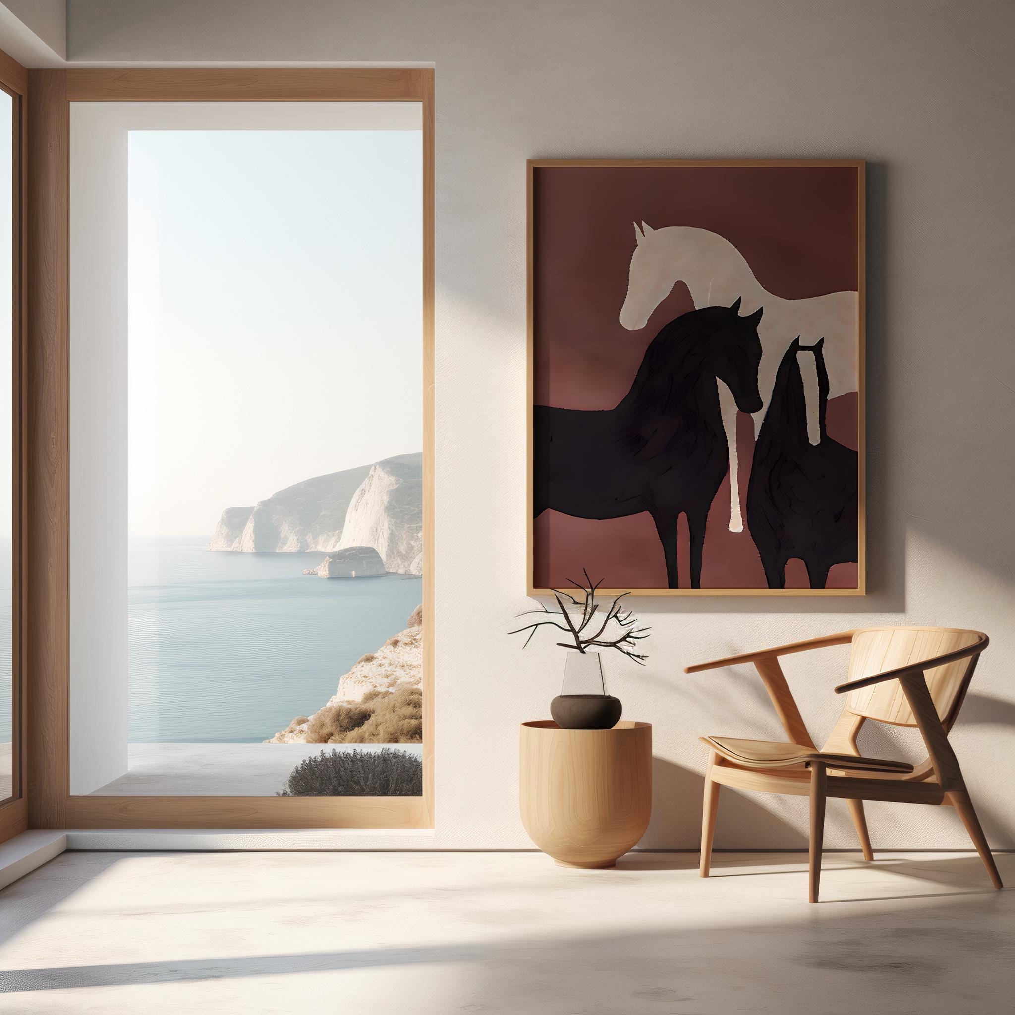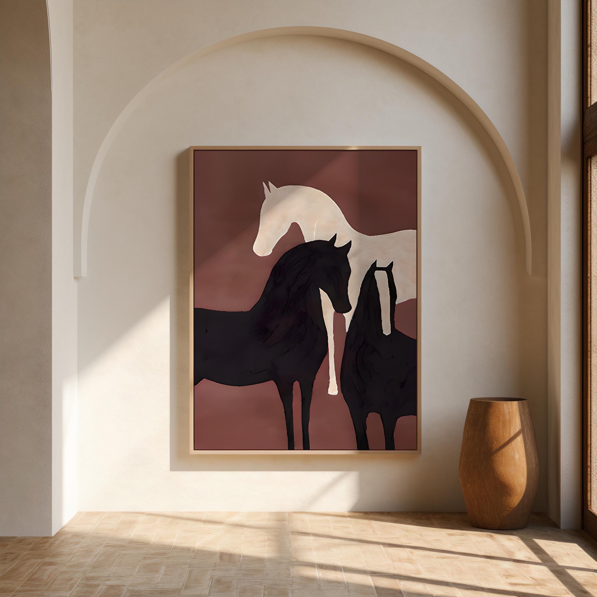 A striking minimalist equine artwork featuring layered horse silhouettes in warm neutrals and deep contrasting tones. Printed on premium canvas and finished with a floating frame, this piece delivers depth, texture, and a refined gallery look—designed to elevate modern, organic, and contemporary interiors.