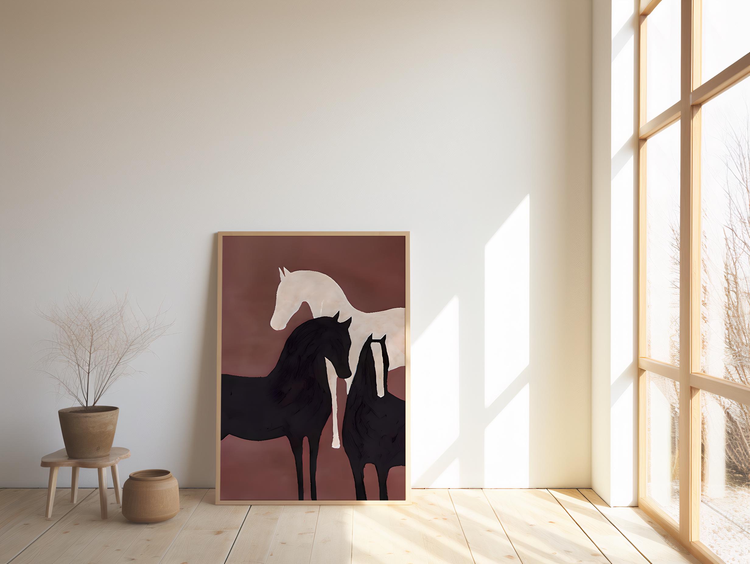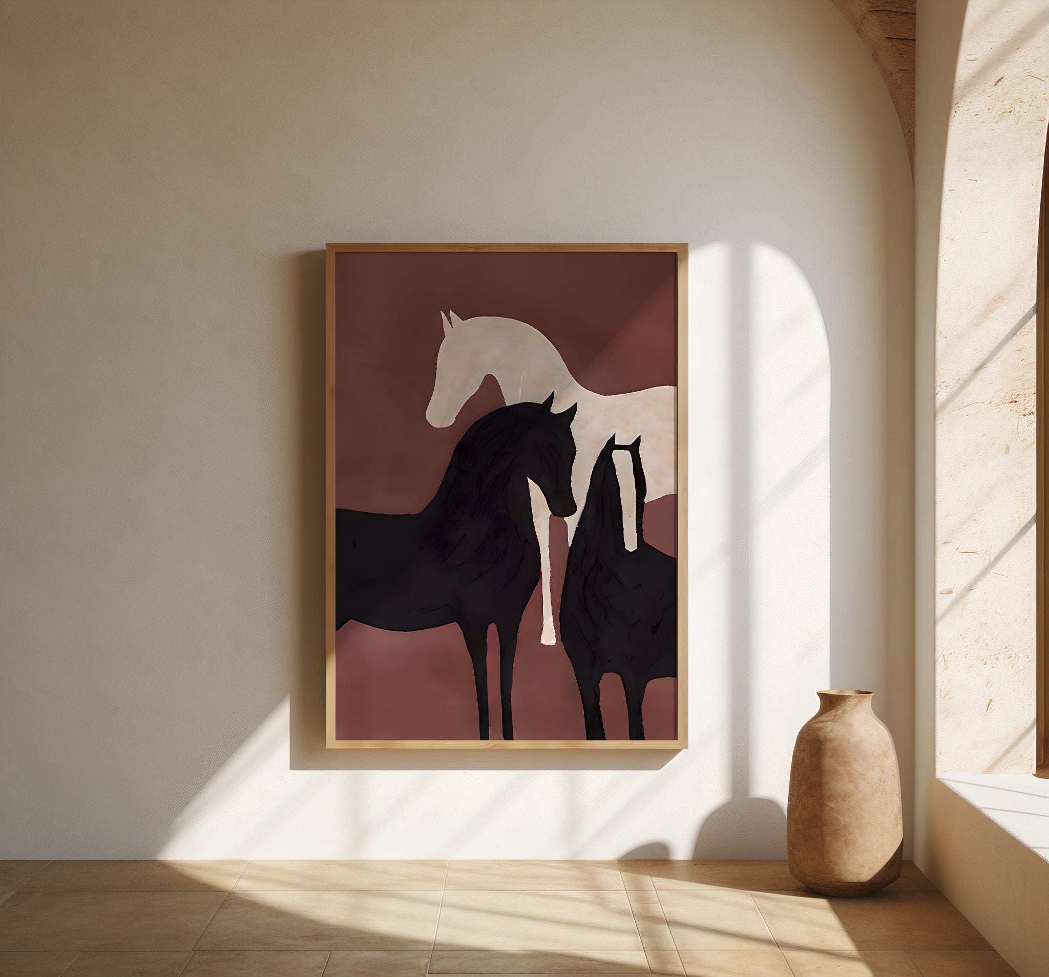 A bold yet refined minimalist equine artwork featuring layered horse silhouettes in warm neutrals and deep contrasting tones. Clean, sculptural, and timeless—designed to elevate modern, organic, and contemporary interiors.