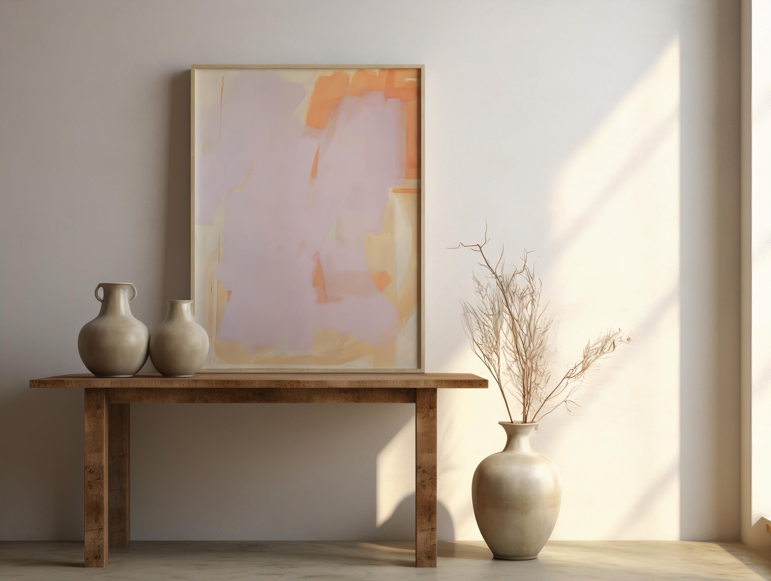 A soft, airy abstract composition in peach, blush, and warm cream tones. This framed poster brings light, warmth, and a calm modern feel to interiors that lean minimal, feminine, and aesthetic.
