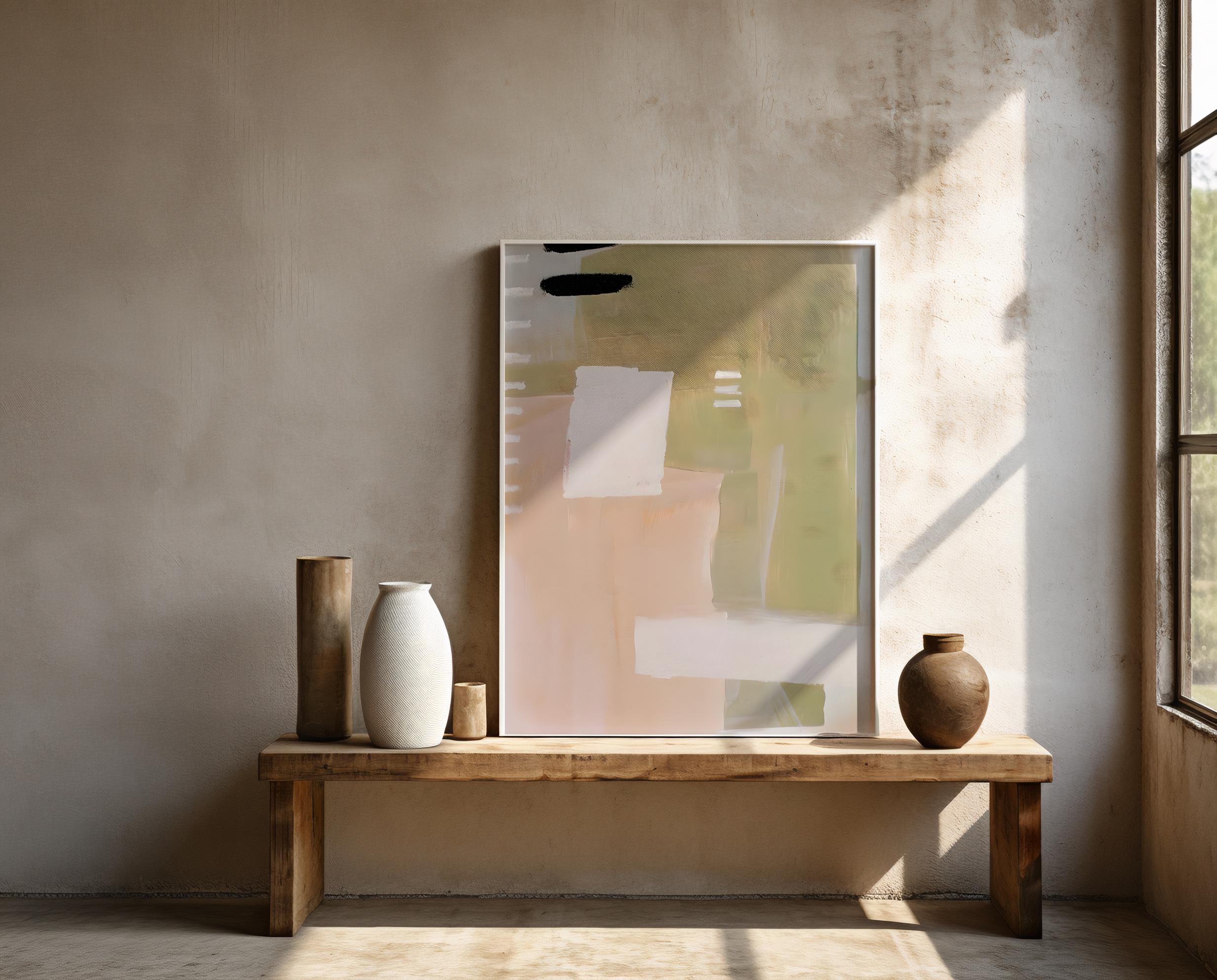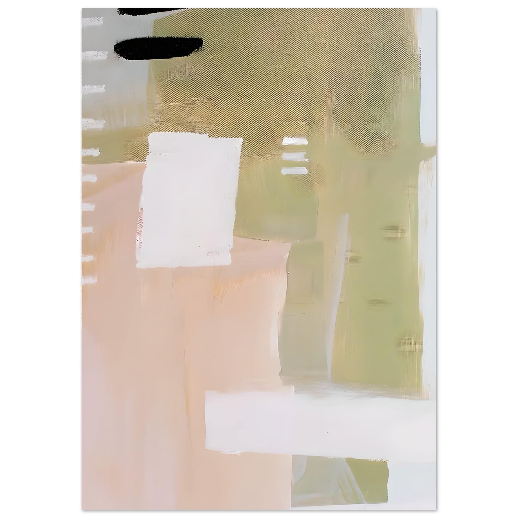 A modern abstract composition featuring soft sage green, warm beige, blush, and creamy white tones. This fine art poster brings a calm, balanced presence to a space—perfect for interiors that lean organic, minimalist, and timeless.