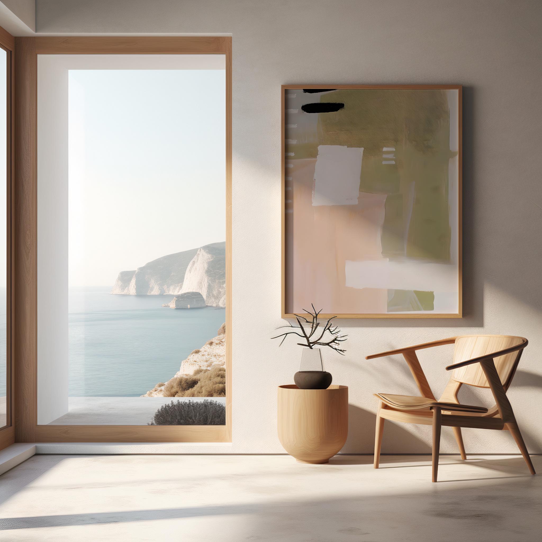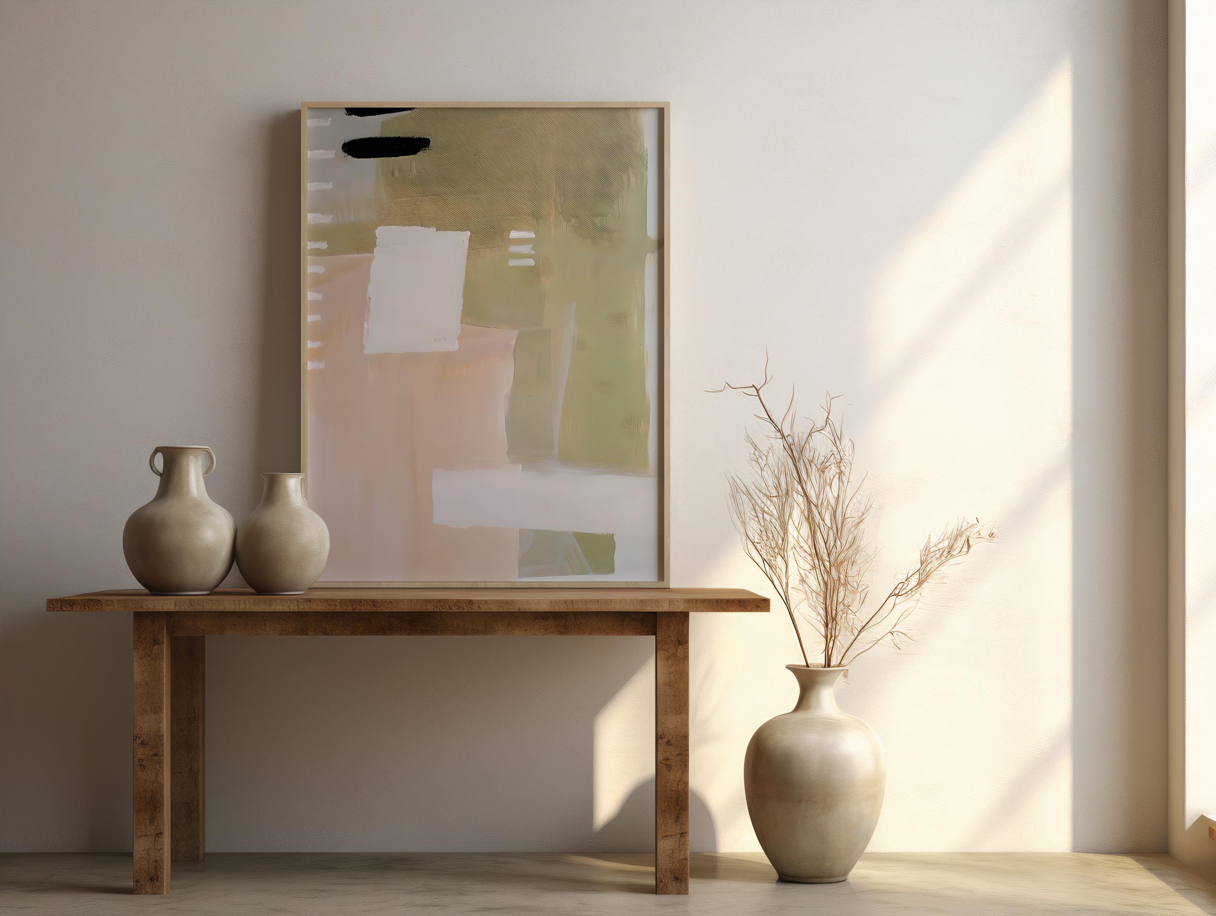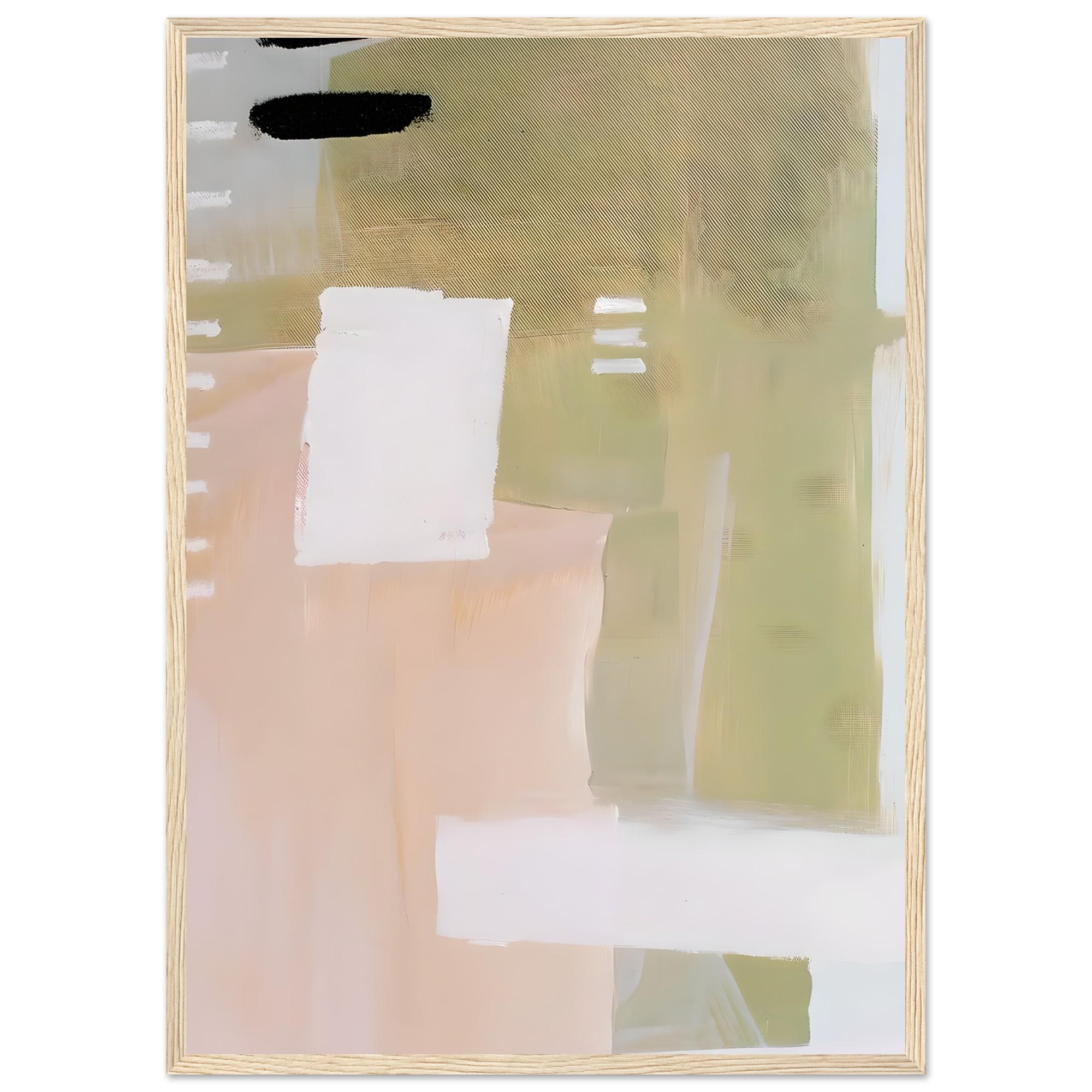 A modern abstract artwork blending soft sage green, warm beige, blush, and creamy white tones. This framed poster brings a calm, organic feel to interiors that lean minimalist, neutral, and thoughtfully styled.