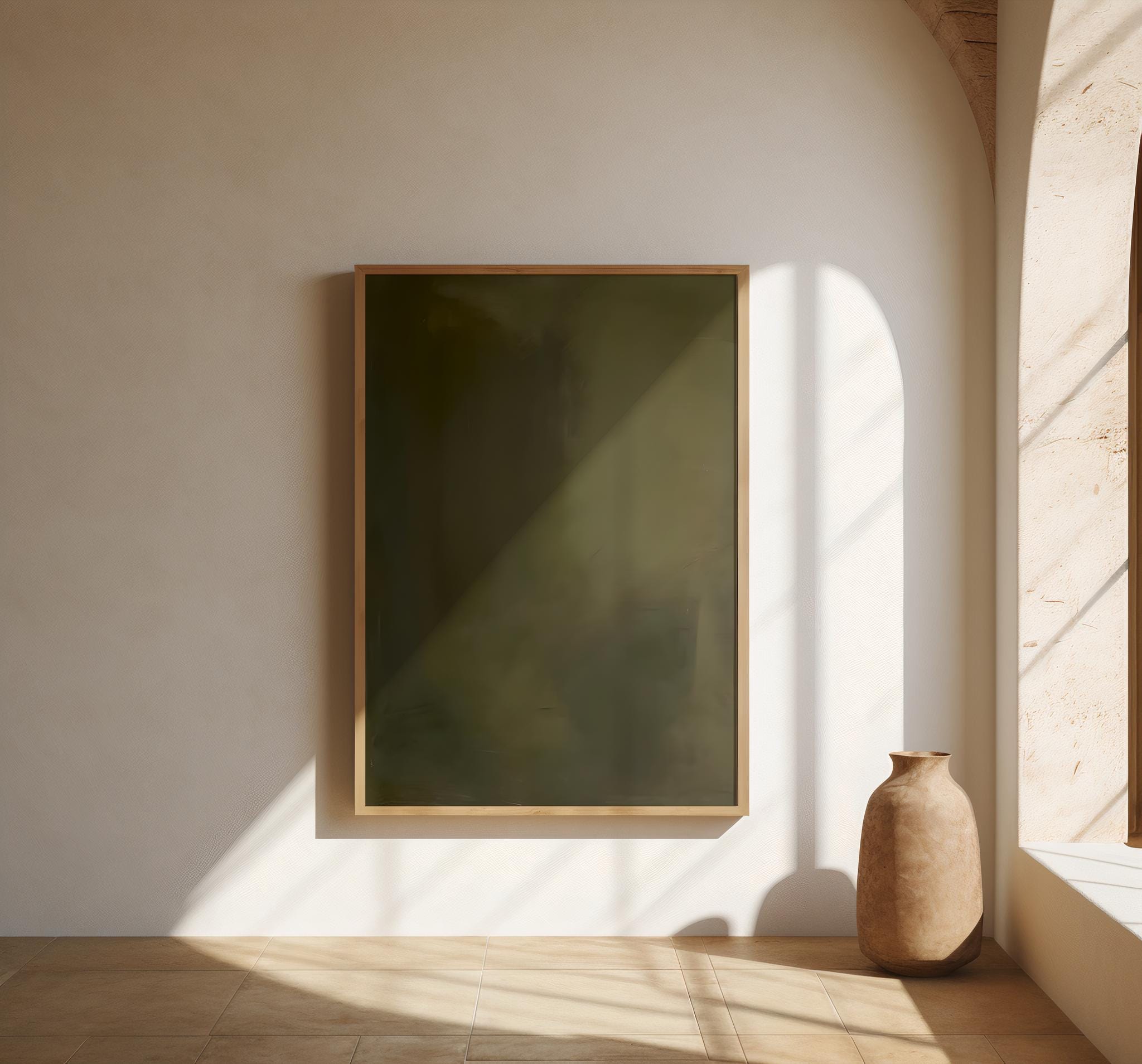 A rich, atmospheric abstract composition in deep olive, moss, and muted green tones. This fine art poster brings depth and calm to a space—perfect for interiors that lean organic, minimalist, and grounded.
