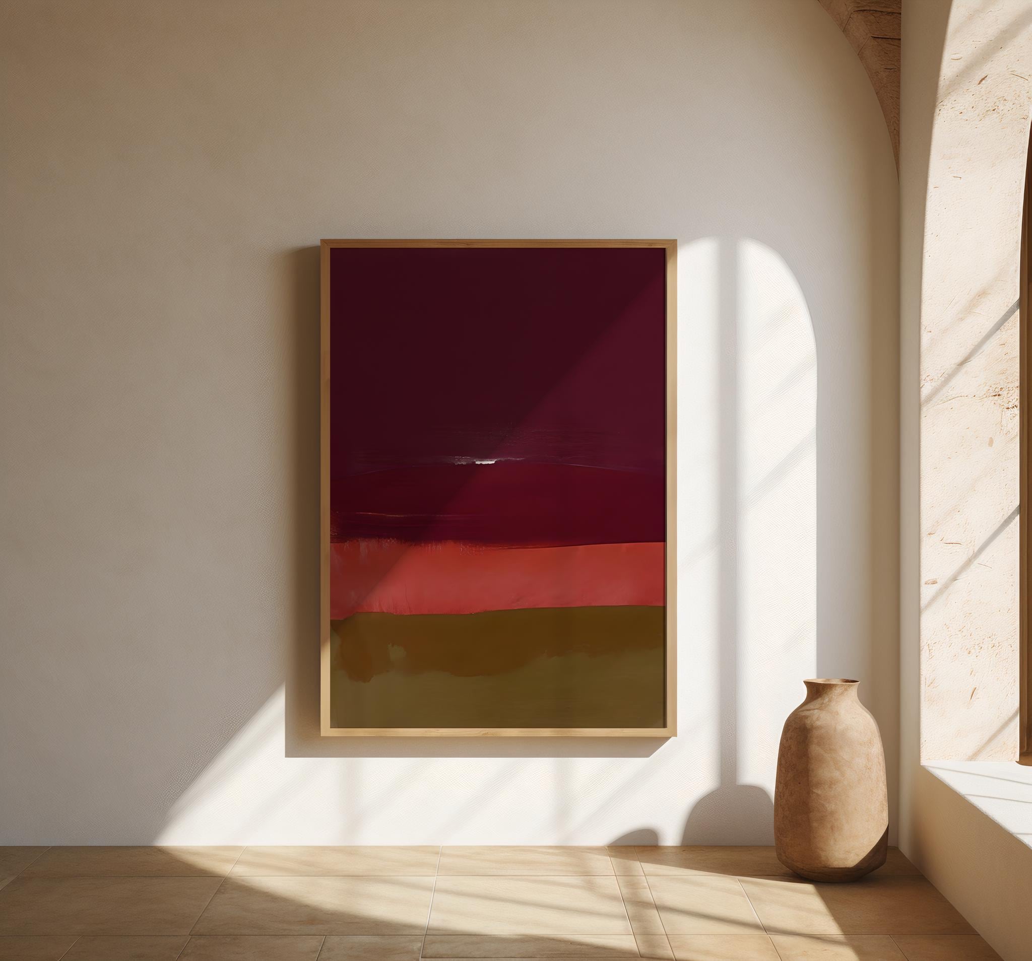 This abstract artwork features layered color fields and soft transitions that create a calm, modern sense of depth. Its balanced composition and subtle movement give it a refined, painterly feel, making it an easy statement piece for contemporary and minimalist interiors.
