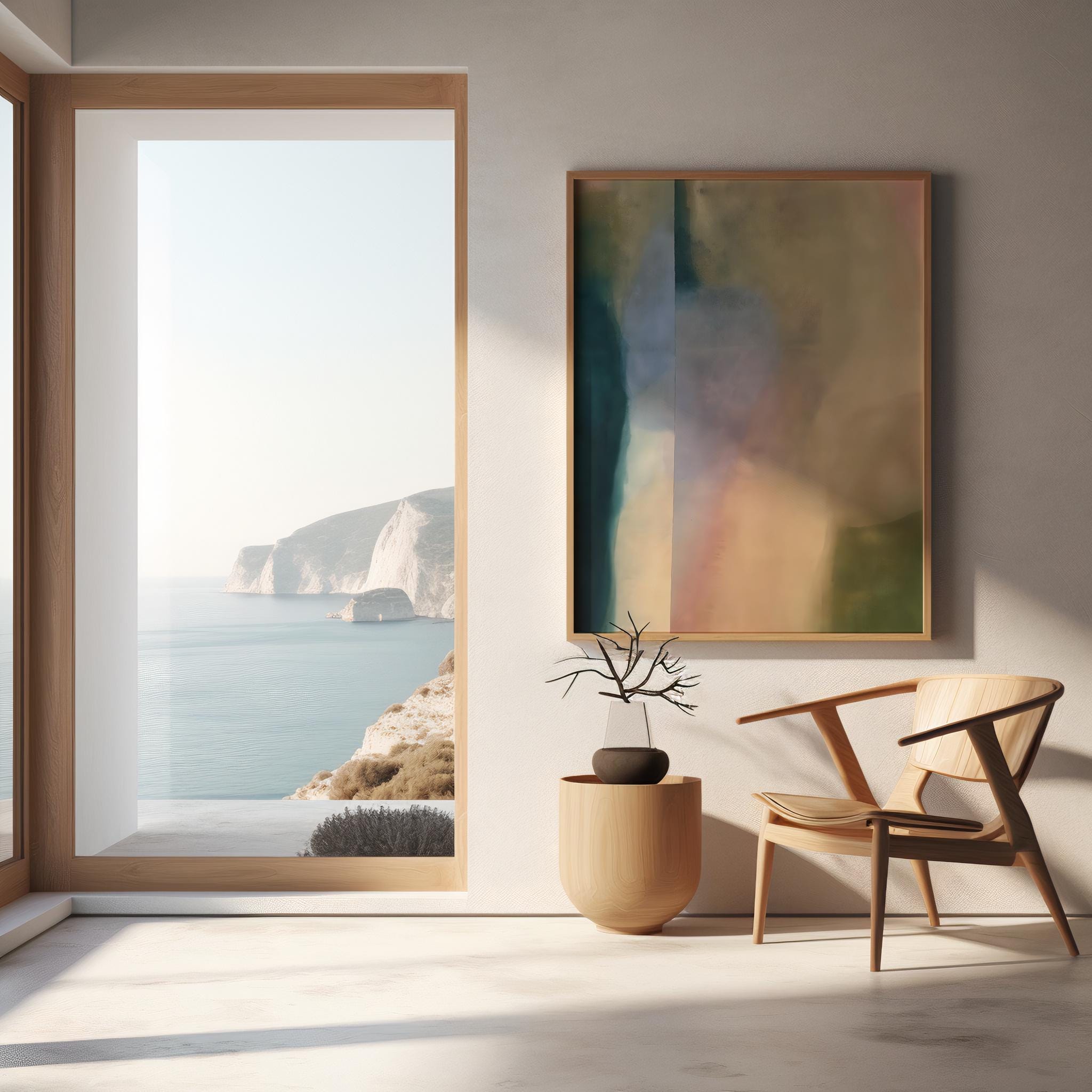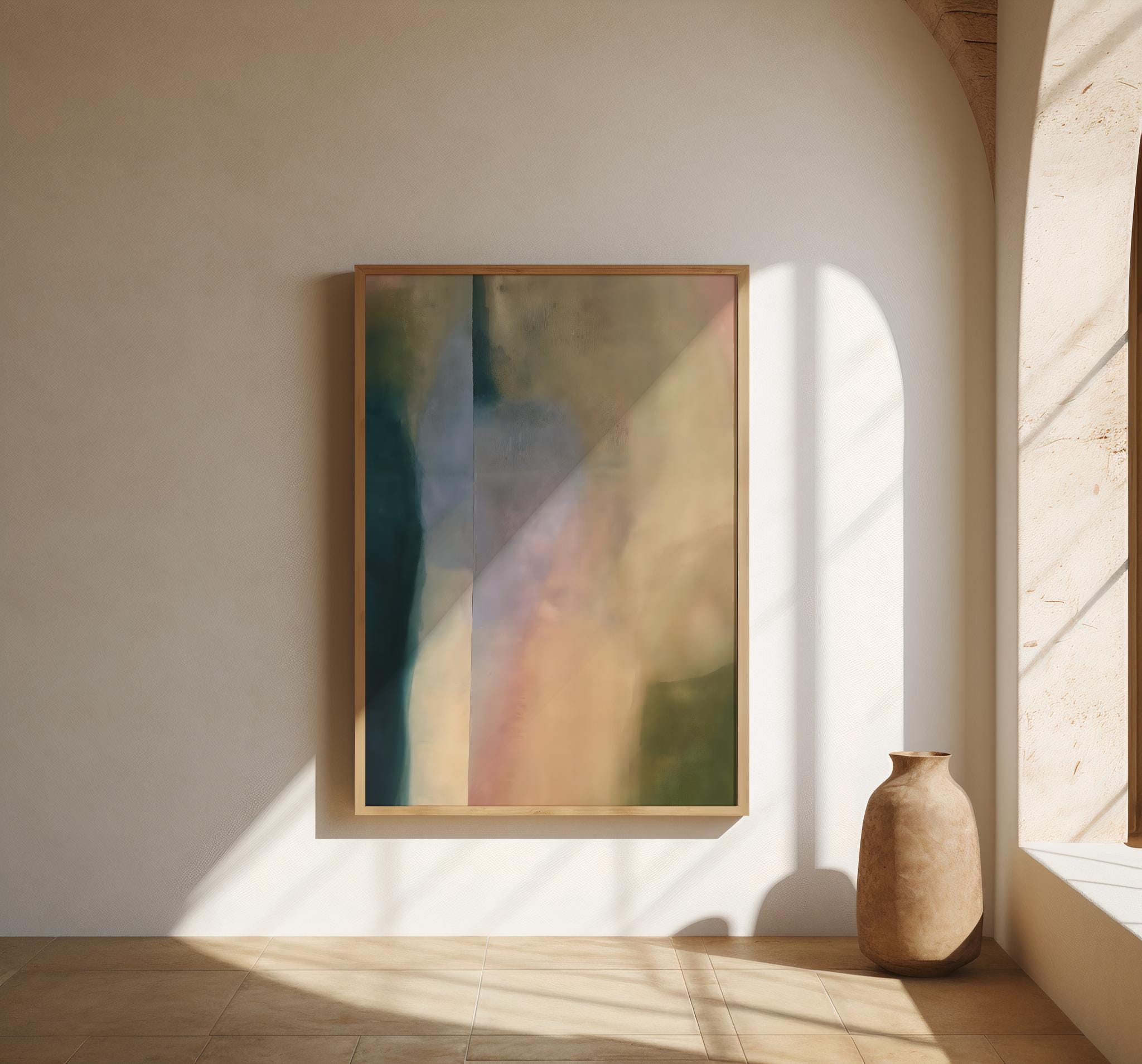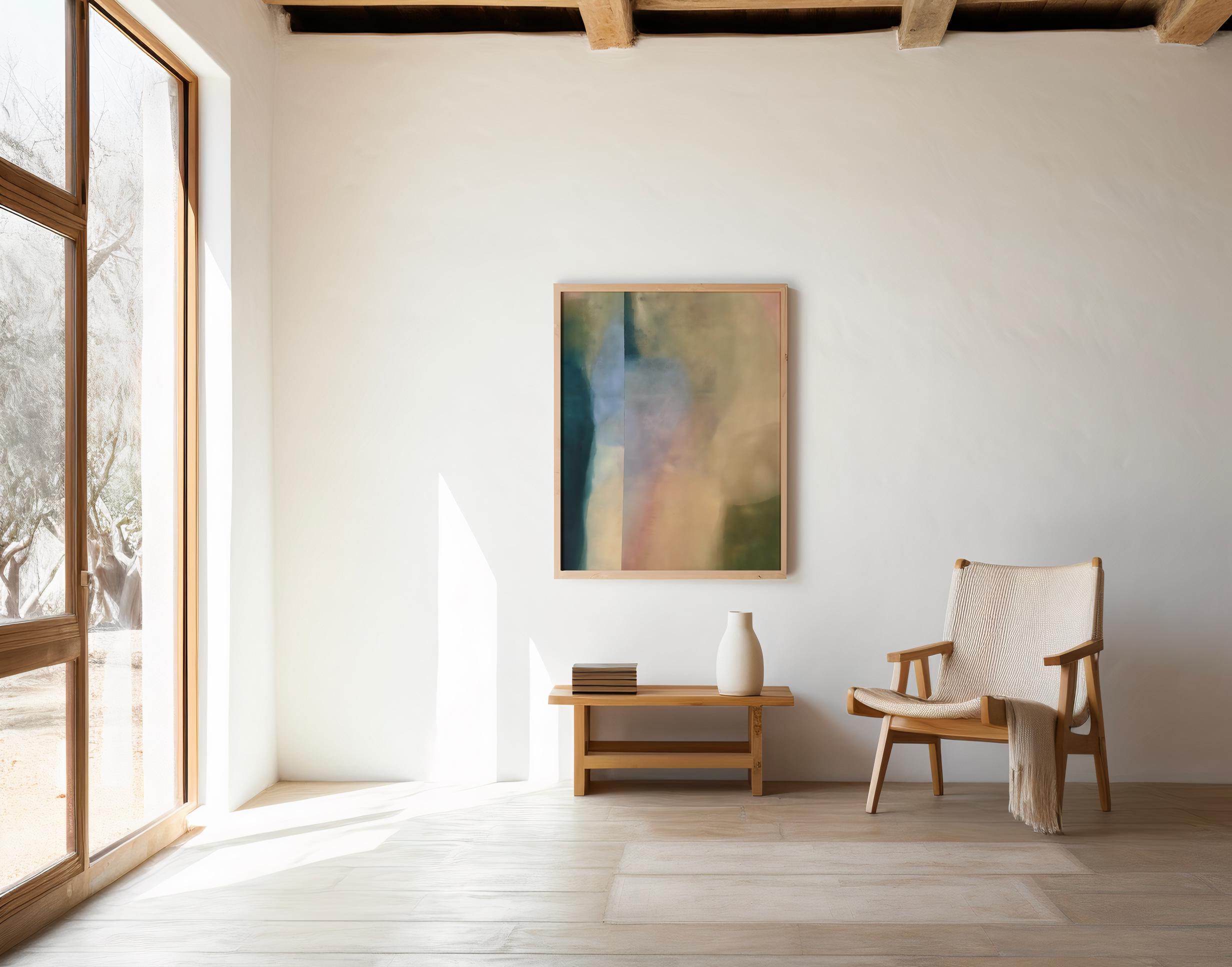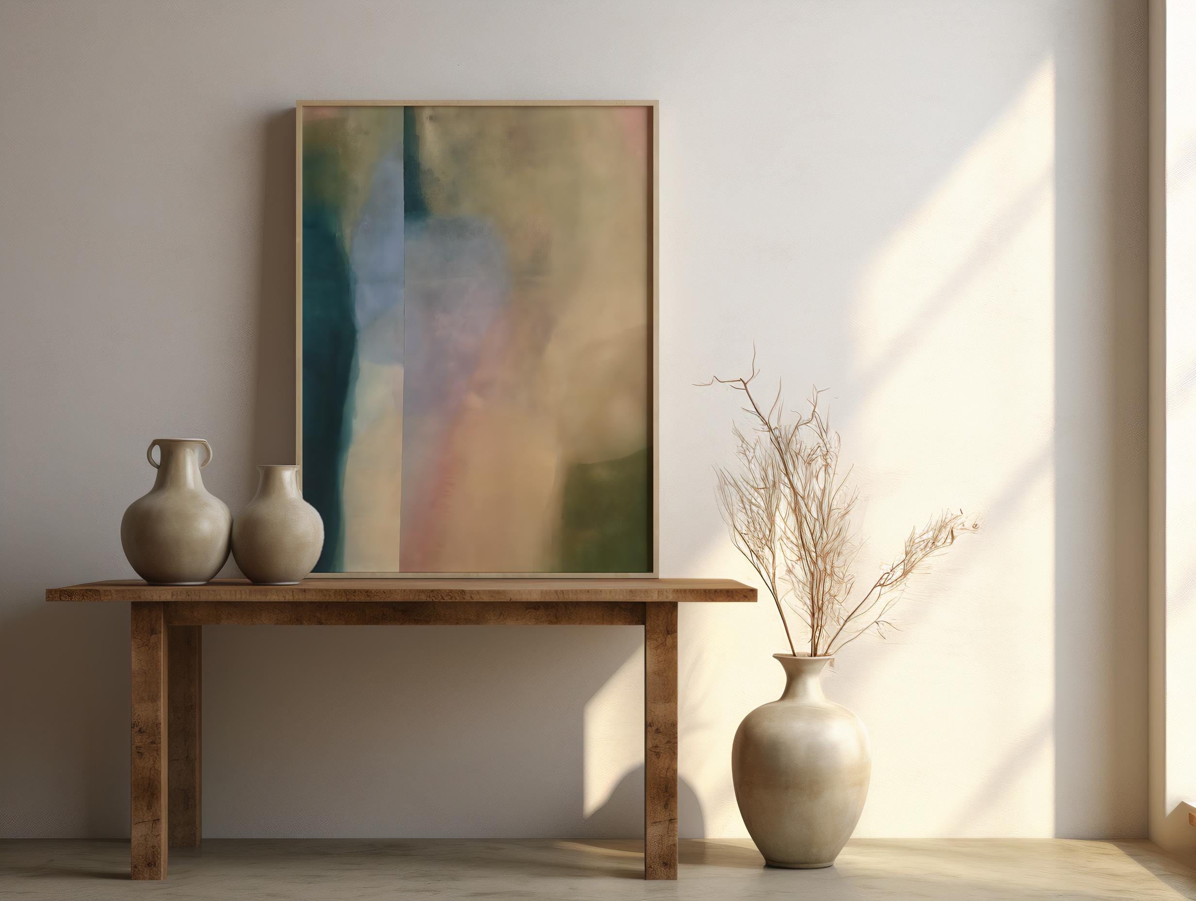 This modern abstract artwork features soft vertical color fields in muted teal, sage, sand, blush, and warm neutrals. The layered, atmospheric composition brings depth and calm while remaining minimalist and refined — ideal for contemporary, Scandinavian, and neutral interiors.