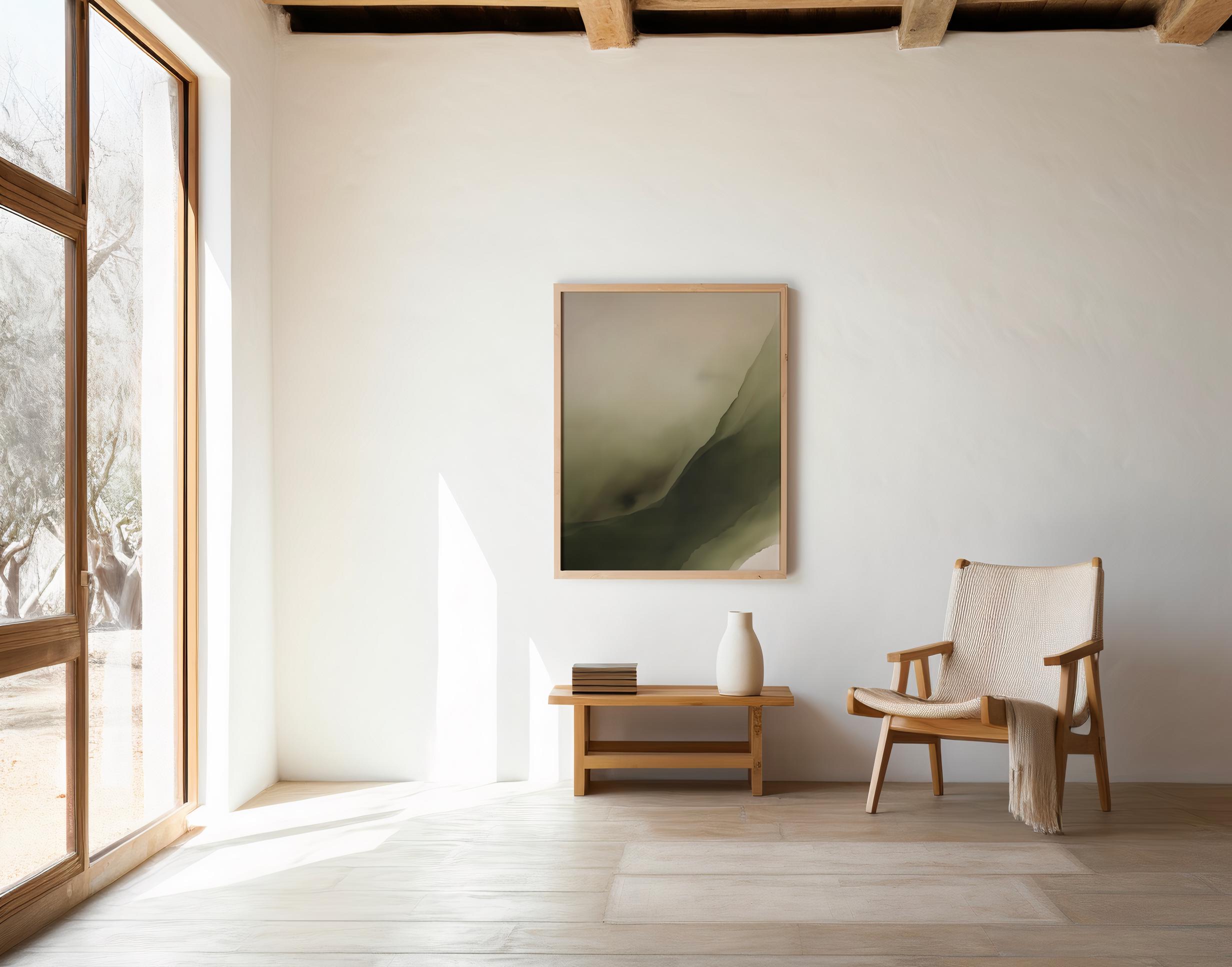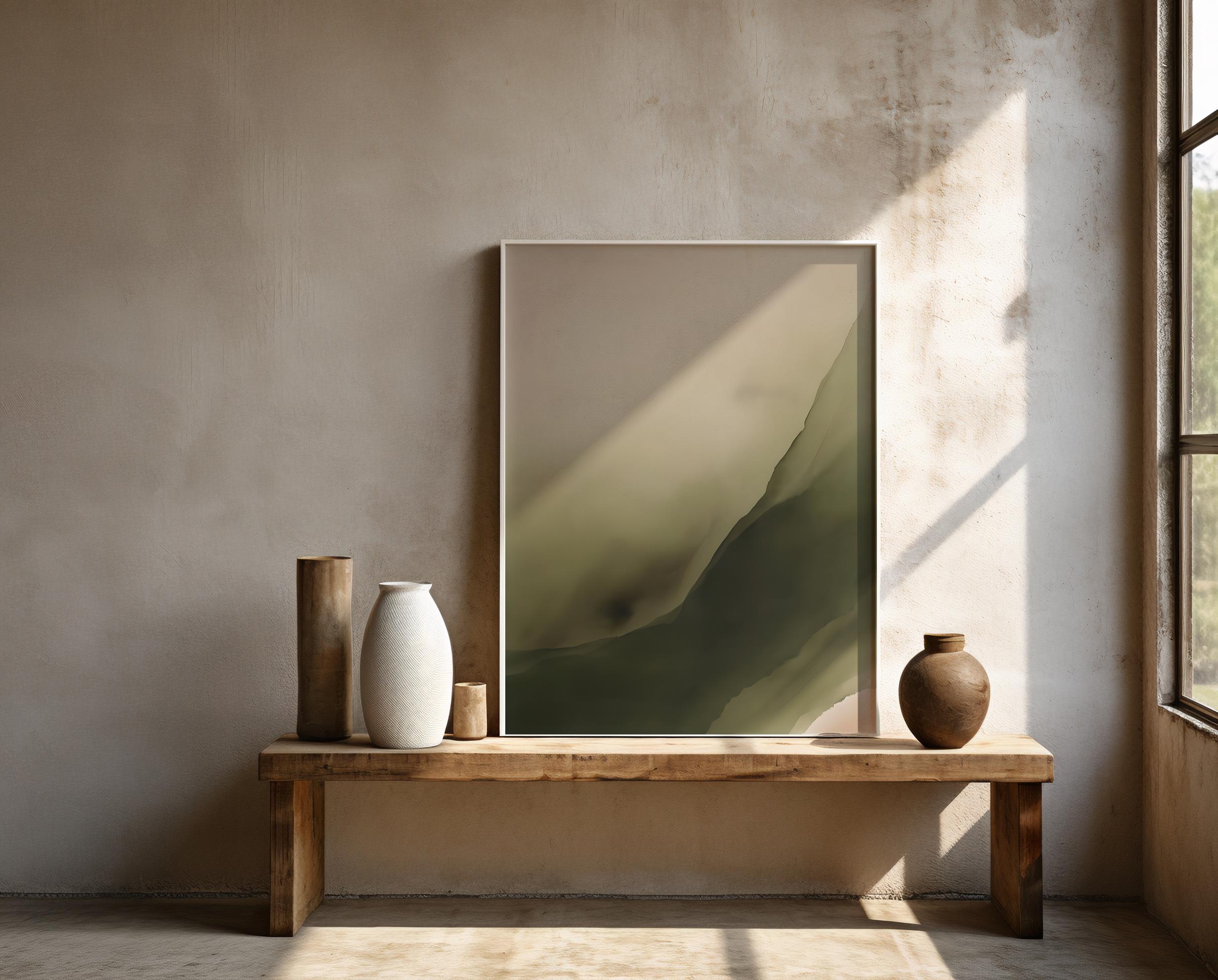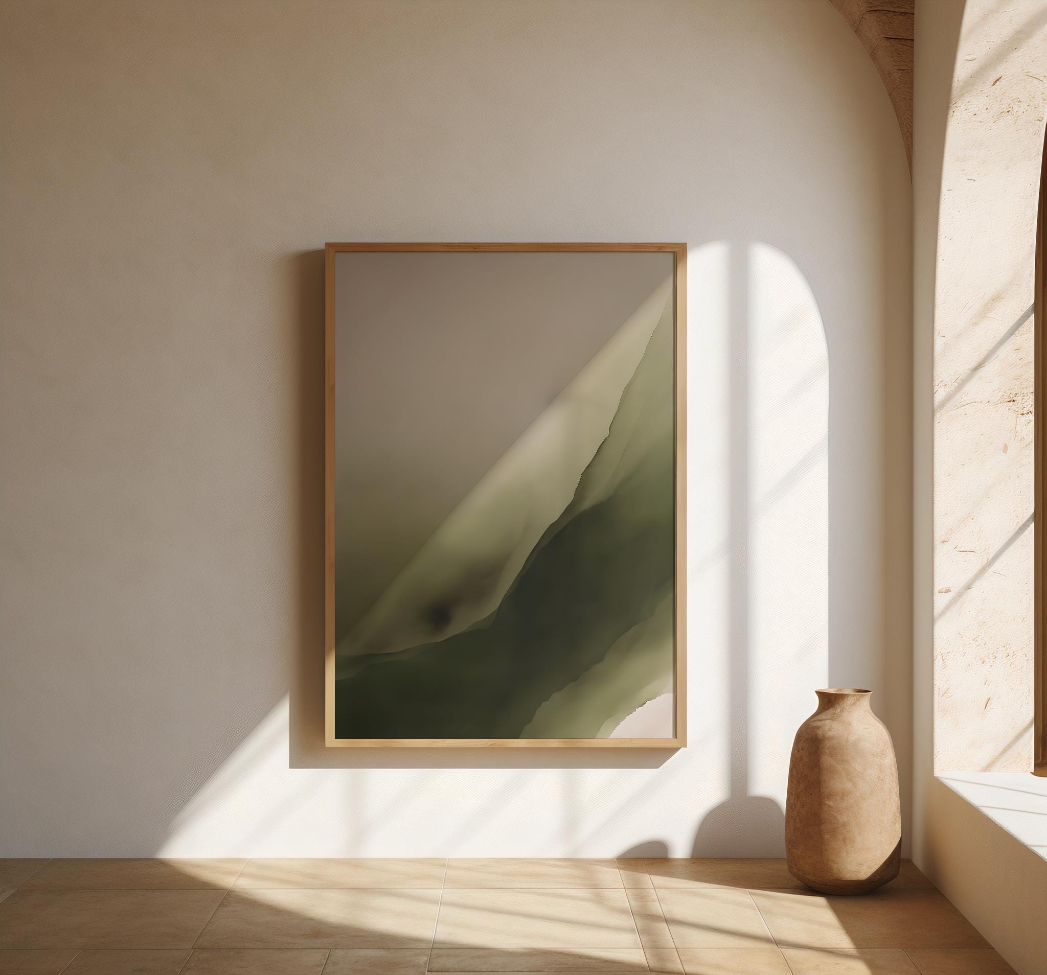 A refined abstract composition in layered sage green, olive, and soft neutral tones. This artwork evokes natural movement and quiet depth, making it ideal for calm, modern interiors. The organic forms and muted palette blend seamlessly into Scandinavian, minimalist, and contemporary spaces.