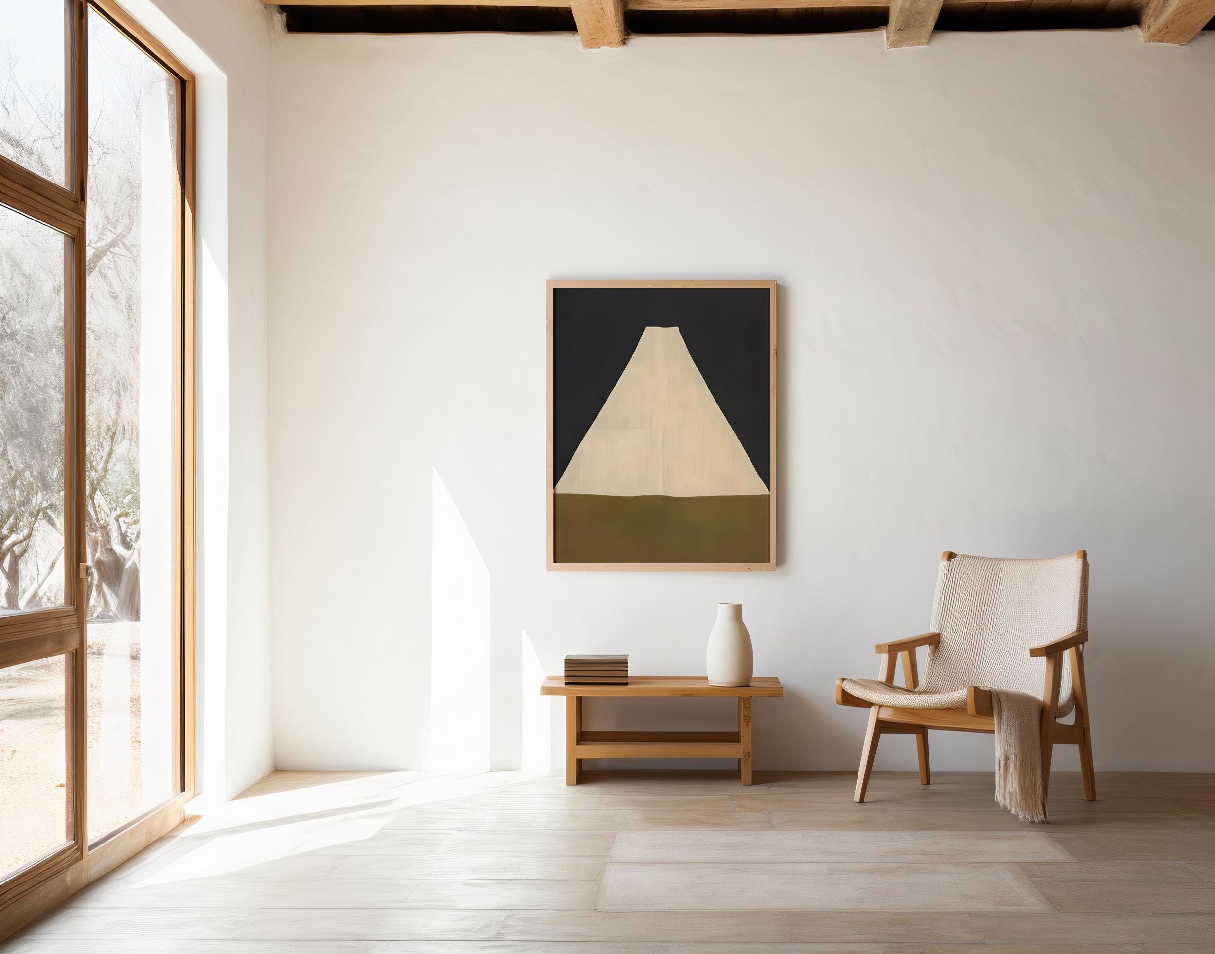 A bold yet refined geometric abstract artwork featuring soft cream tones set against deep charcoal with a warm earthy base. The minimal composition and strong contrast create a modern, architectural feel that elevates contemporary, minimalist, and design-forward interiors.