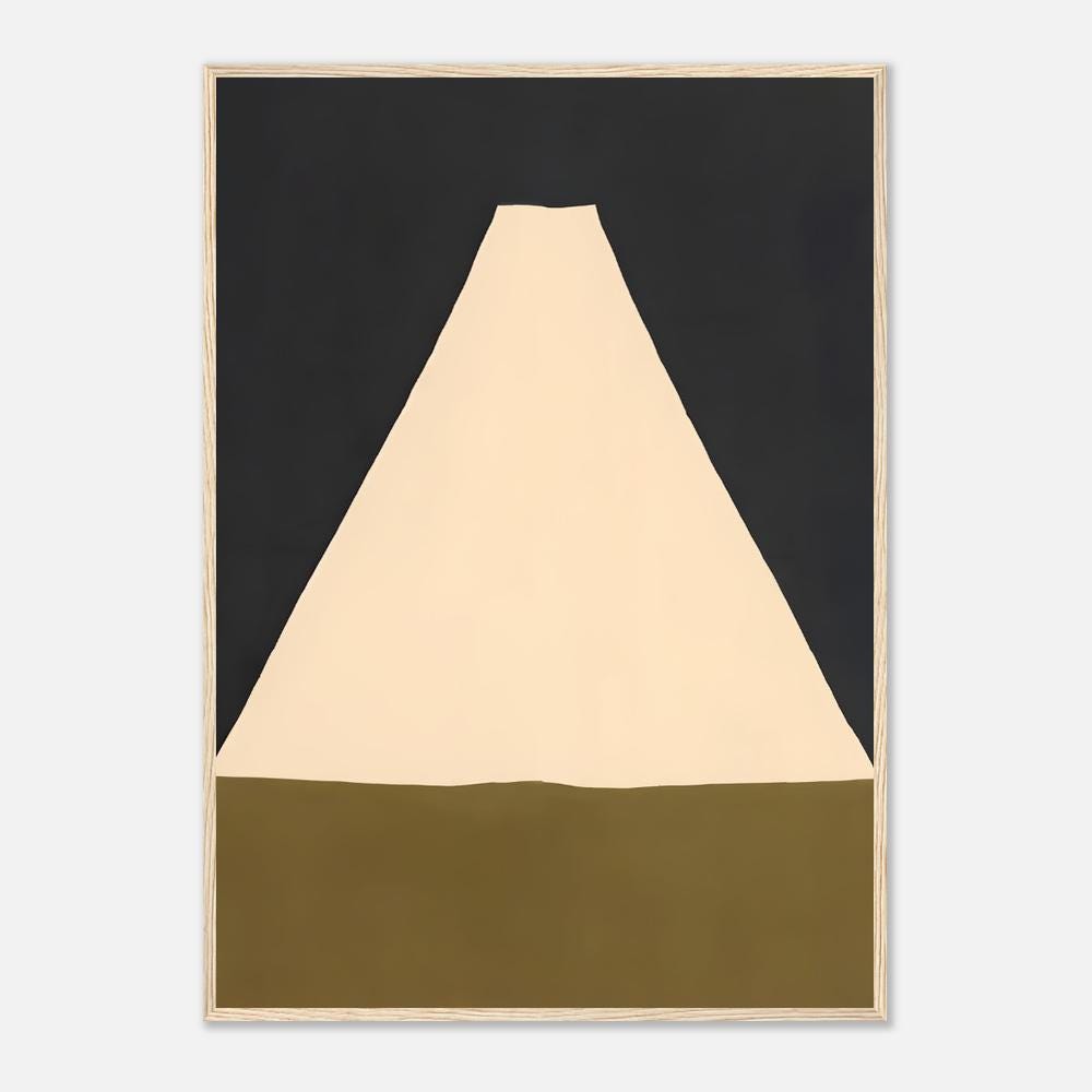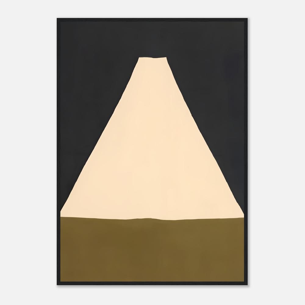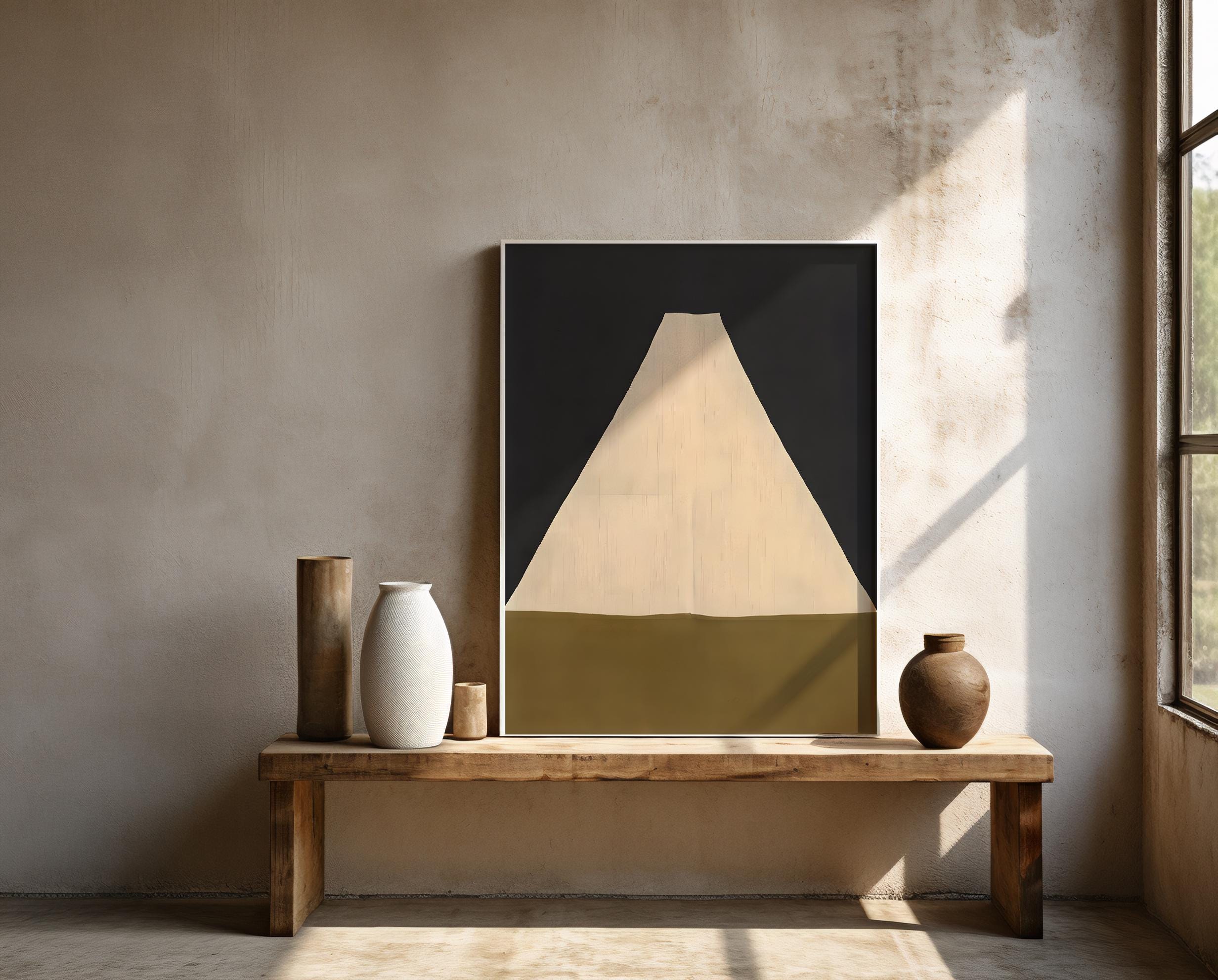 This framed geometric abstract artwork features soft cream tones contrasted against deep charcoal with a warm earthy base. The clean silhouette and balanced composition create a modern, architectural statement that feels refined and intentional—ideal for contemporary, minimalist, and design-led interiors.