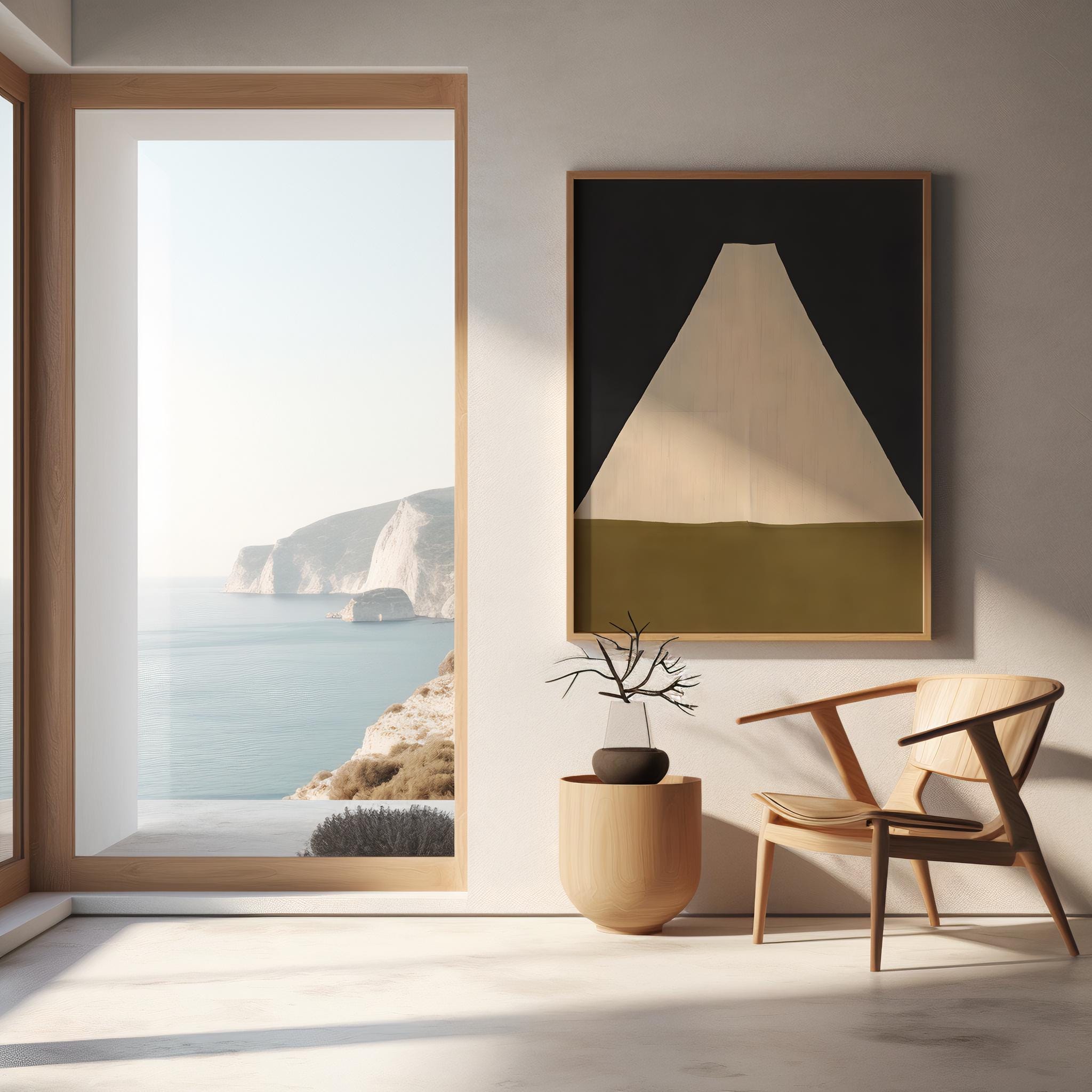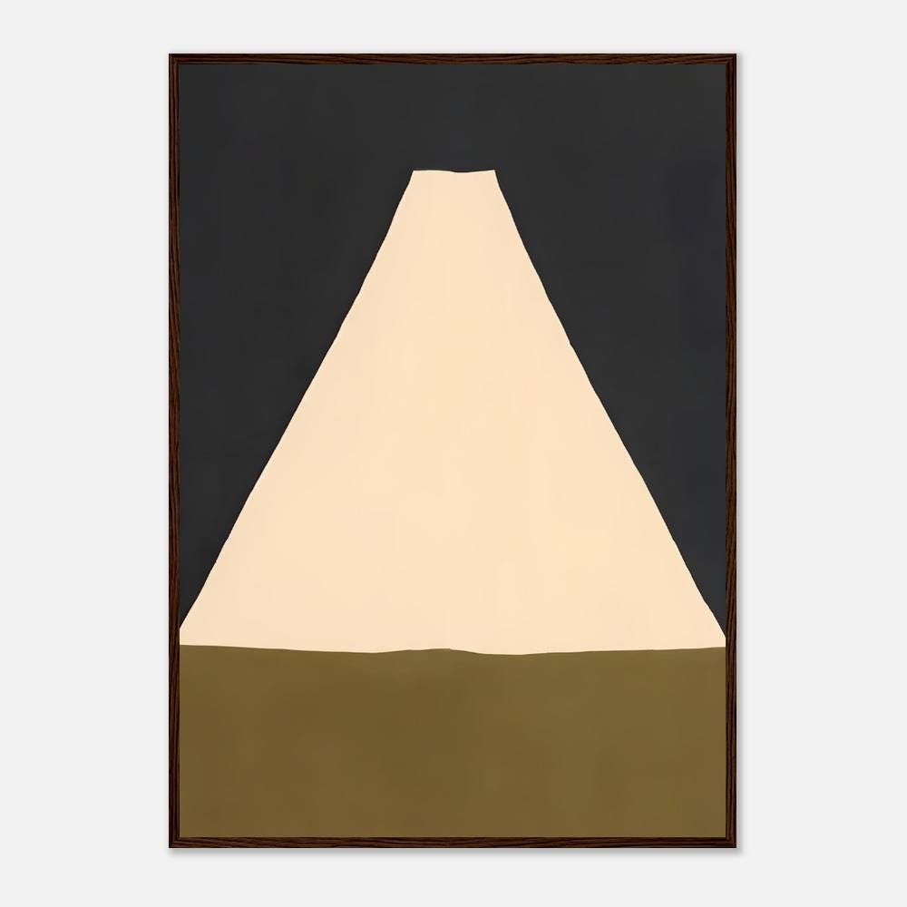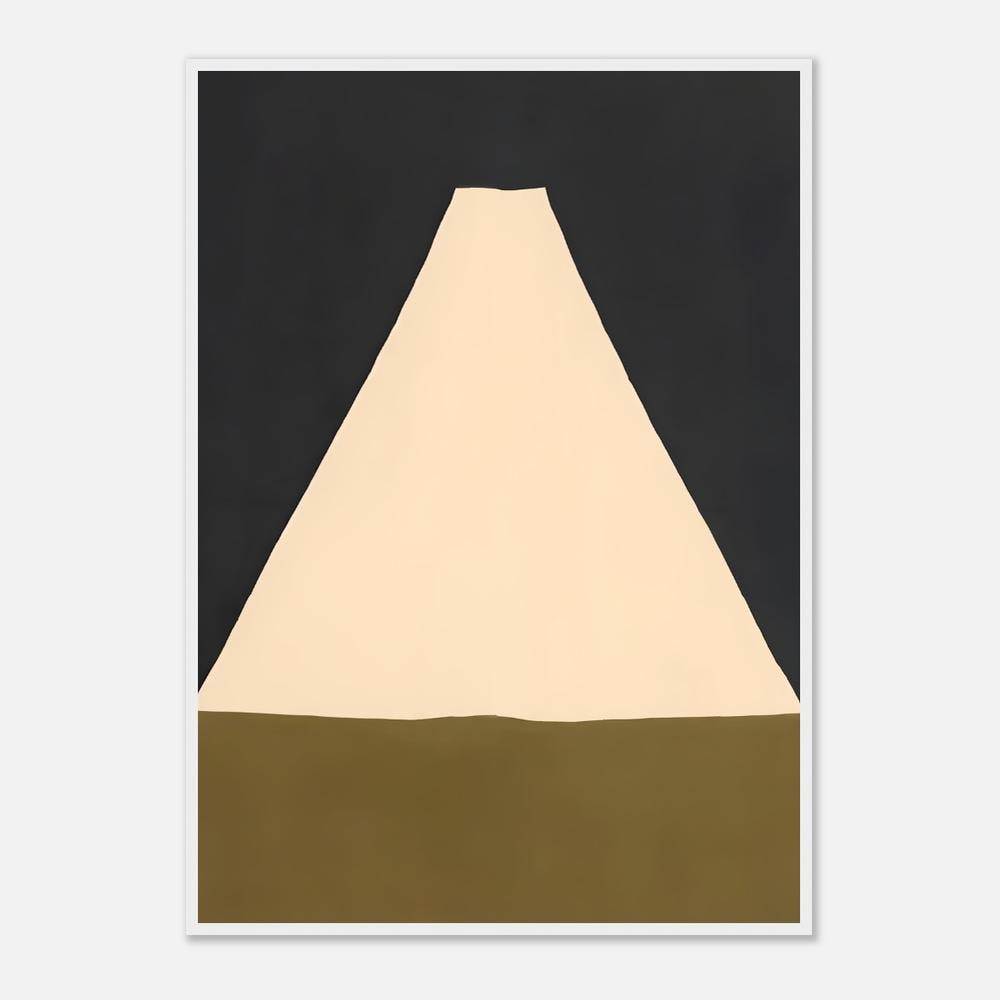 This framed geometric abstract artwork features soft cream tones contrasted against deep charcoal with a warm earthy base. The clean silhouette and balanced composition create a modern, architectural statement that feels refined and intentional—ideal for contemporary, minimalist, and design-led interiors.
