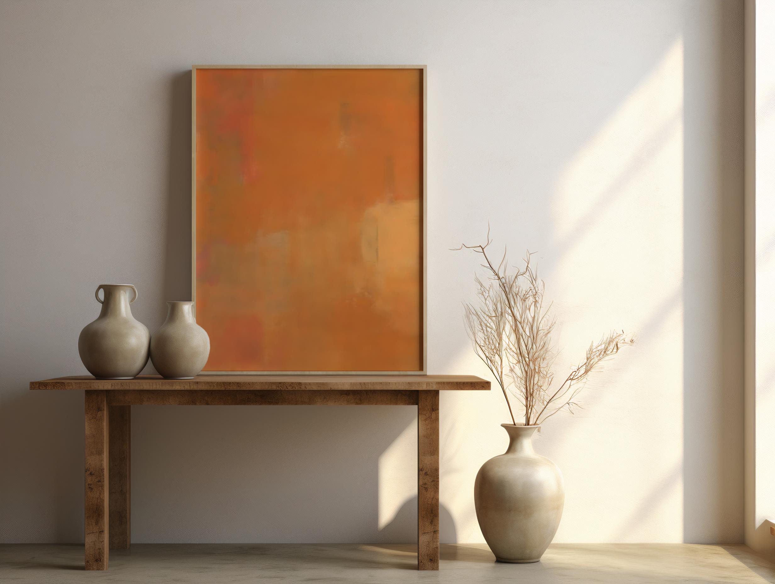 A warm, minimalist abstract composition featuring layered shades of orange, amber, and soft golden tones. Subtle gradients and painterly transitions create a calm yet expressive design that brings warmth, depth, and modern character to refined interiors.
