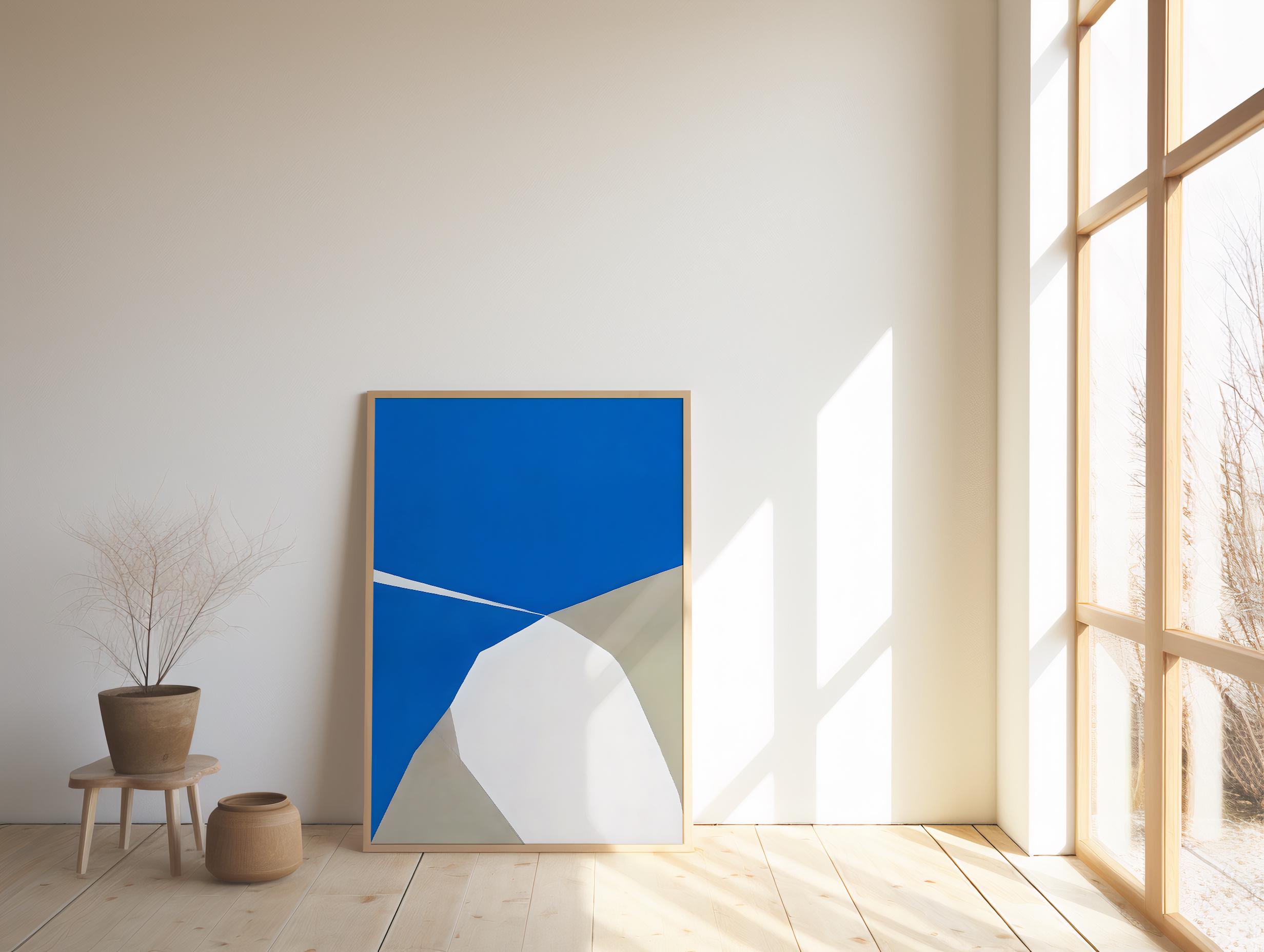 A modern abstract composition featuring rich cobalt blue balanced with soft beige and warm off-white tones. Clean intersections and smooth color fields create a refined, architectural look with a calm, minimalist presence—designed for elevated, contemporary interiors.