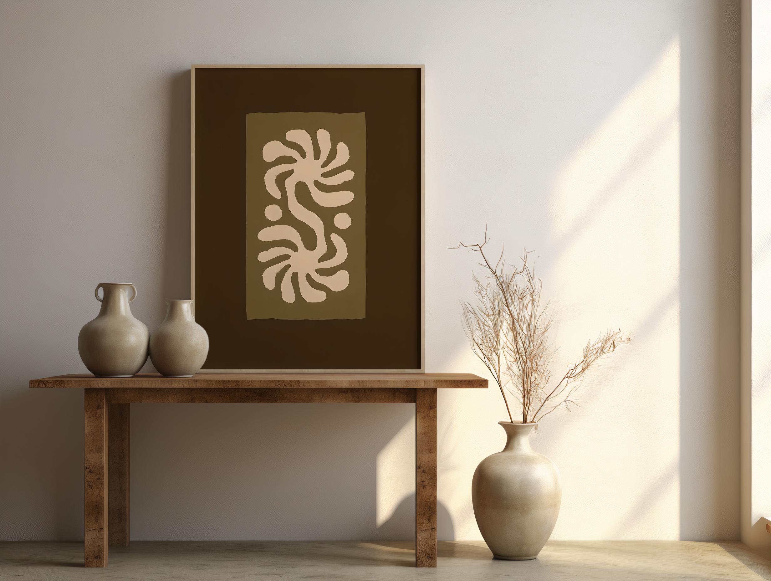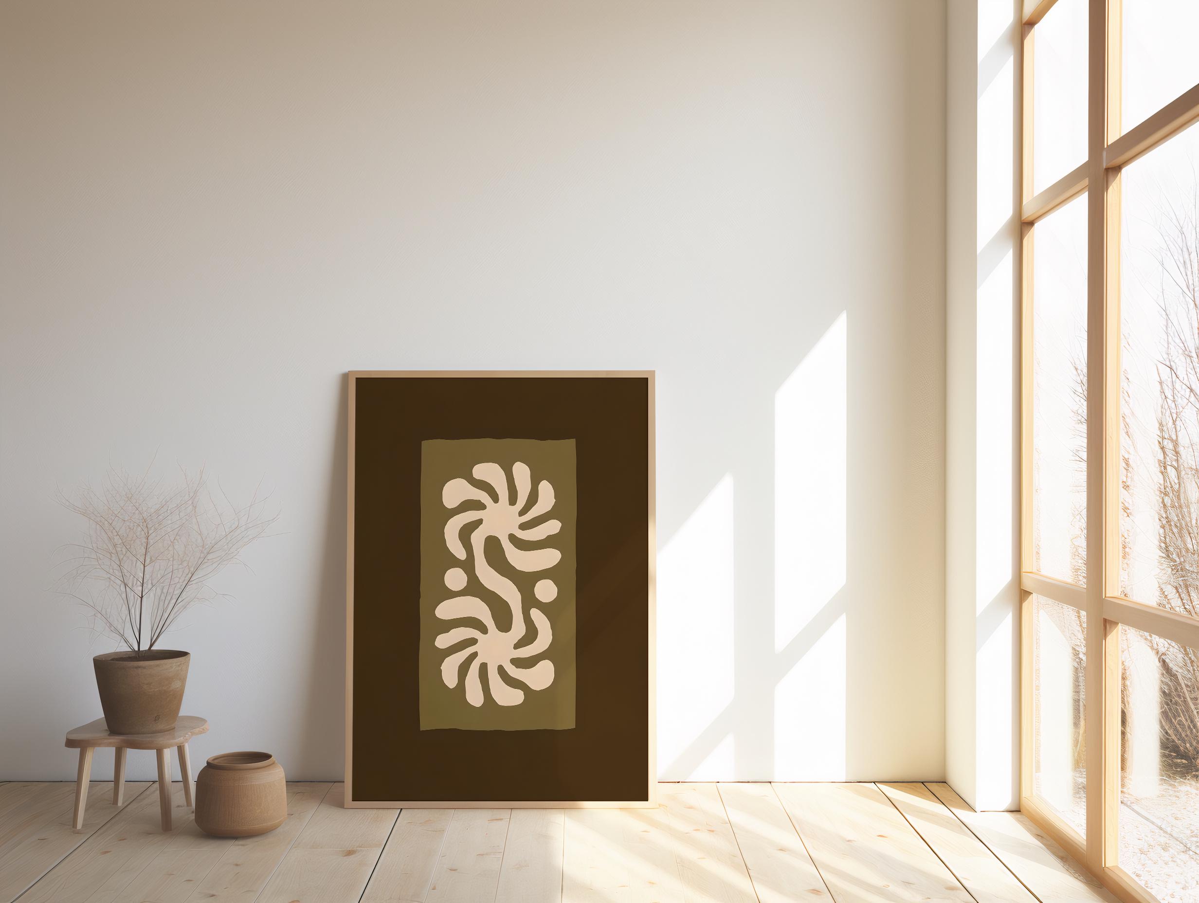 An organic abstract composition featuring warm brown and olive tones paired with soft cream shapes arranged in a fluid, playful rhythm. The bold yet minimal forms create an earthy, modern aesthetic that feels artistic, relaxed, and design-forward—ideal for curated, contemporary interiors.