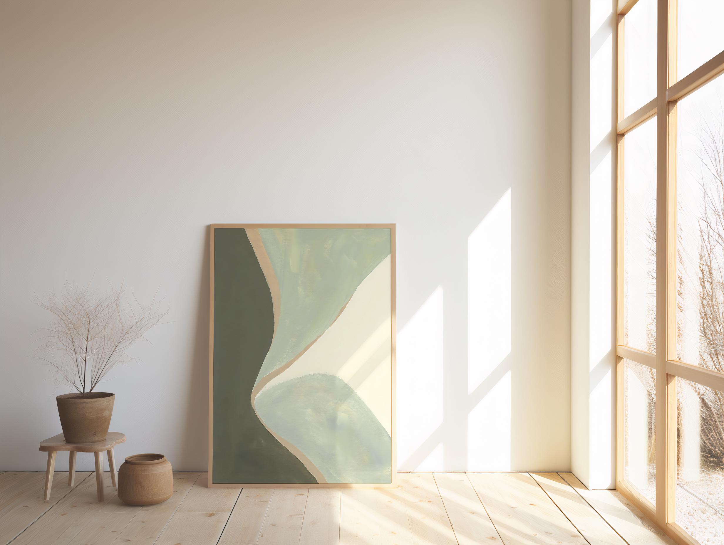 A soft, organic abstract composition featuring sage green, muted olive, cream, and subtle sand tones flowing in gentle curves. The calm palette and smooth transitions create a serene, spa-like aesthetic—perfect for modern, neutral, and design-forward interiors.