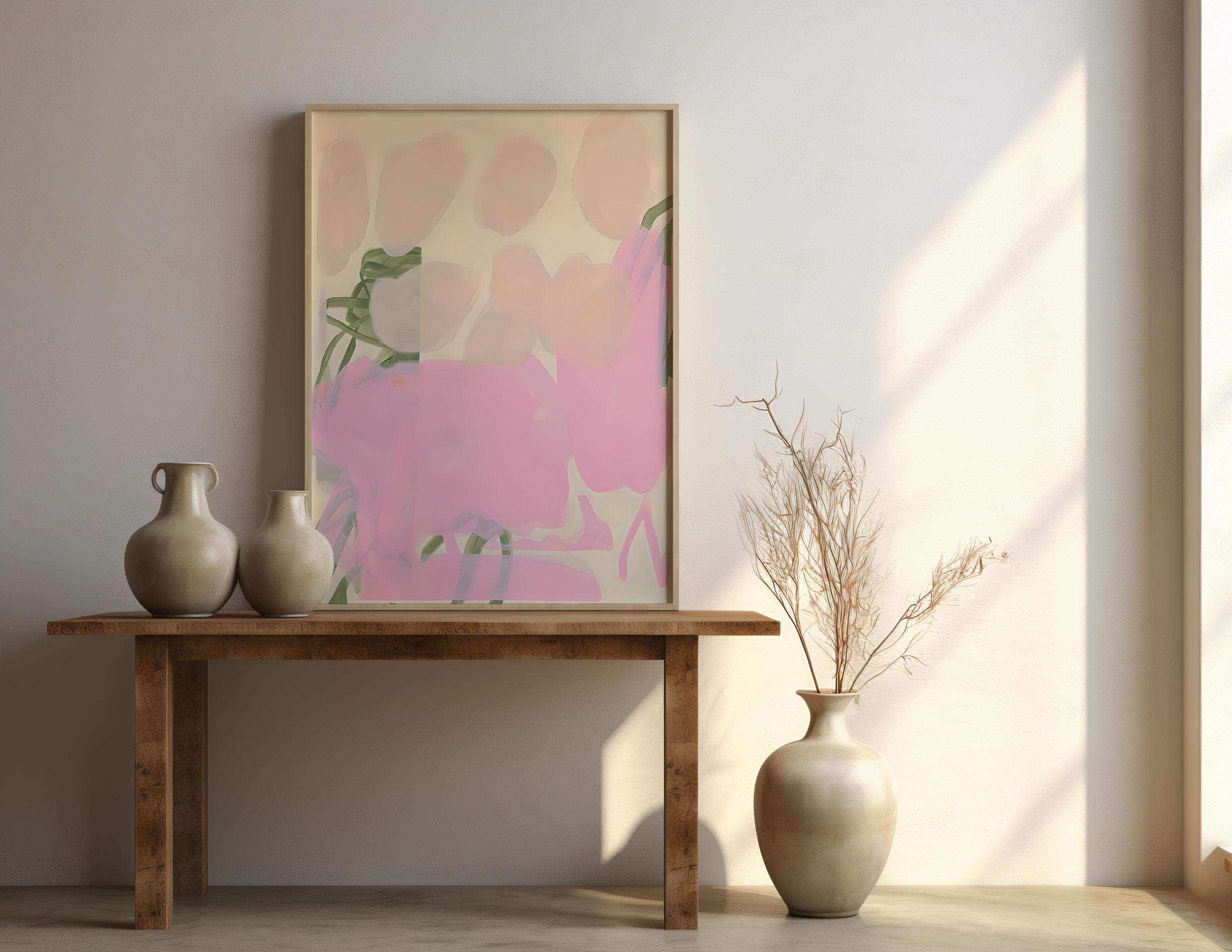 A soft, modern abstract artwork printed as a fine art poster on premium matte paper. Featuring blush pink, warm cream, muted sage green, and airy neutral tones, this piece uses gentle painterly layers and organic shapes to create a calm, elevated look designed for light, minimalist interiors.