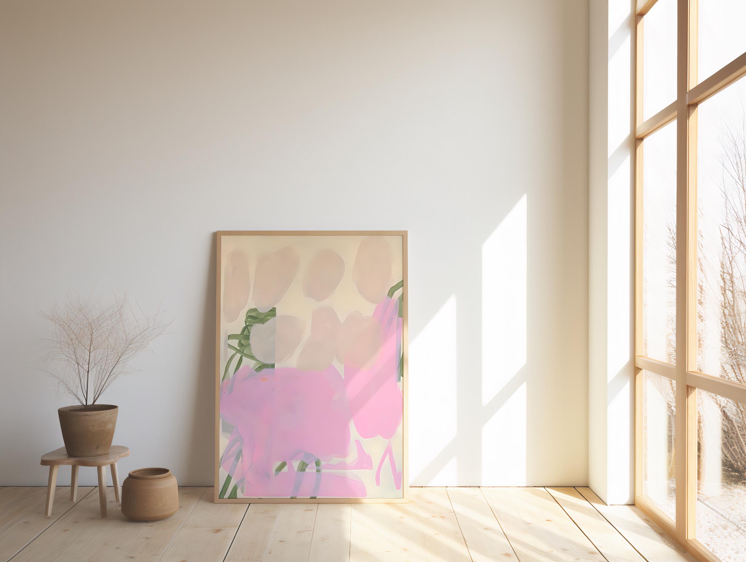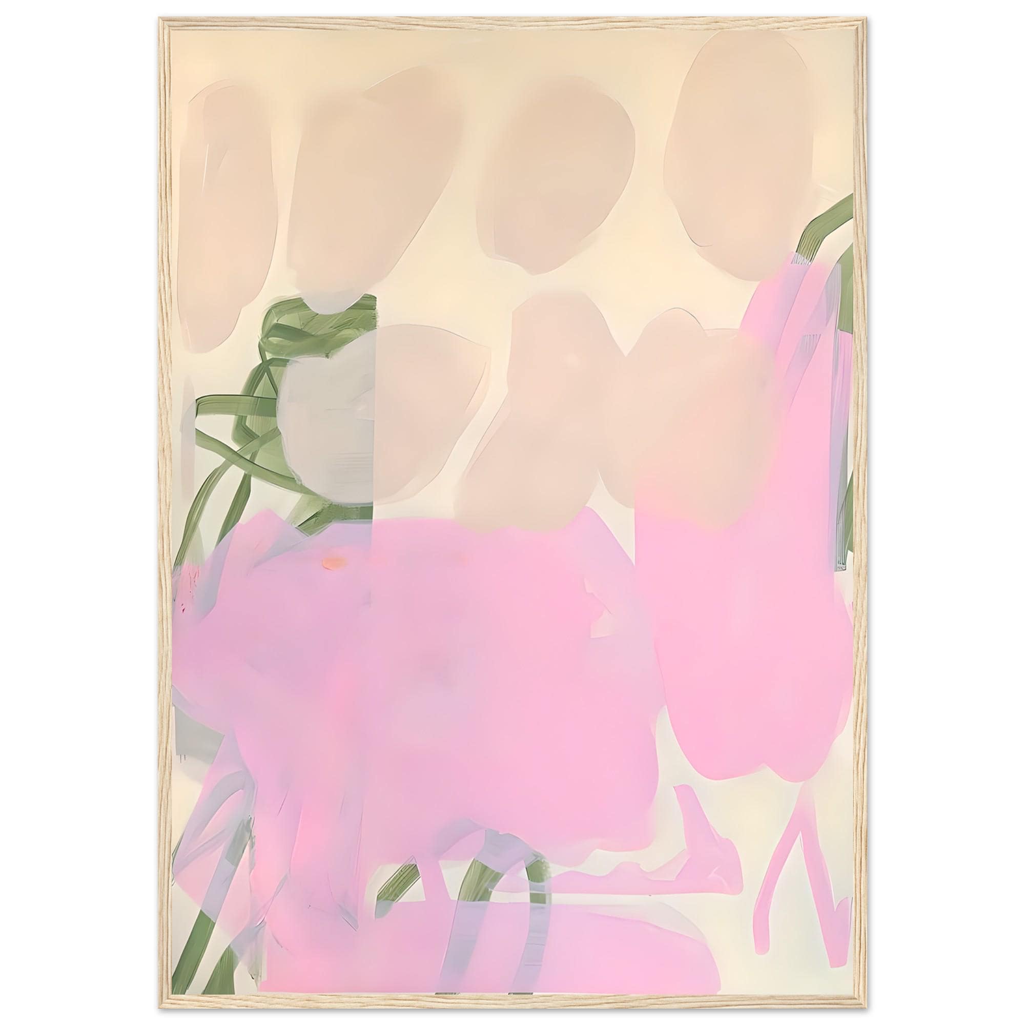A soft, modern abstract artwork printed as a fine art poster and professionally framed for a clean, gallery-ready presentation. Featuring blush pink, warm cream, muted sage green, and airy neutral tones, this piece uses gentle painterly layers and organic shapes to create a calm, elevated look designed for light, minimalist, and design-forward interiors.