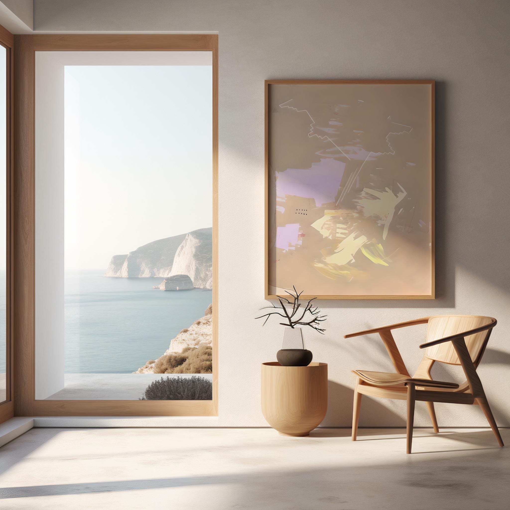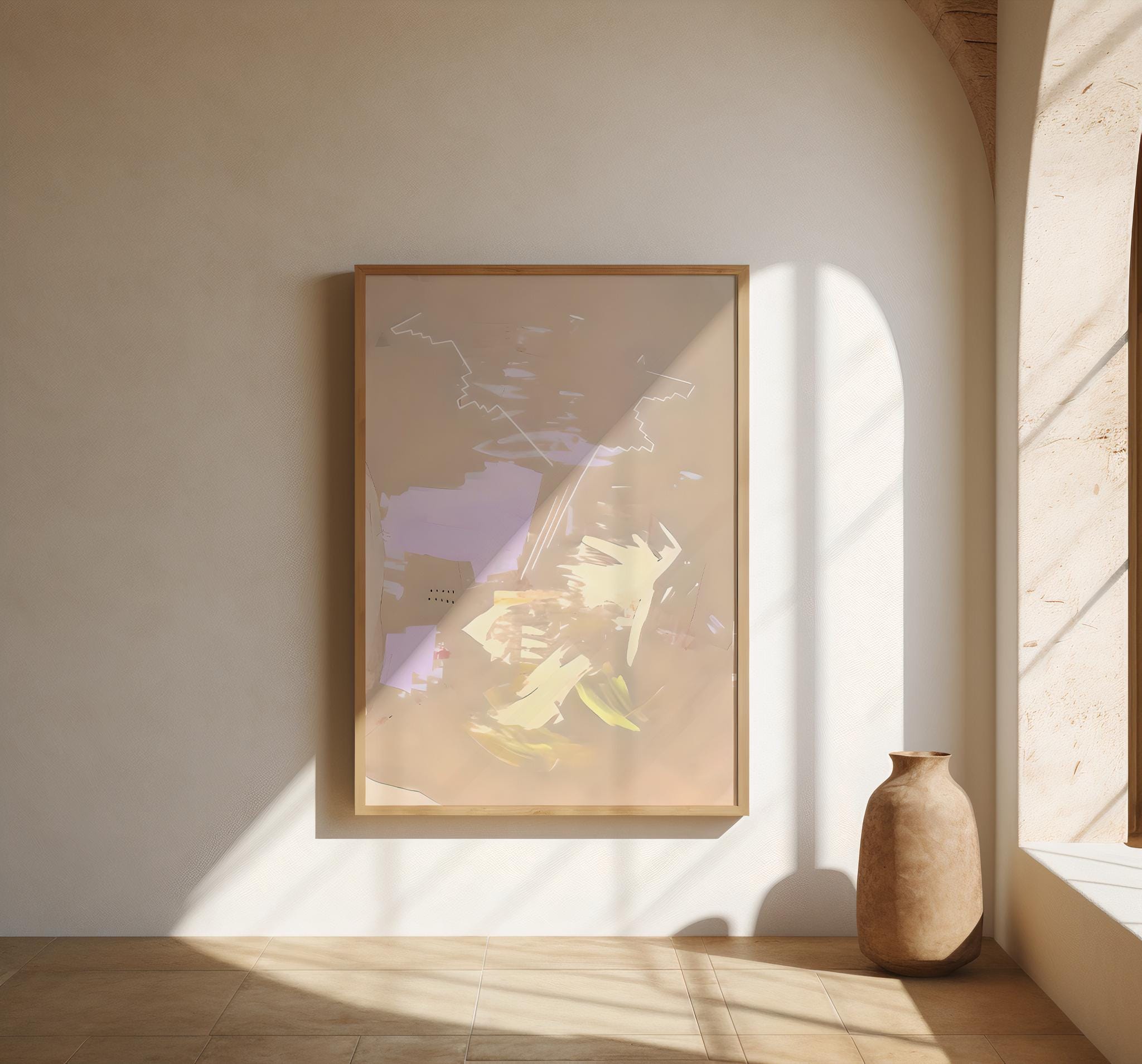 A soft, minimal abstract artwork featuring light beige, warm sand, creamy neutrals, and faint blush-lavender undertones. Gentle painterly layers and subtle brush movement create an airy, understated composition that feels calm, spacious, and refined. Designed to blend seamlessly into neutral, minimalist, and modern interiors.