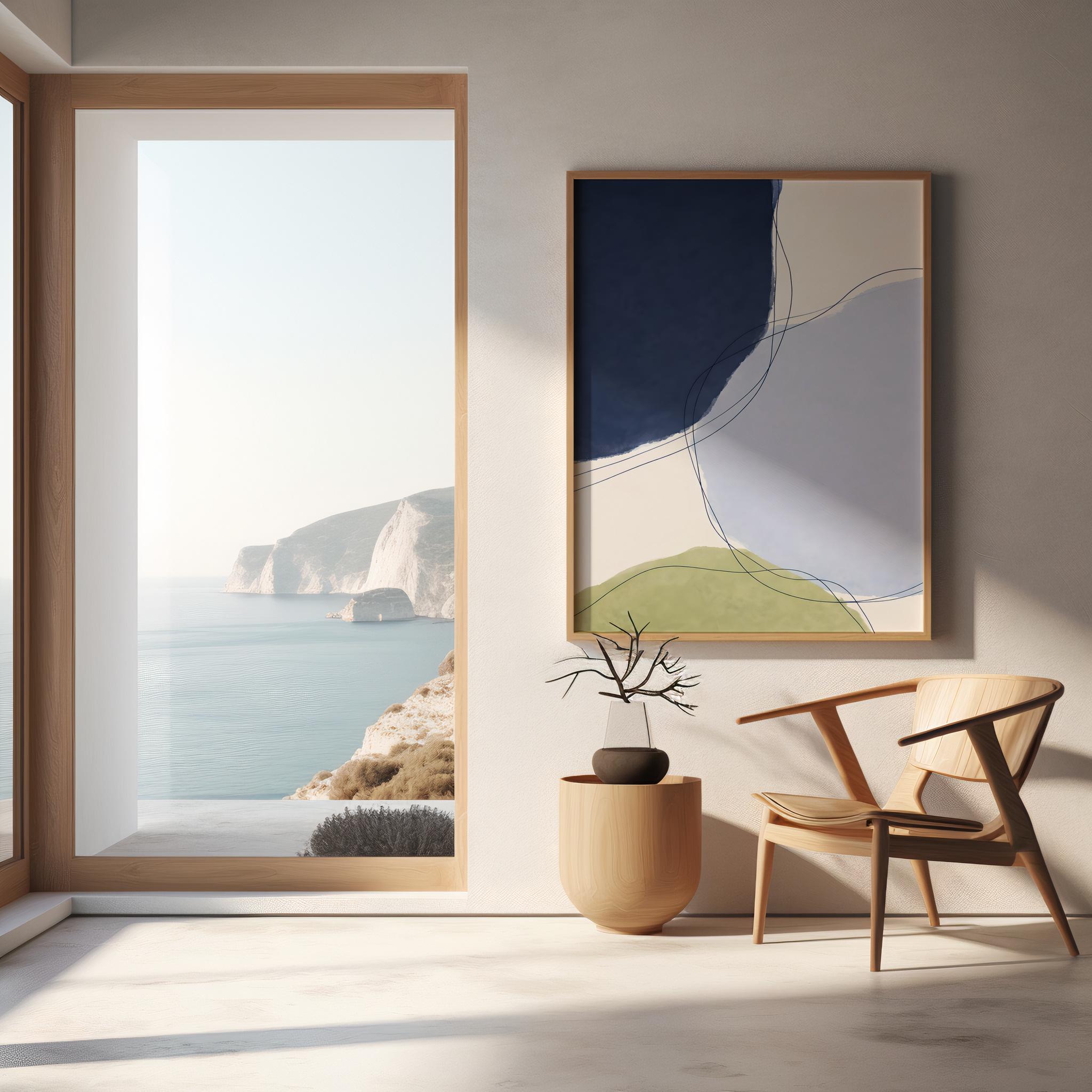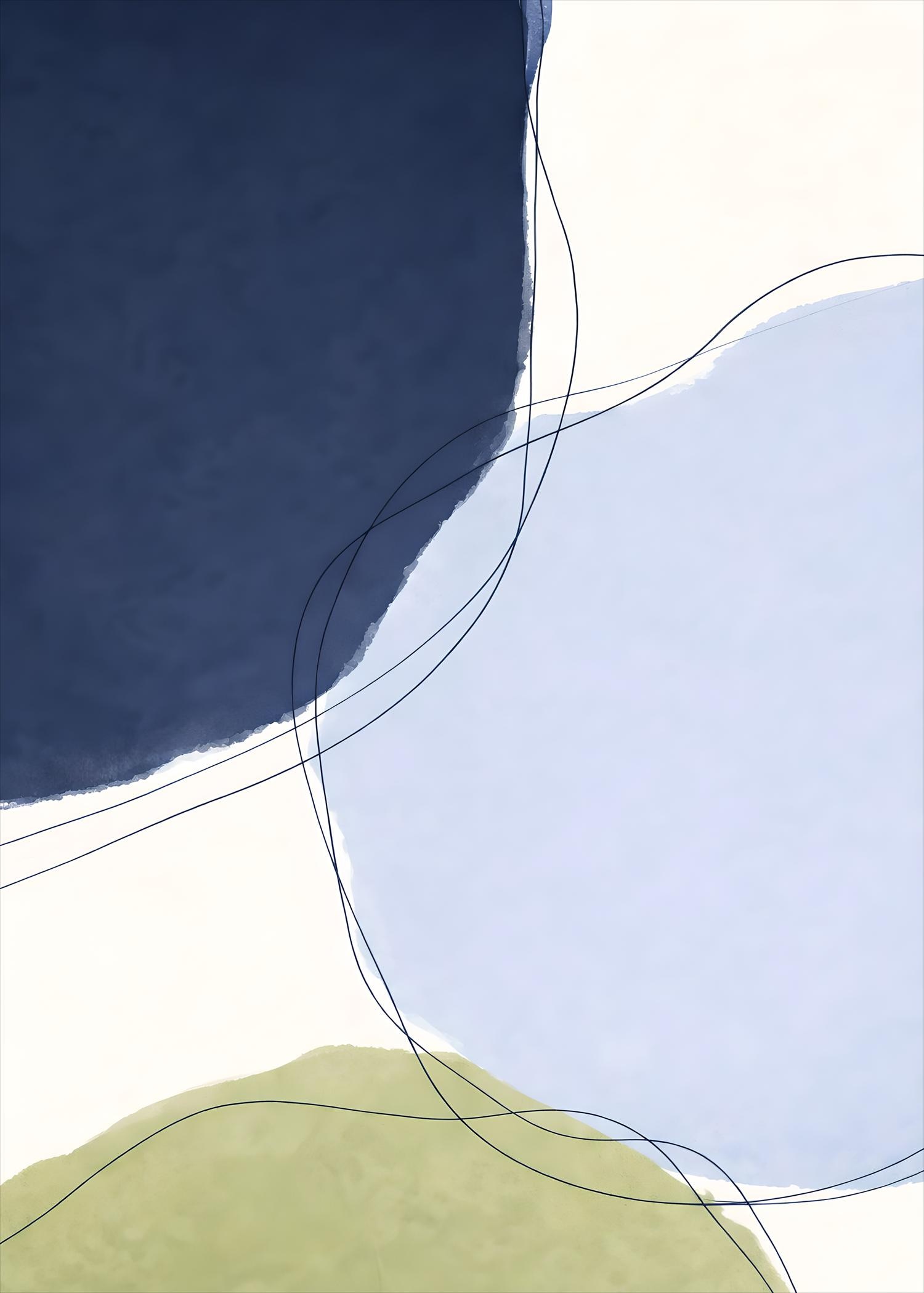A modern abstract artwork featuring deep navy blue, soft powder blue, warm off-white, and muted olive green tones. Layered organic shapes paired with flowing, delicate line work create a calm yet dynamic composition that feels balanced, contemporary, and refined. Designed to add depth and sophistication to modern, minimalist, and design-forward interiors.