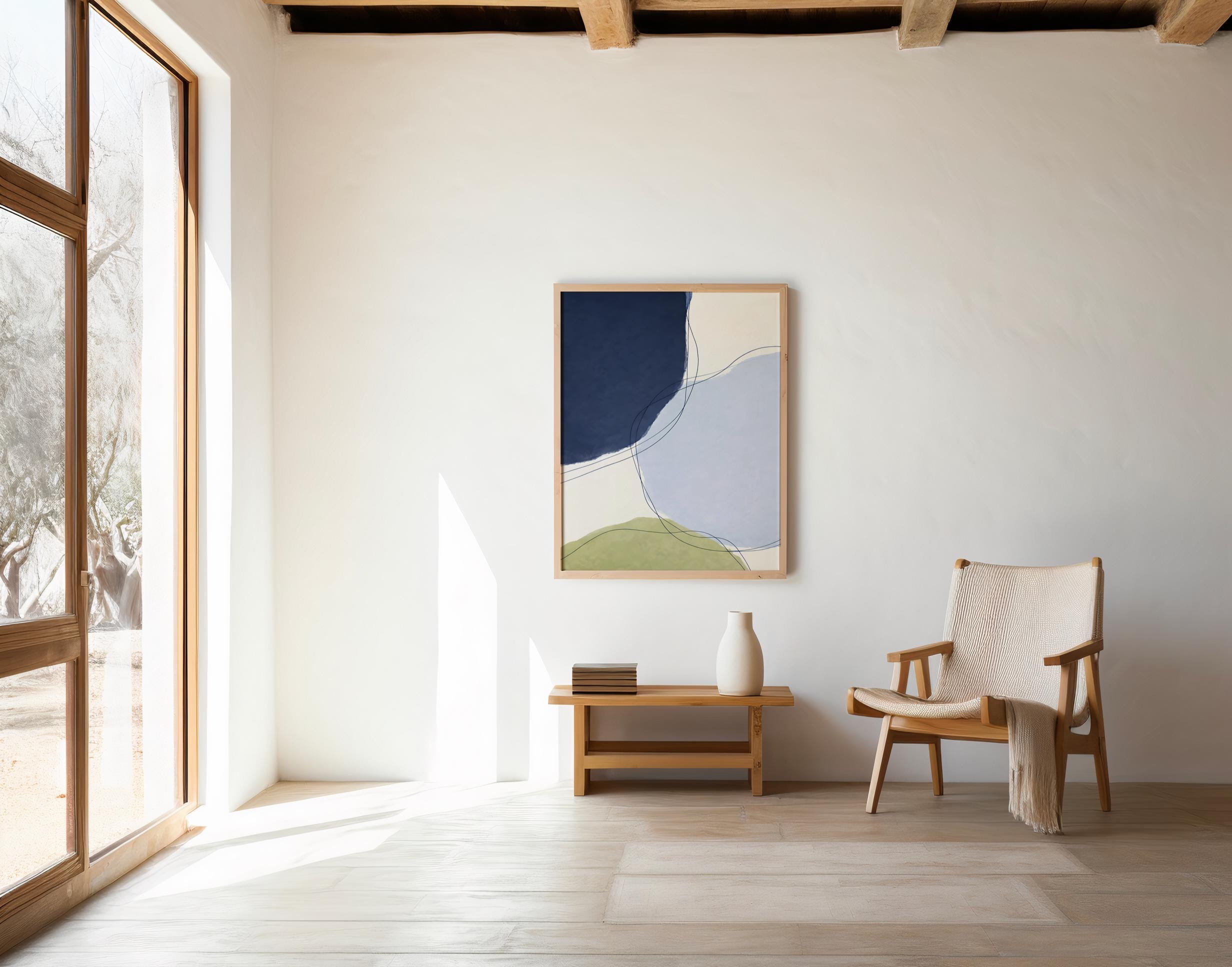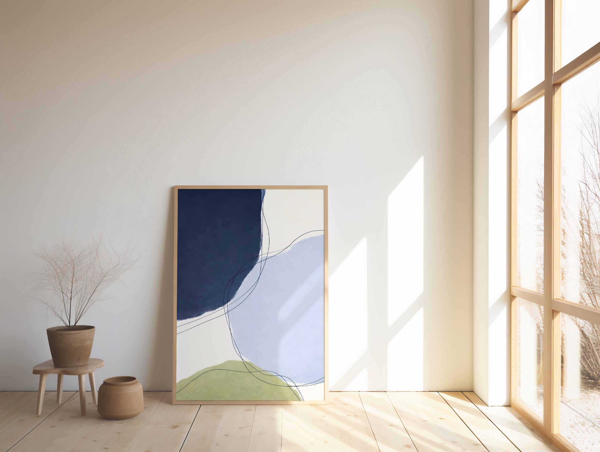 A modern abstract composition featuring deep navy blue, soft powder blue, warm off-white, and muted olive tones. Layered organic shapes combined with flowing, delicate line work create a calm yet dynamic piece that feels balanced, contemporary, and refined. Designed to add depth and sophistication to modern, minimalist, and design-forward interiors.