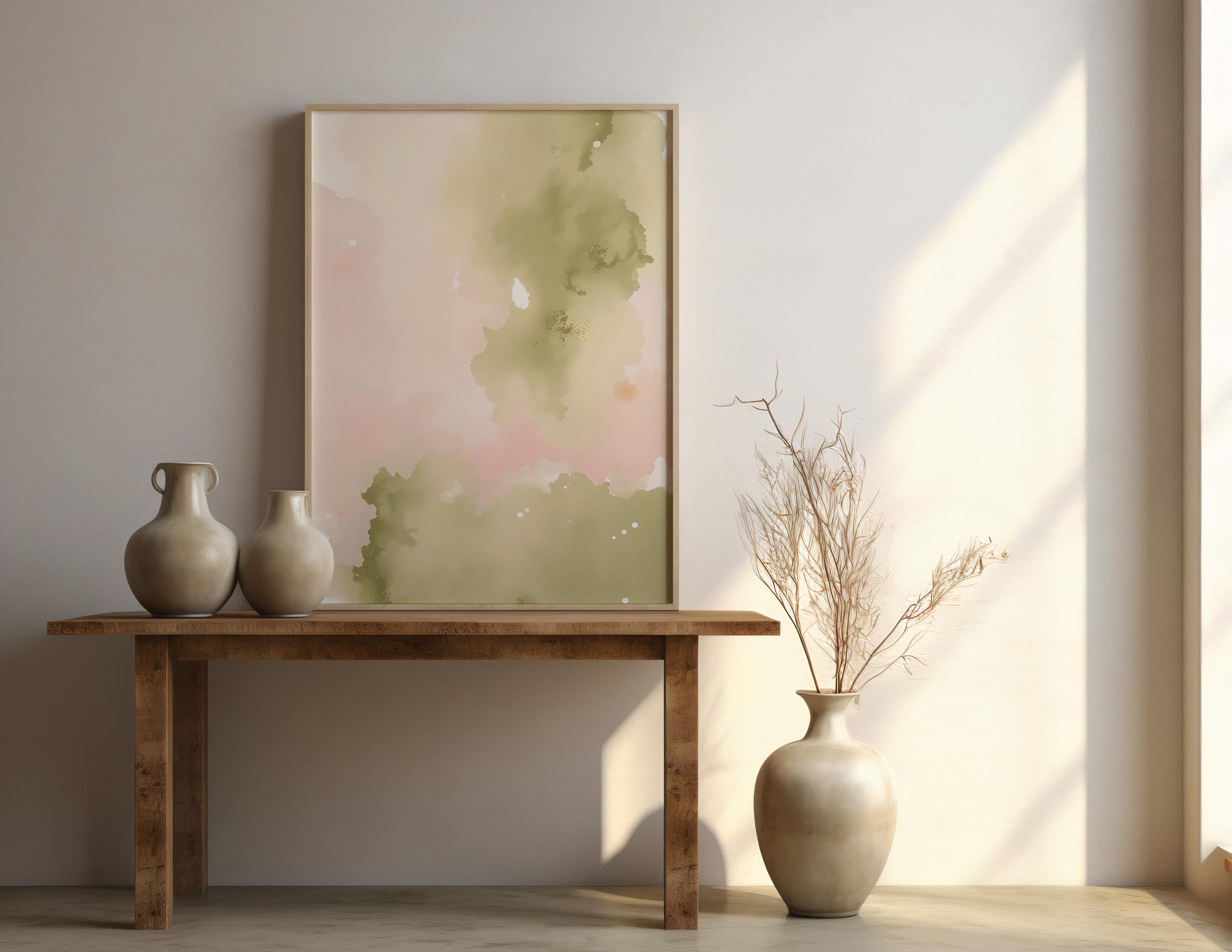 A calm, modern abstract artwork in soft sage green, warm blush, and creamy neutral tones. Designed to feel airy, refined, and timeless, this piece complements organic modern, minimalist, Japandi, and contemporary interiors.