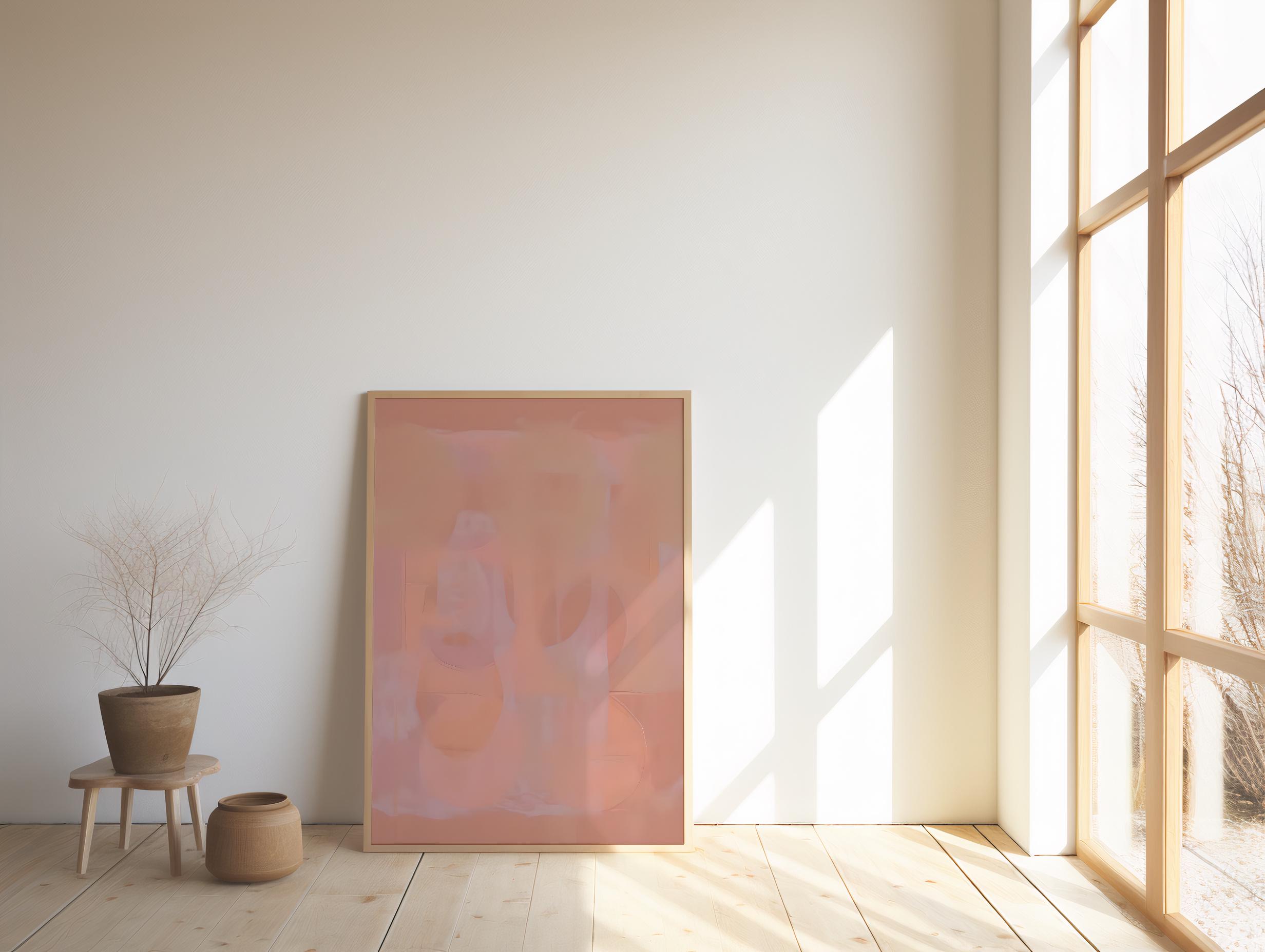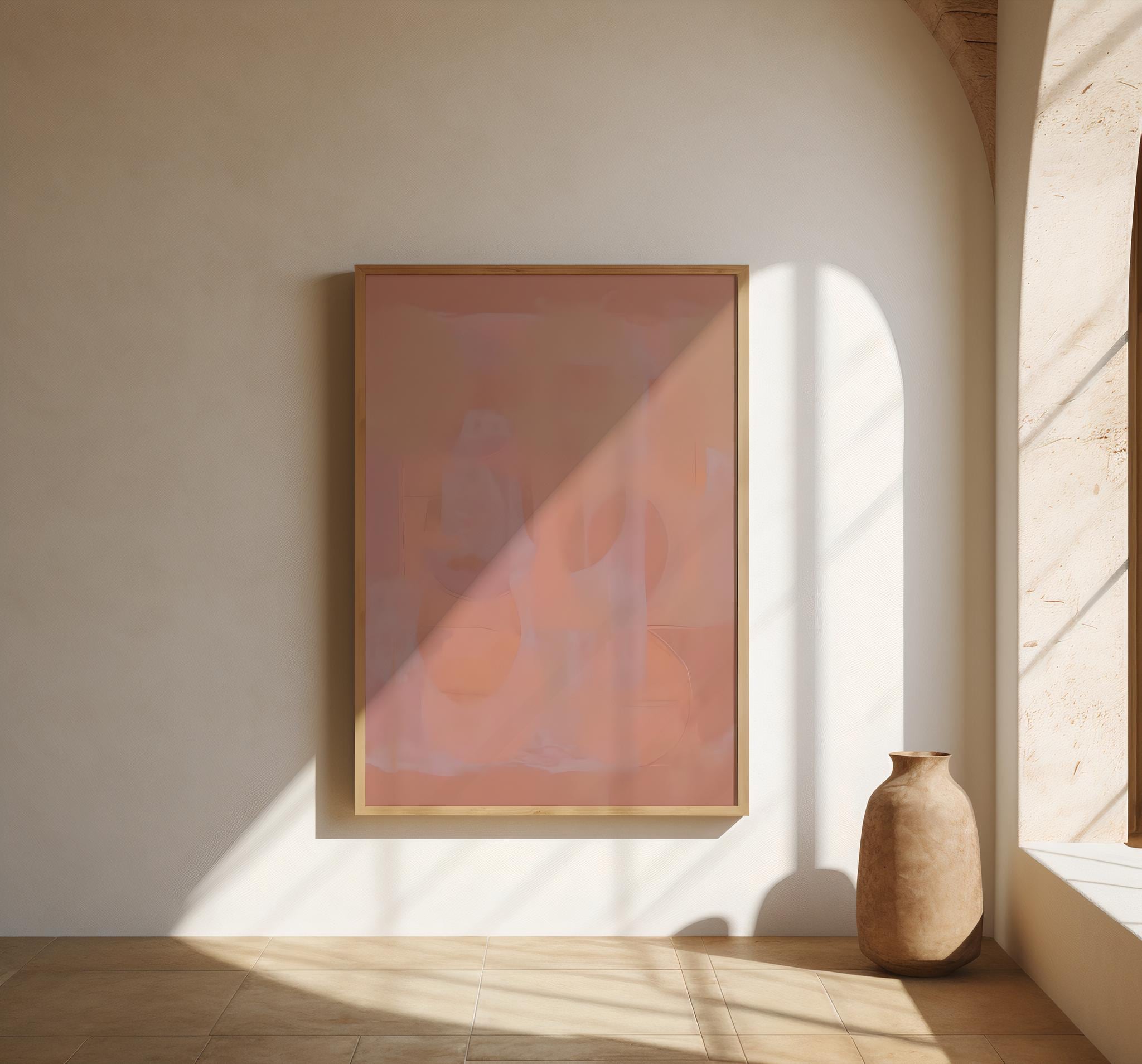 A modern abstract artwork featuring layered peach, clay, and warm blush tones with soft, flowing forms. The composition feels calm and atmospheric, designed to add warmth and subtle movement to contemporary interiors. The artwork mimics a painted texture, while the surface itself remains smooth and flat.