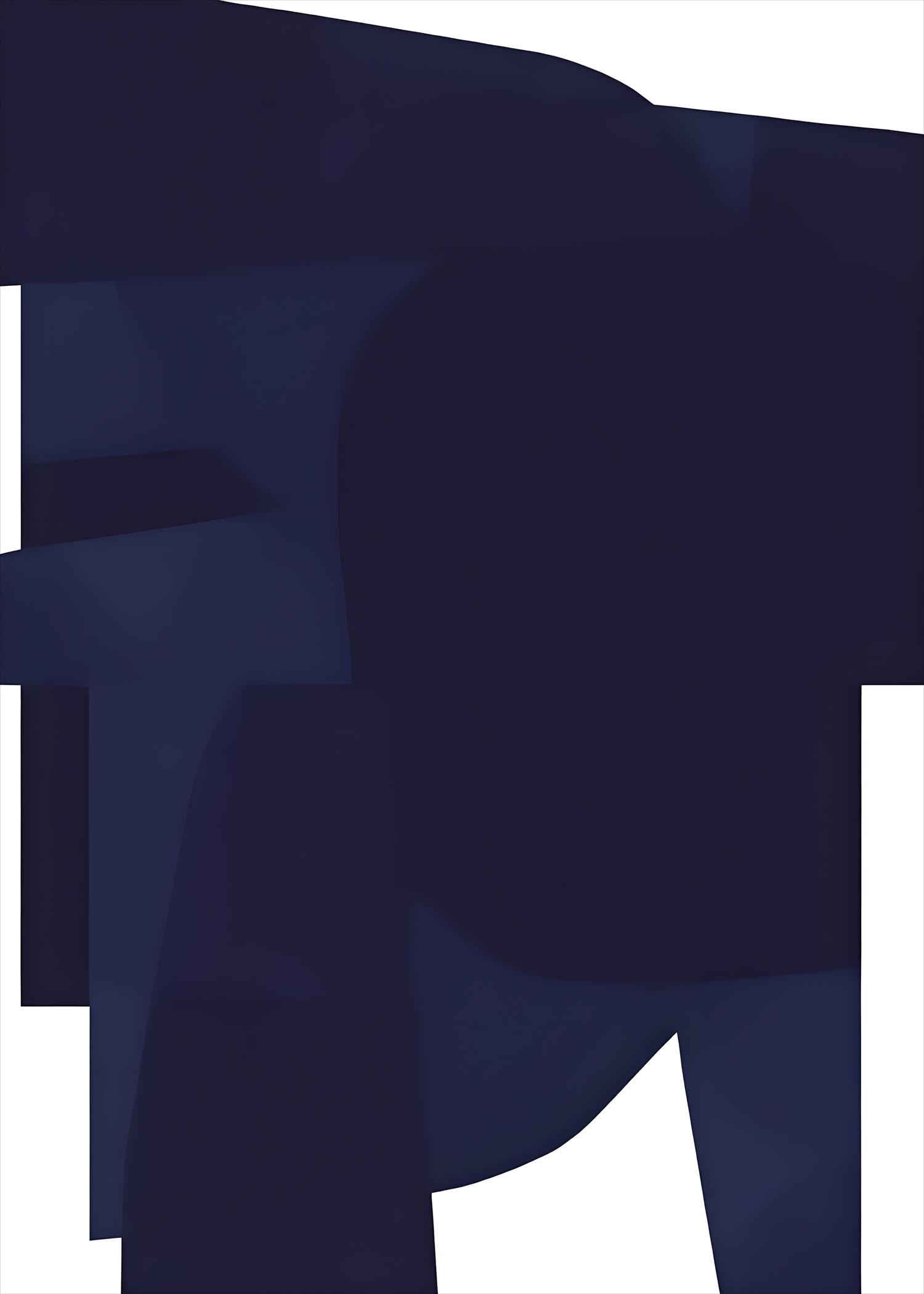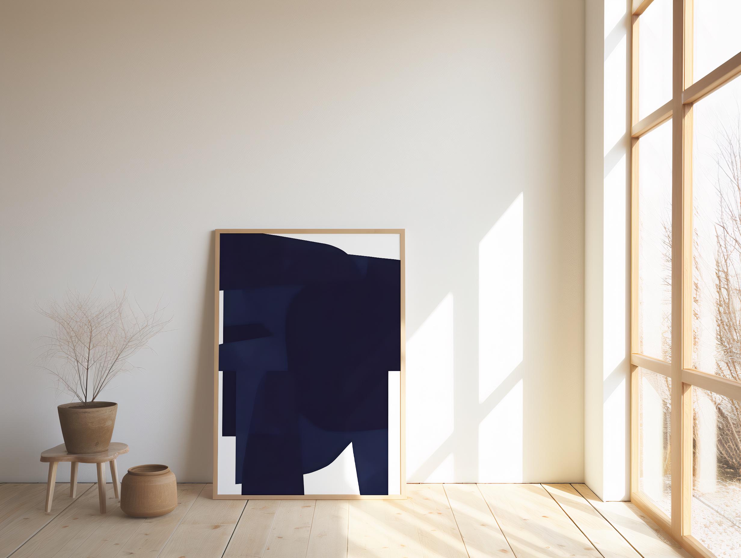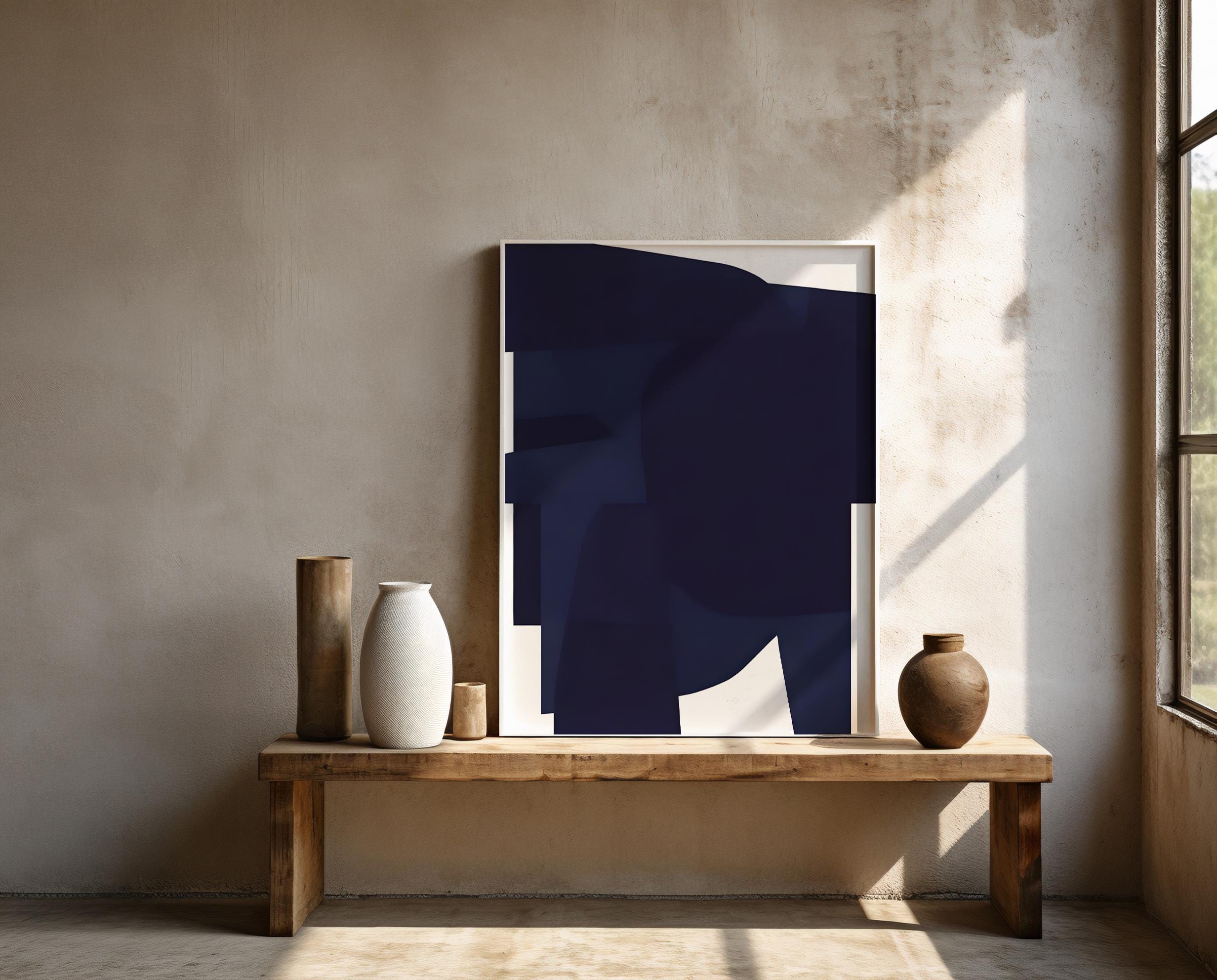 A bold, modern abstract artwork featuring deep navy and midnight blue tones with soft gradients and organic, sculptural shapes. The layered composition feels moody, refined, and architectural—designed for contemporary, minimalist, and modern interiors that favor depth and contrast.