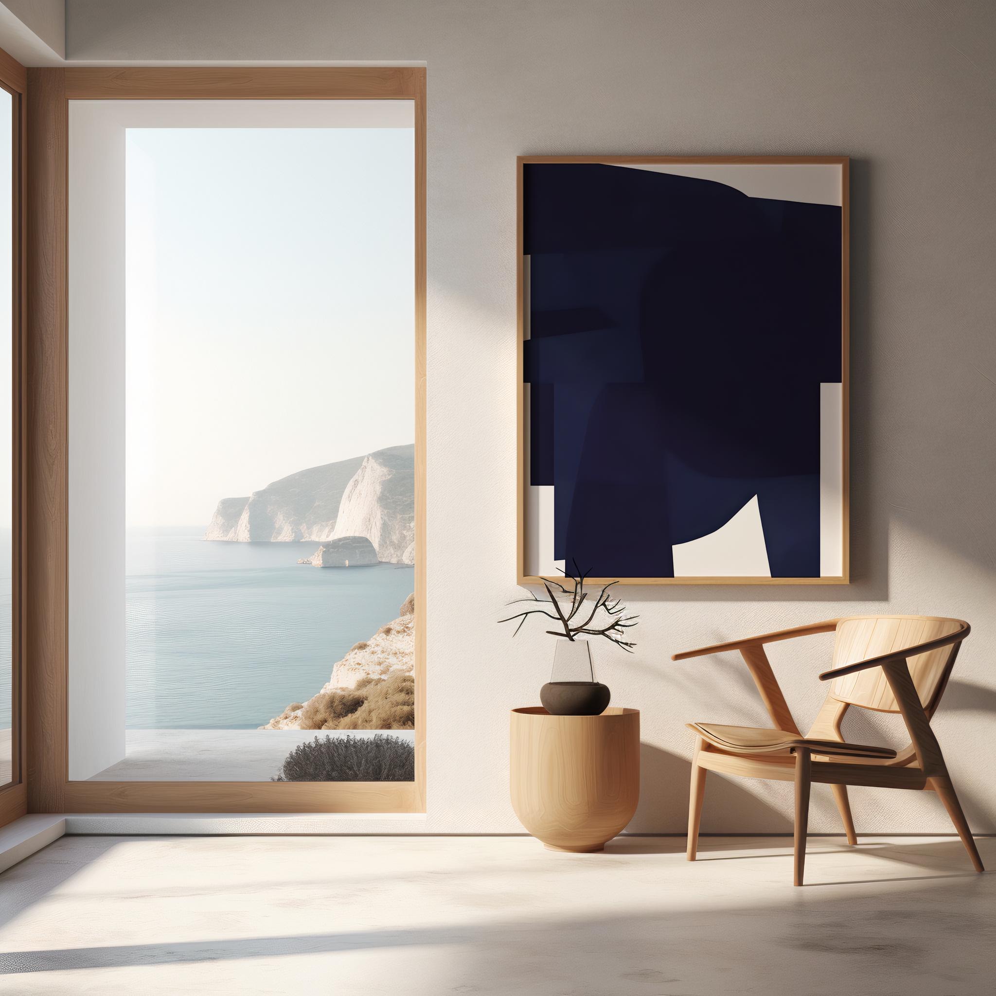 A bold, modern abstract artwork featuring deep navy and midnight blue tones layered with soft gradients and organic, sculptural forms. The moody palette and architectural flow create a refined statement piece for contemporary, minimalist, and design-forward interiors.