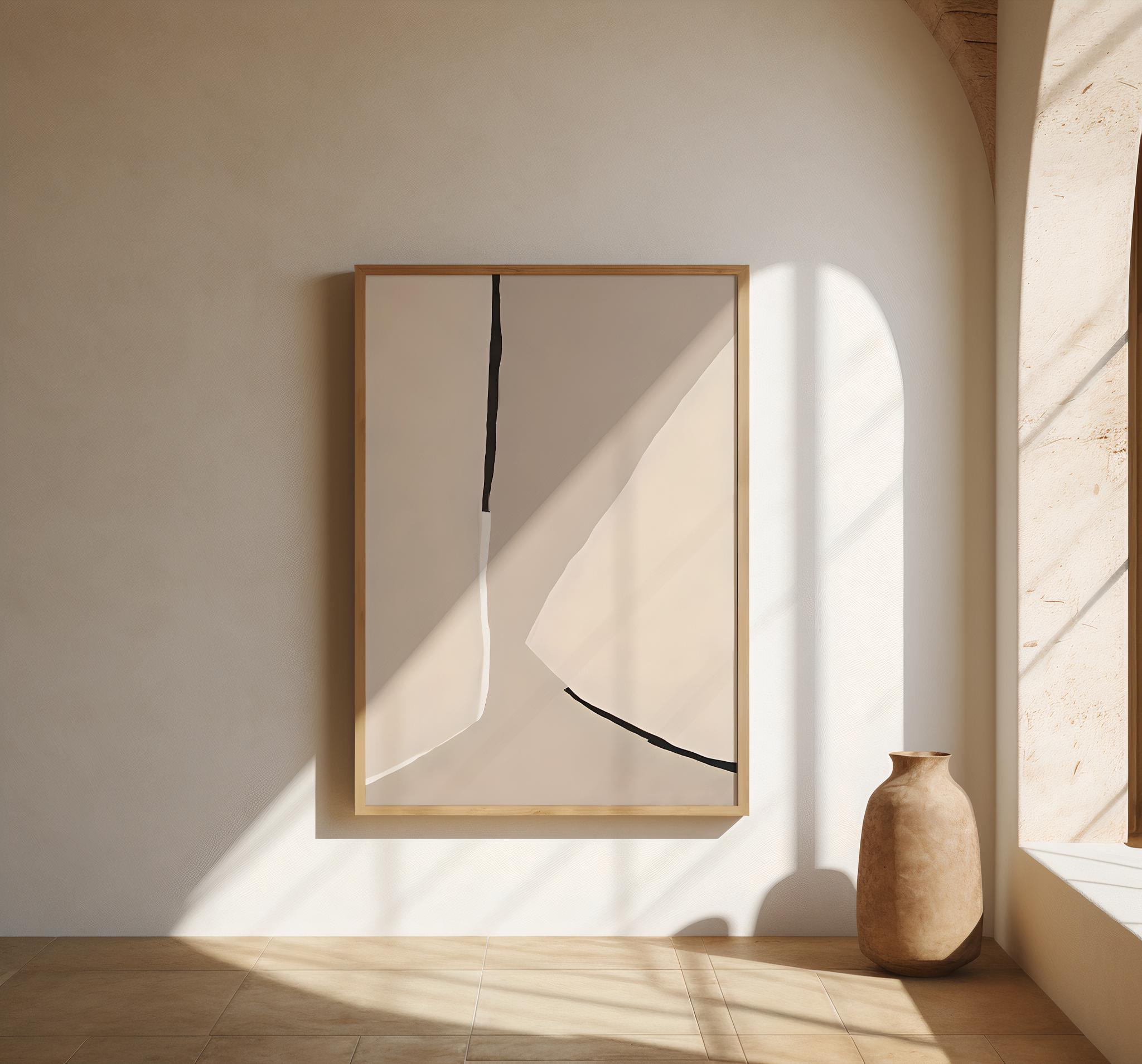 This is a digital download of a modern minimalist abstract artwork featuring soft beige and cream tones with bold black linear accents. Clean, organic shapes and subtle contrast give this piece a refined, architectural feel—perfect for elevated, design-forward interiors.